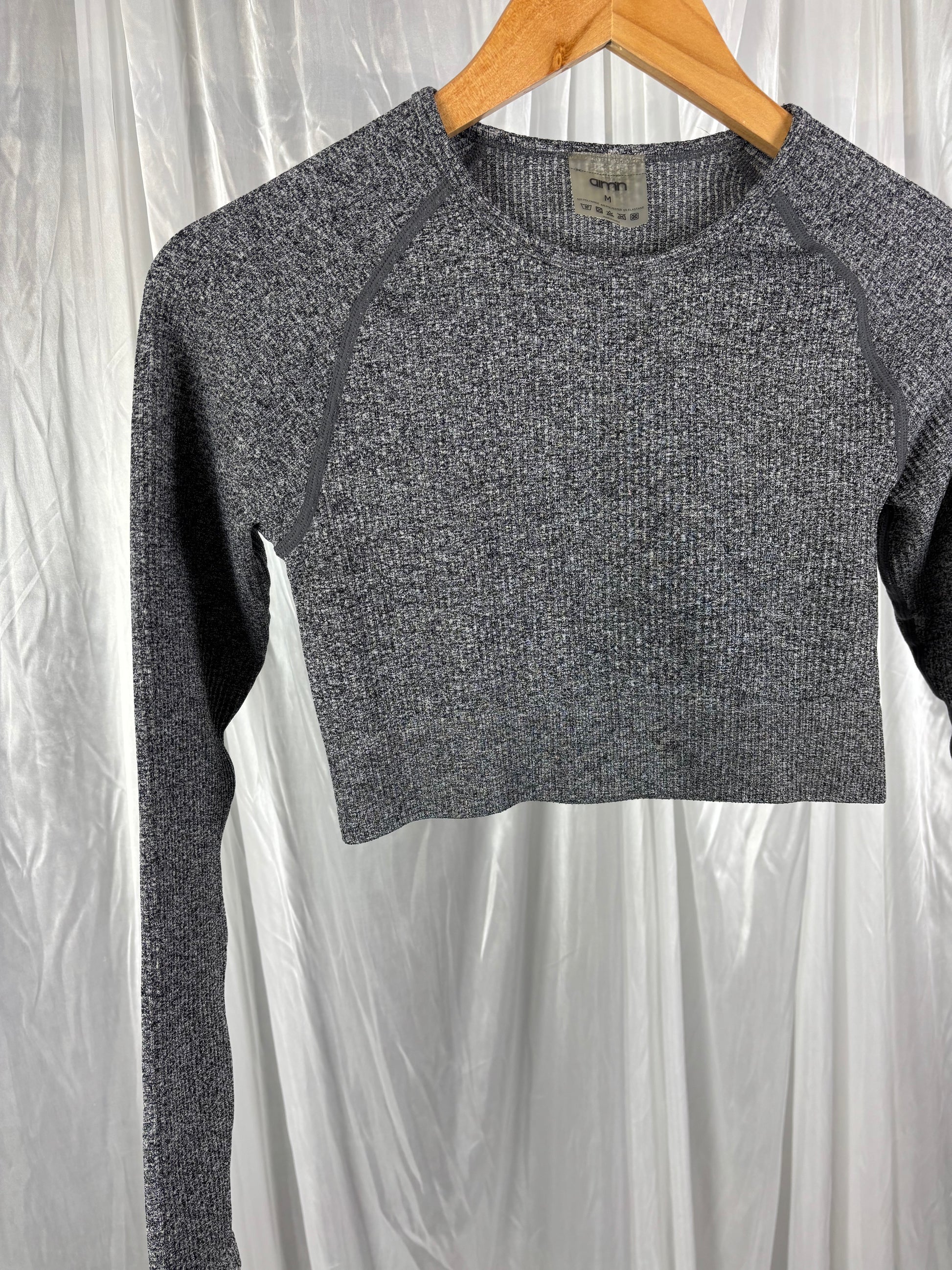 Description - Aimn grey crop long sleeve top, stretchy ribbed material. 55% polyamide, 40% polyester, 5% elastane