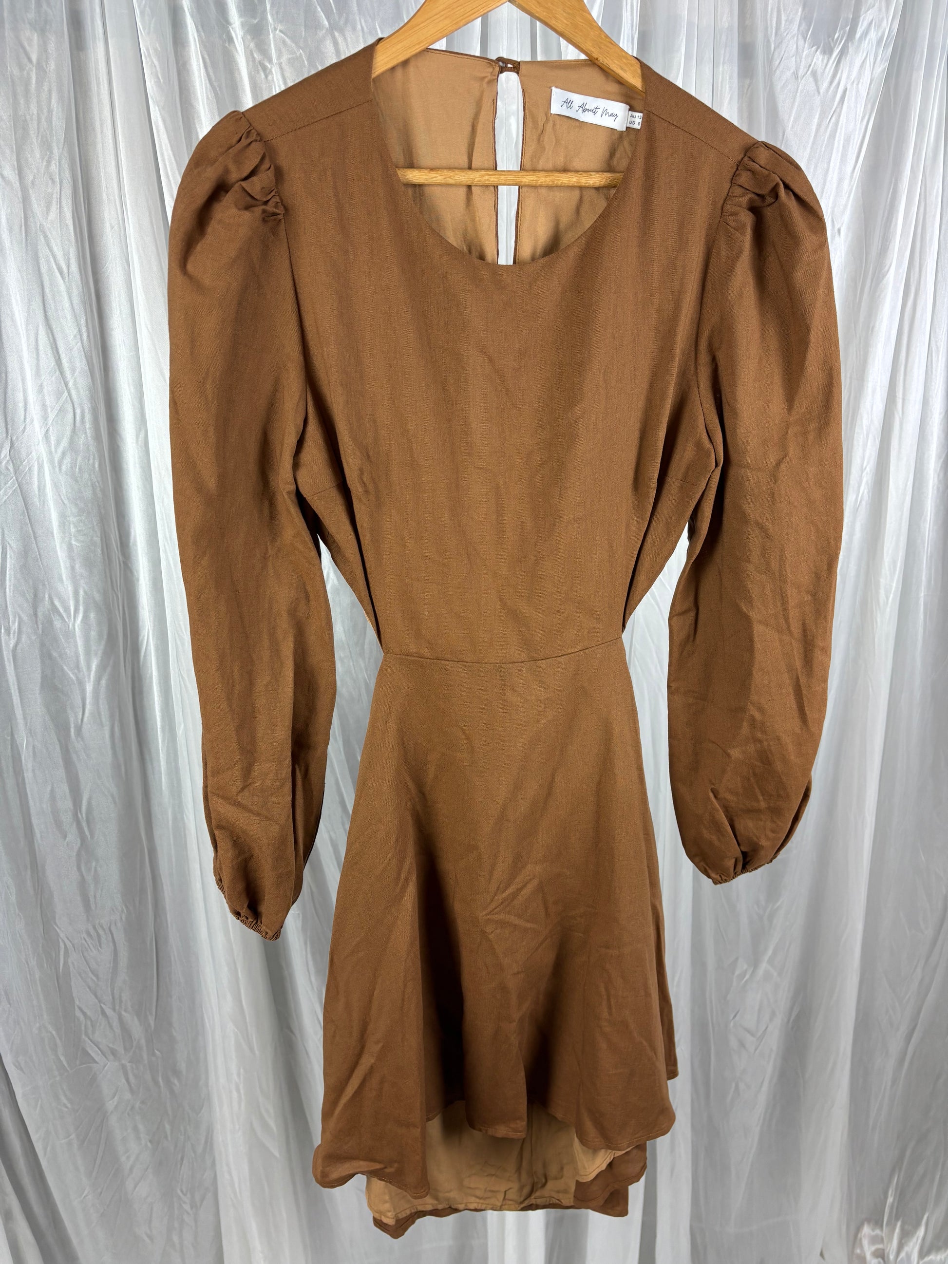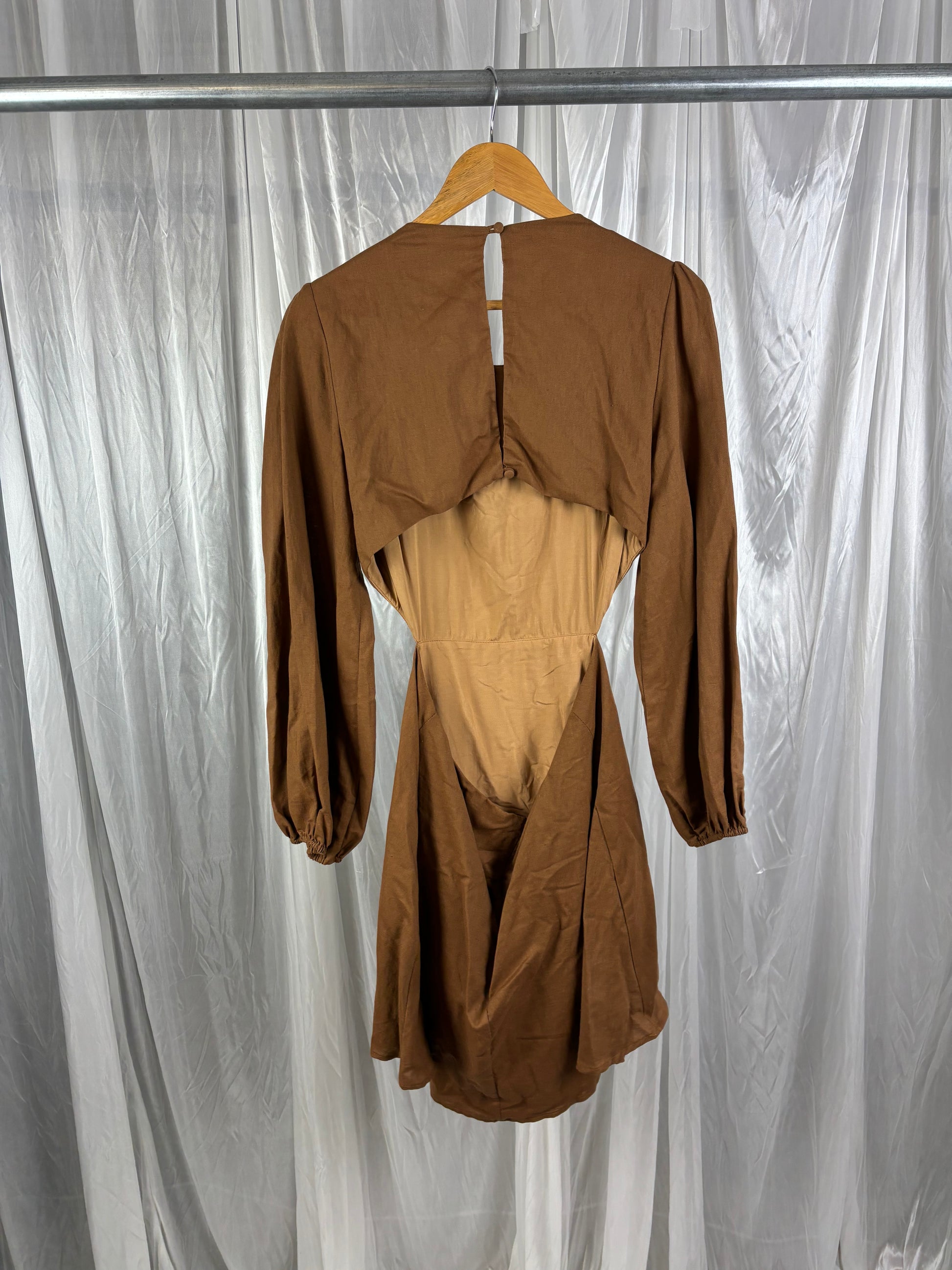 Description - Brown long sleeve open back mini dress, fully lined. 45% cotton, 55% linen