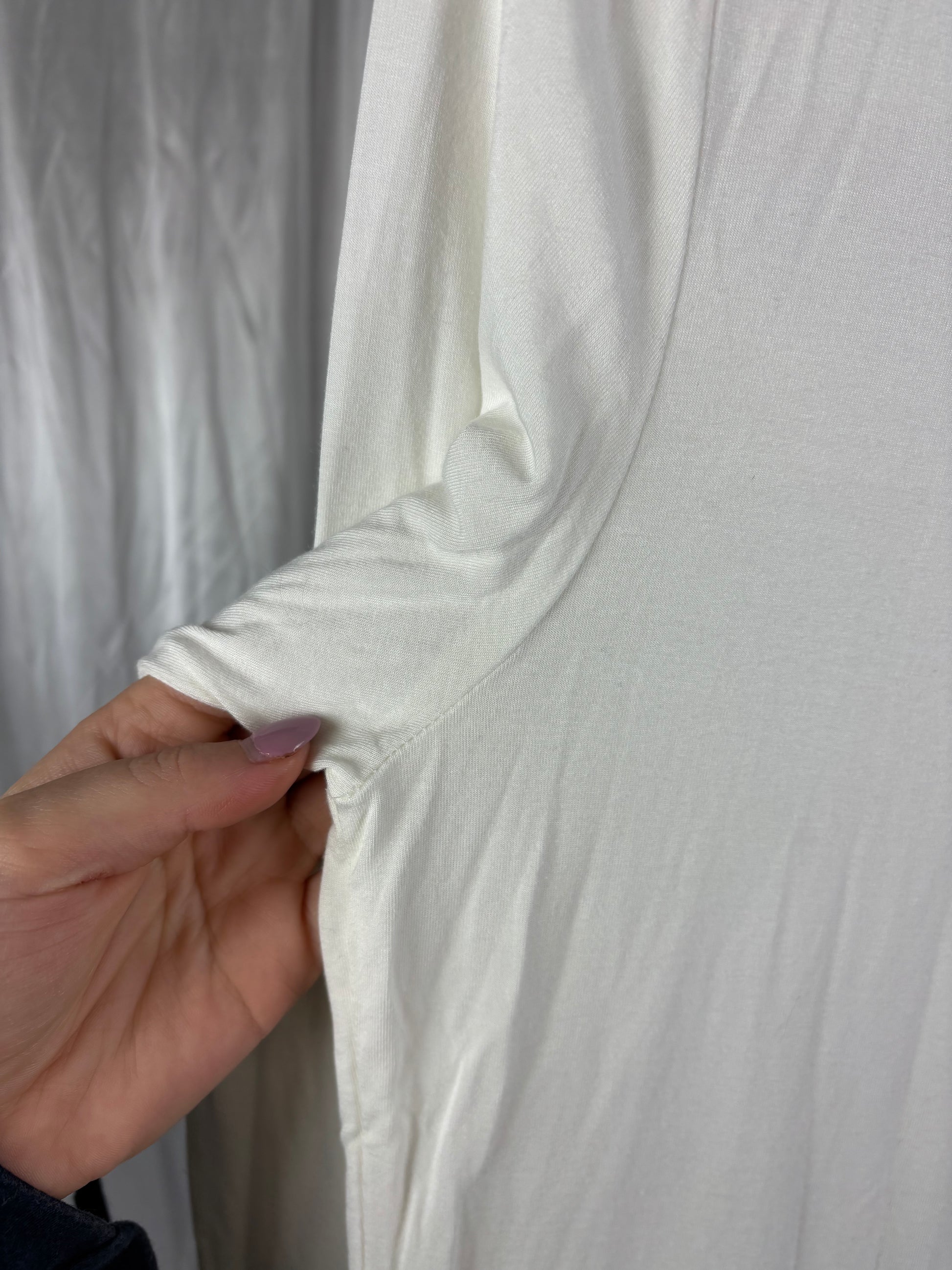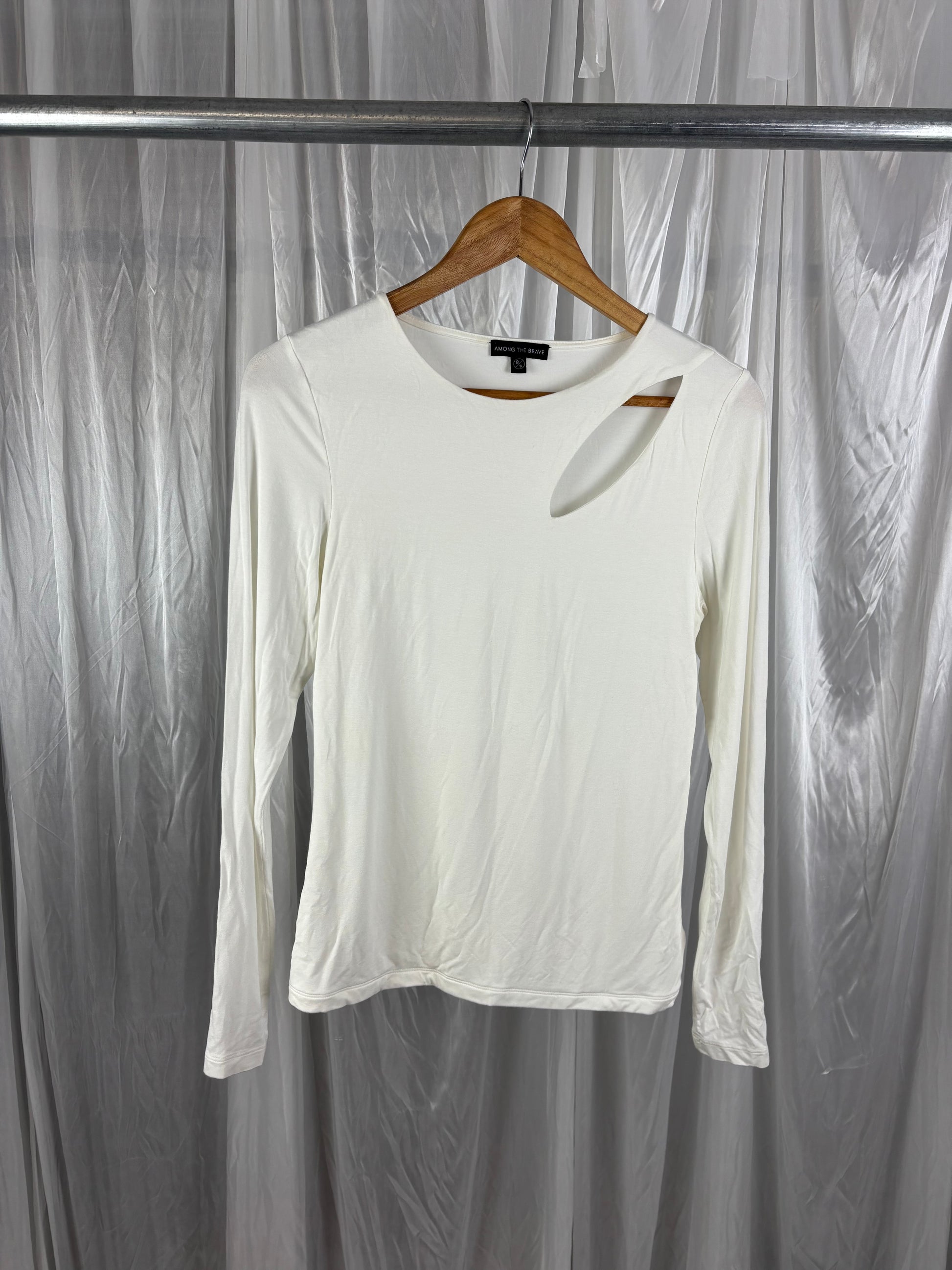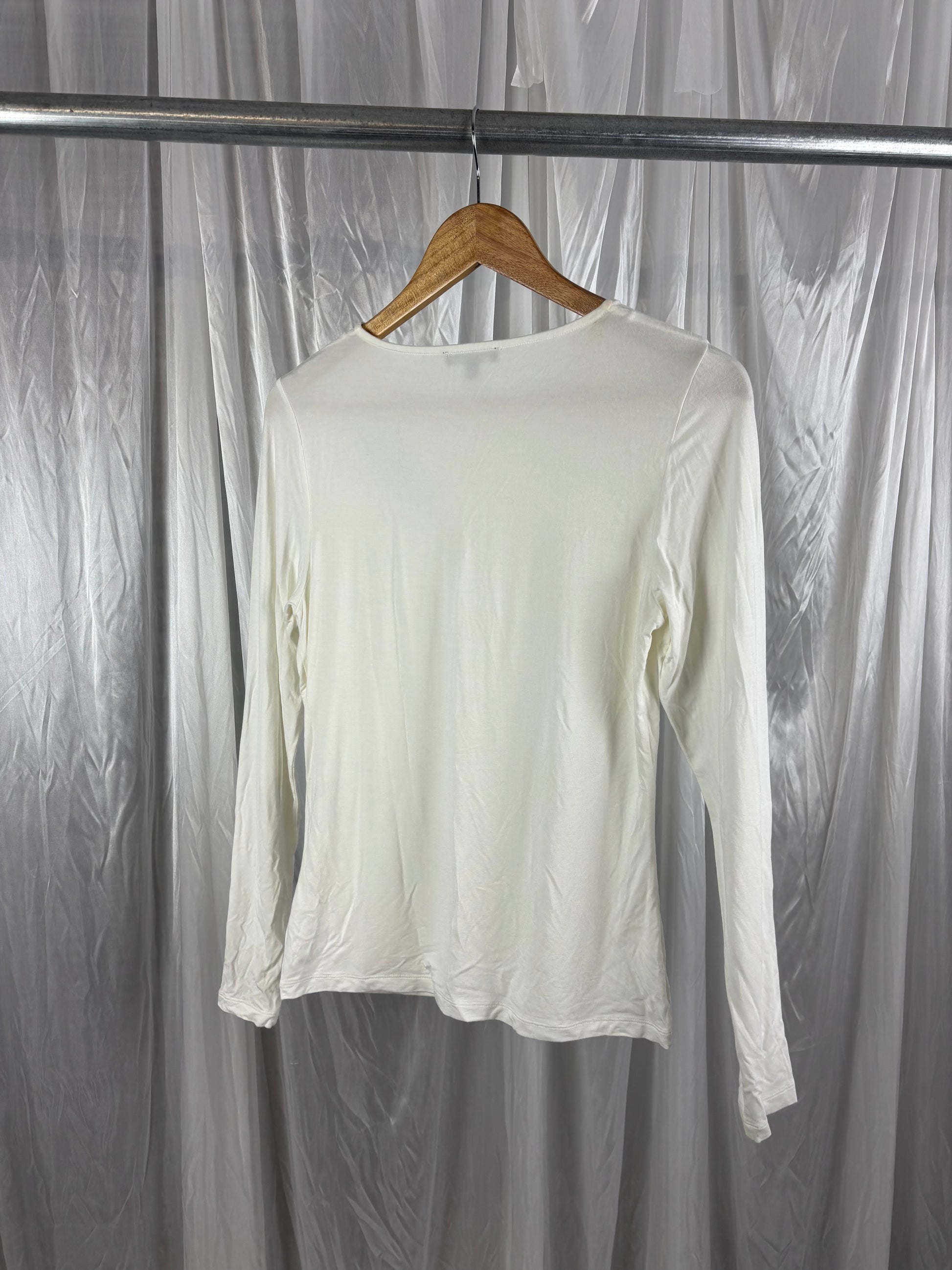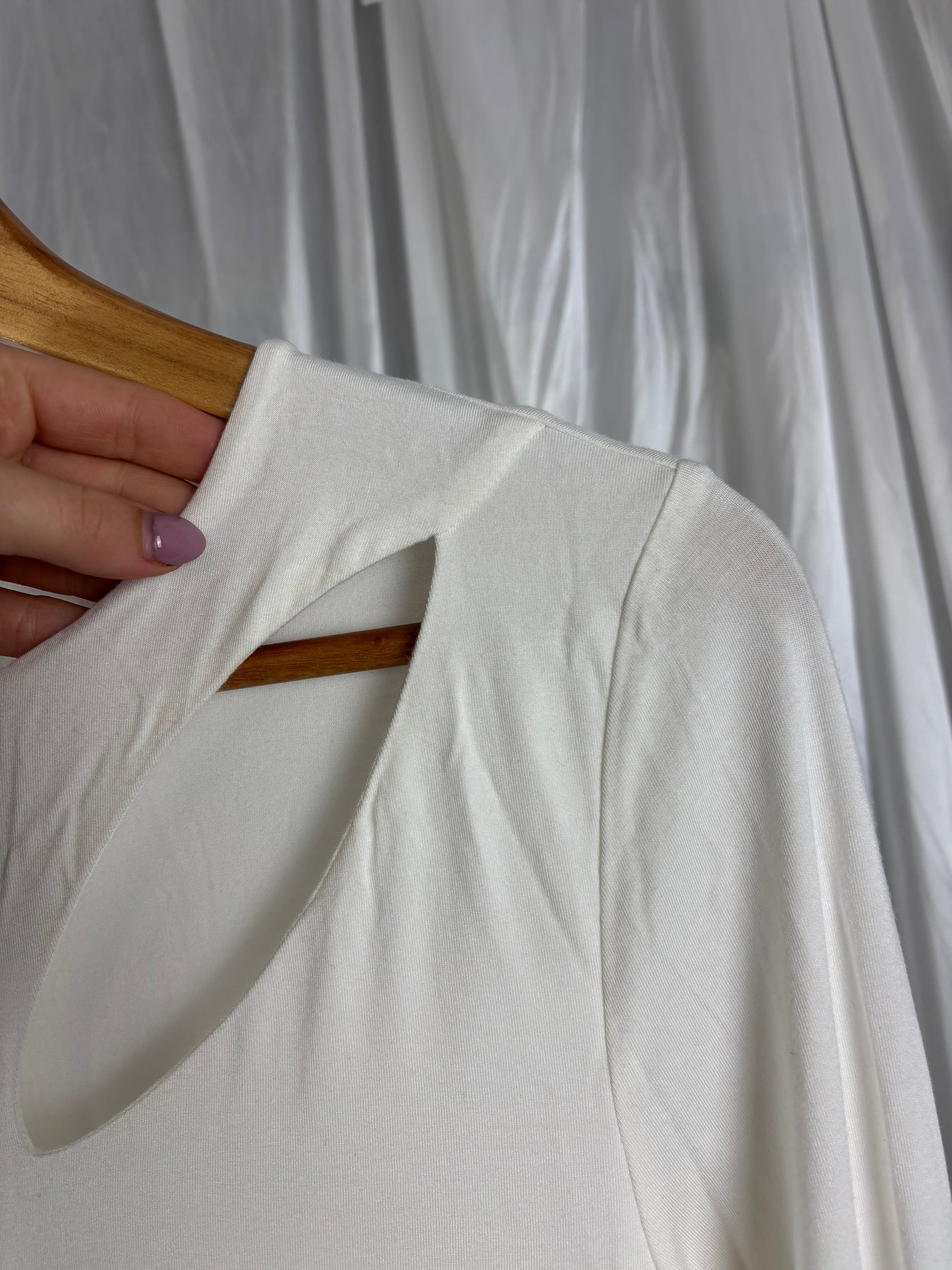 Description - White soft long sleeve top with a neck cut out, unfortunately there is some faint discoloration in areas. 94% viscose, 6% elastane