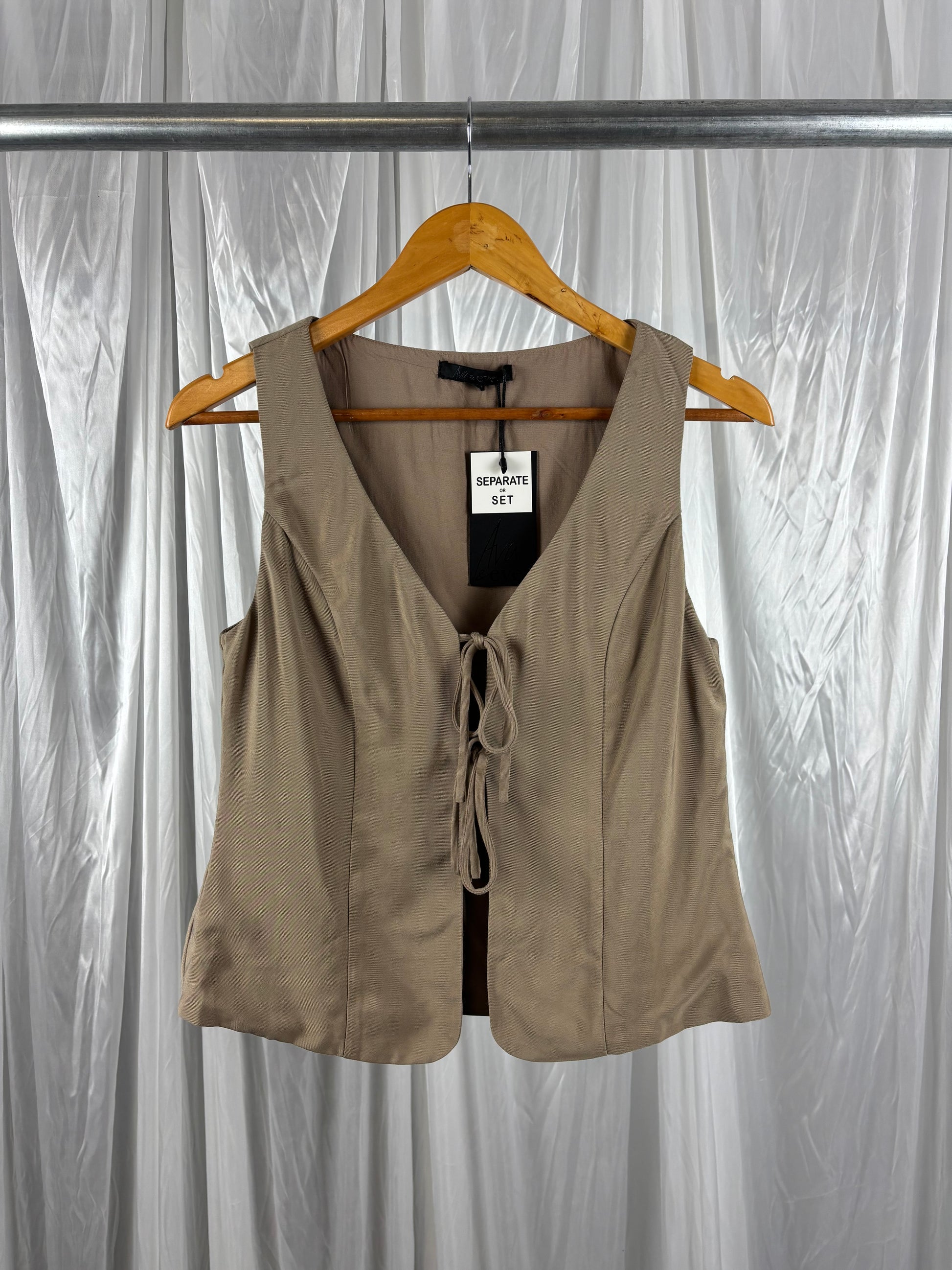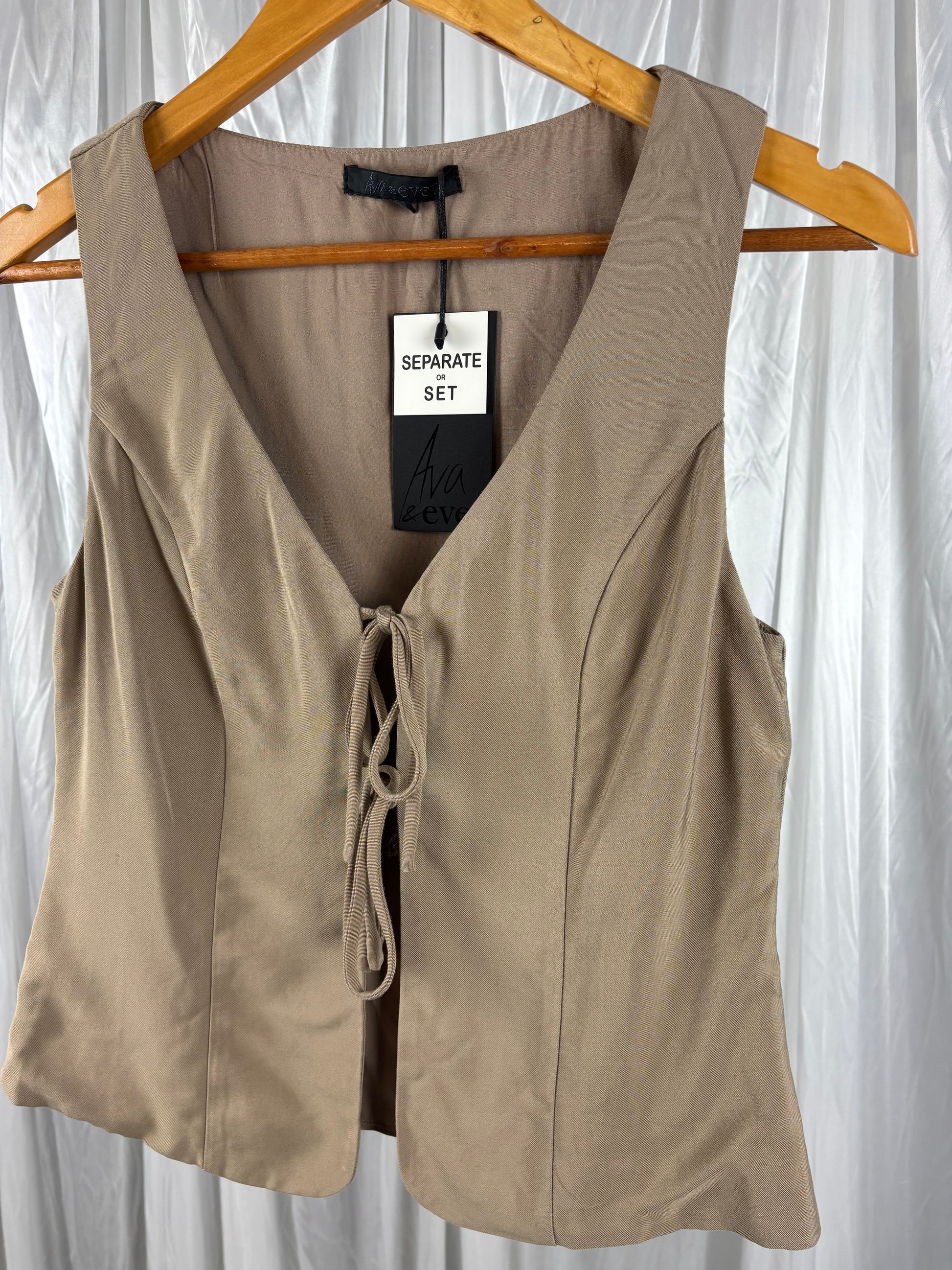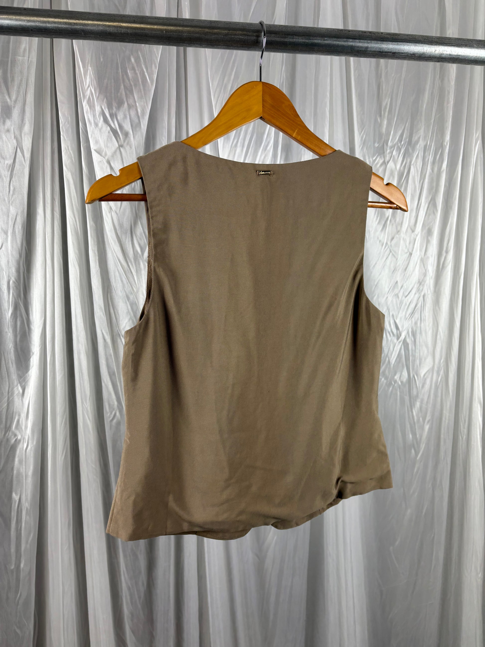 Description - Brown tie front sleeveless top, shell 50% viscose, 50% rayon, lining $100% Rayon. Brand new with tags