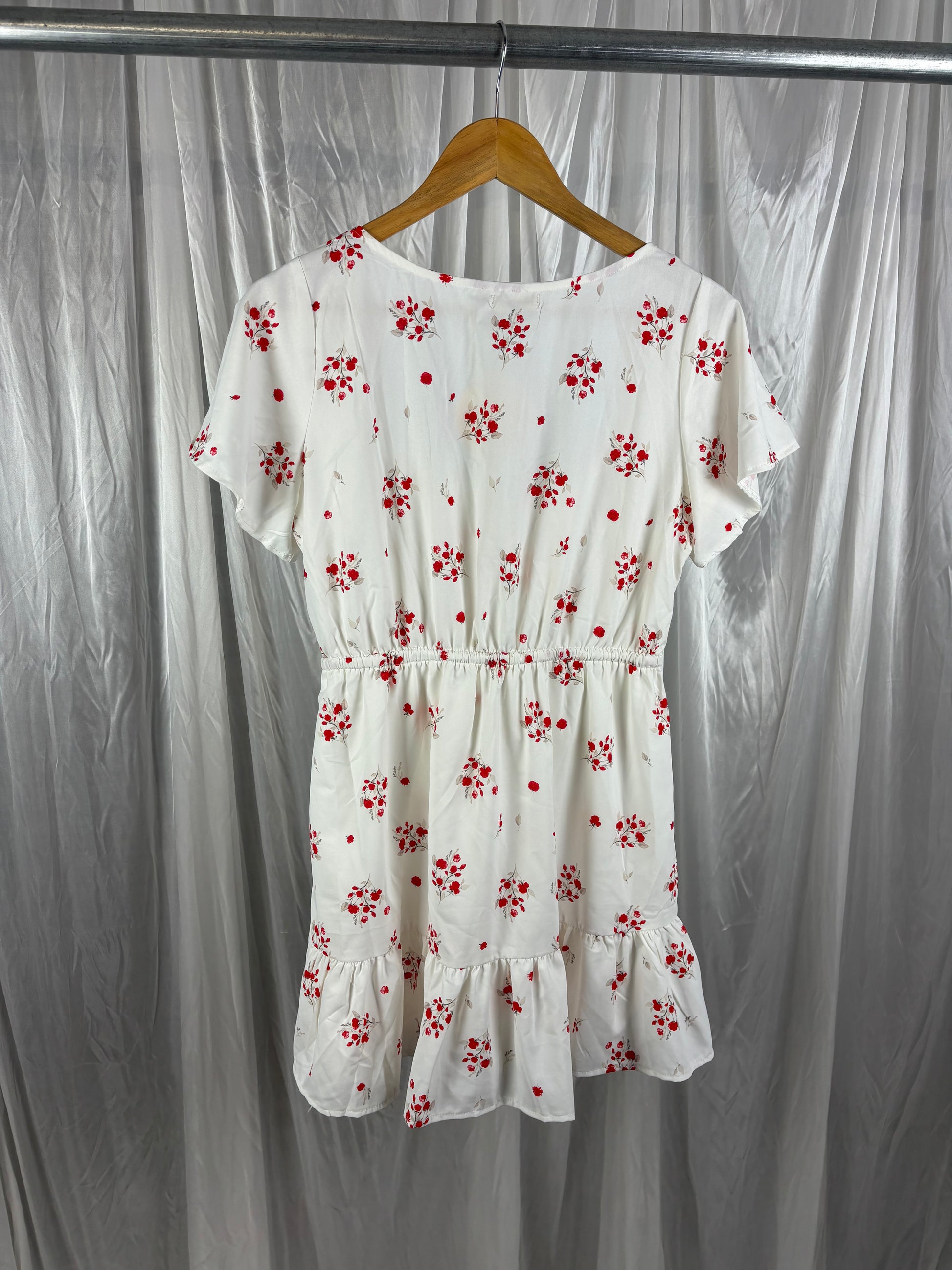 Description - White and red floral mini dress with dainty little toe at the front, 100% polyester. brand new with tags!