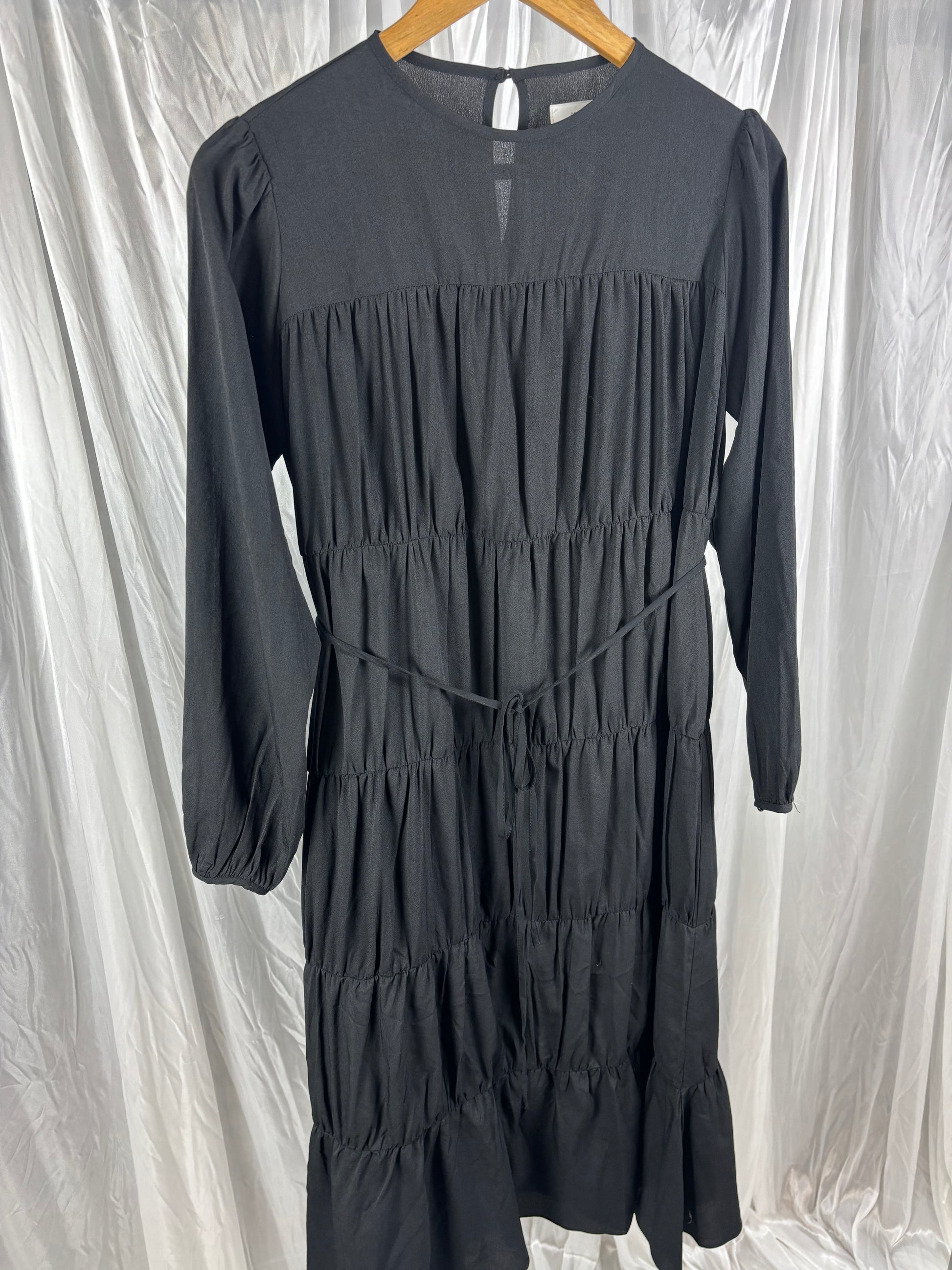 Description - Black light weight tiered long sleeve midi dress, comes with a removable string waist tie