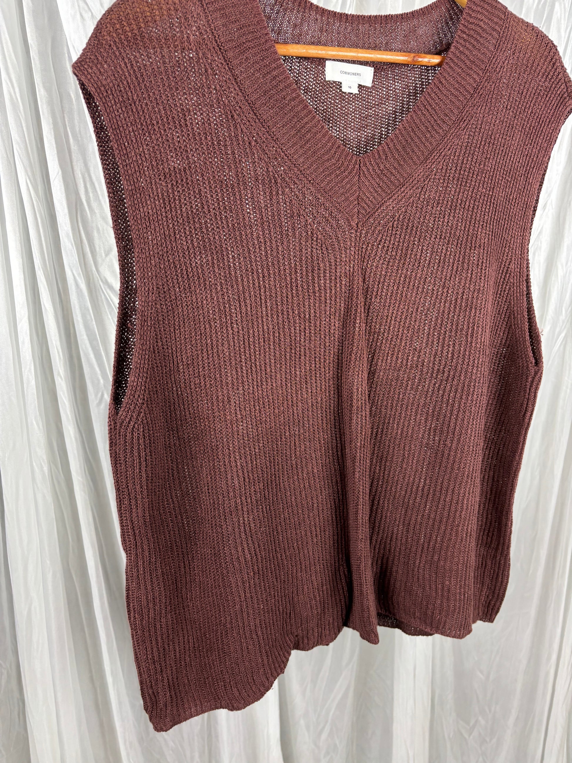 Description - Dark brown v-neck knit vest. In preloved condition has some minor pulls and has slightly stiffer material due to wear/wash