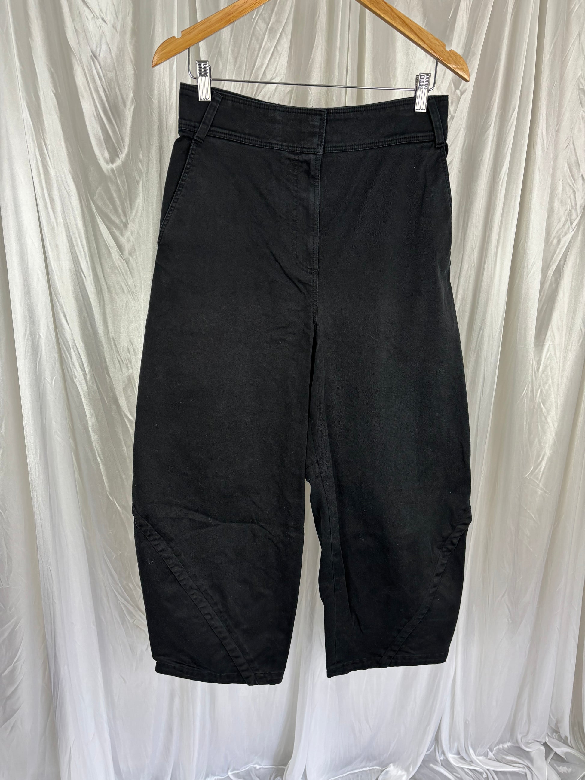 Description - Black barrel style pants, 98% cotton, 2% elastane