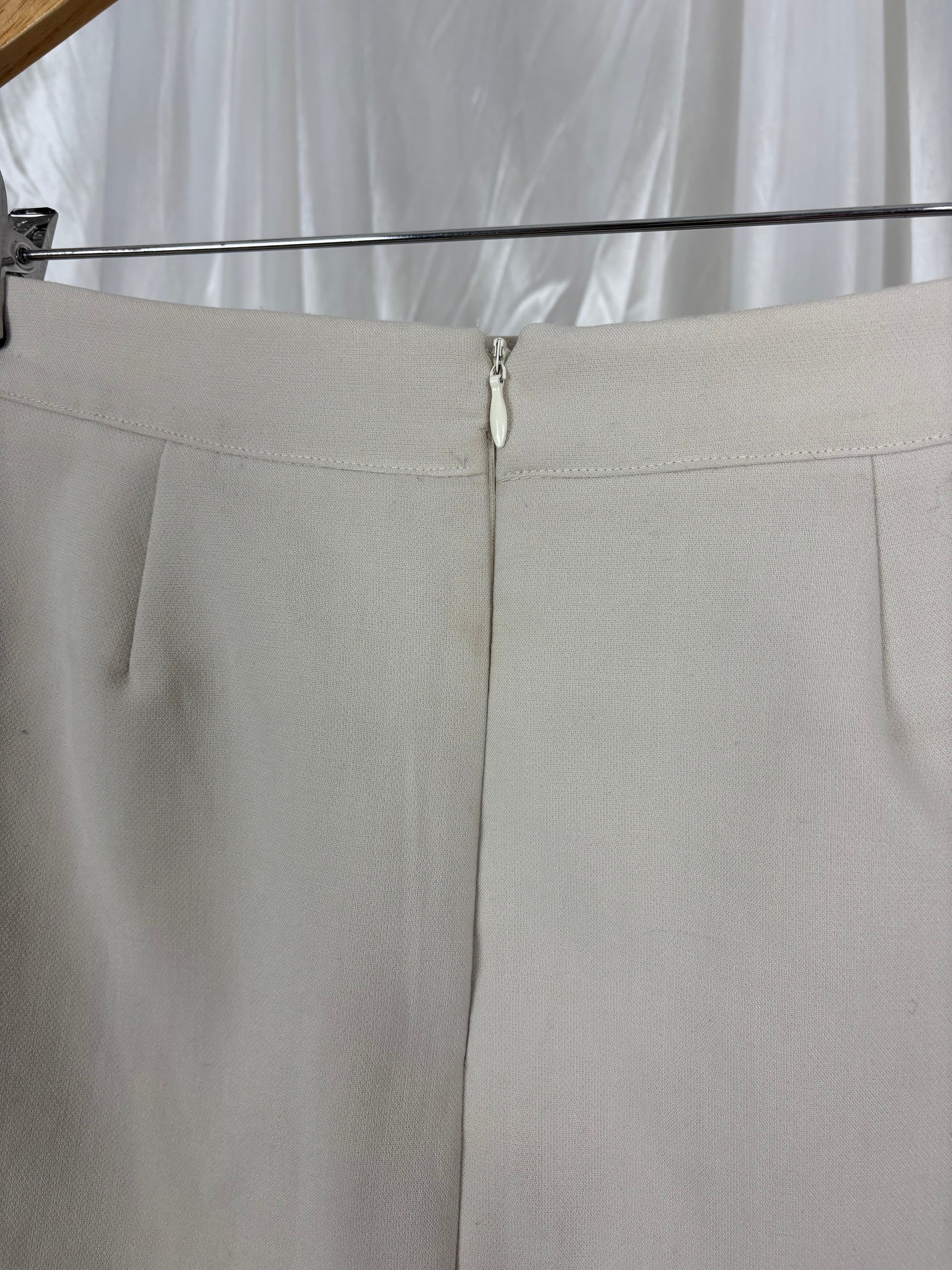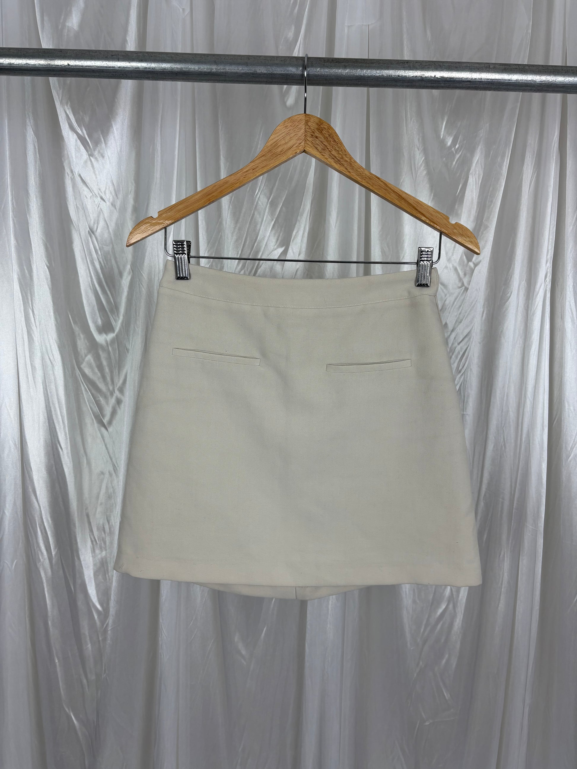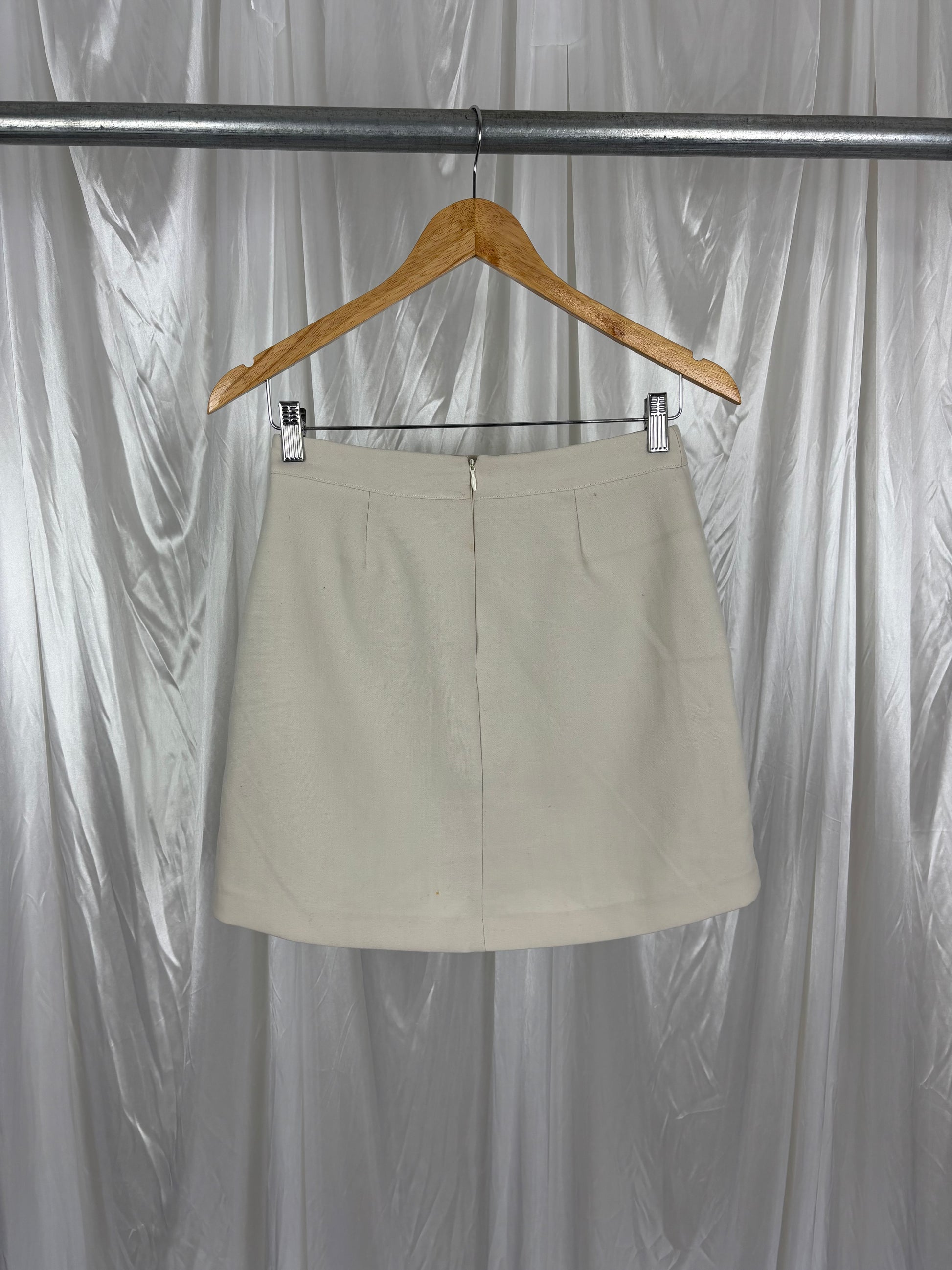 Description - Beige mini skirt with fake pockets and a zipper back, has some small pulls at the hem as well as small faint marks on the back