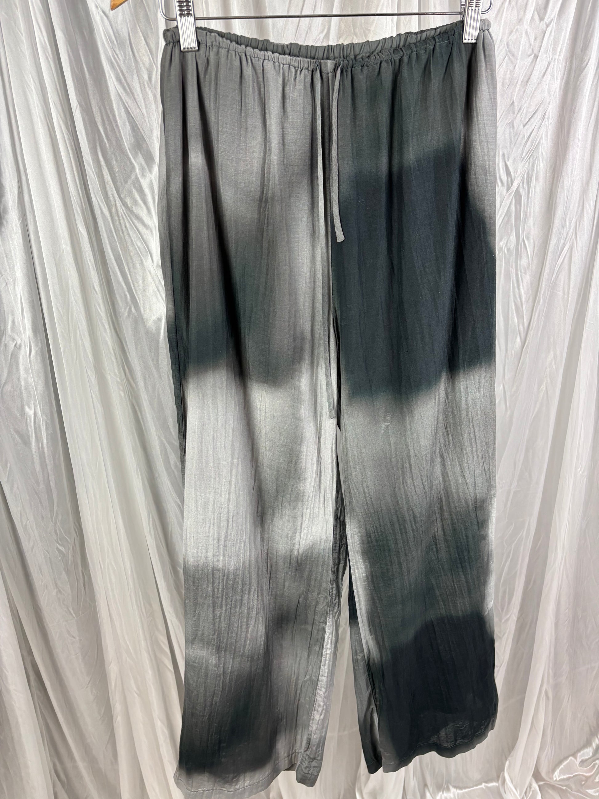 Description - Stunning smokey look loose pants with an elasticated drawstring waist & fully lined! Shell 30% silk, 70% cotton, lining 100% cotton. Has some small flaws to the material
