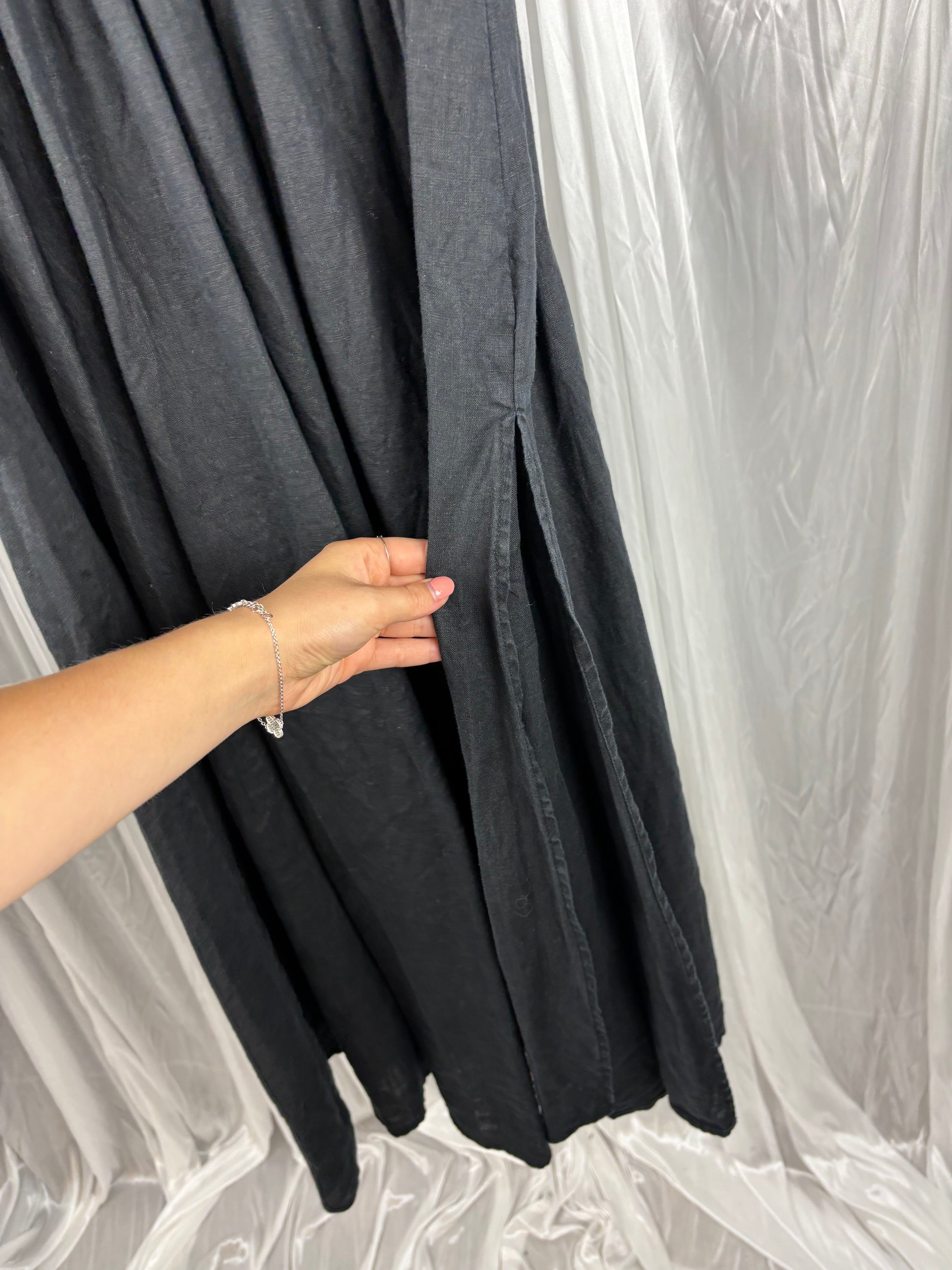 Description - Black linen skirt with elastic waist and side slit, 100% linen. Slight wash fade to the material