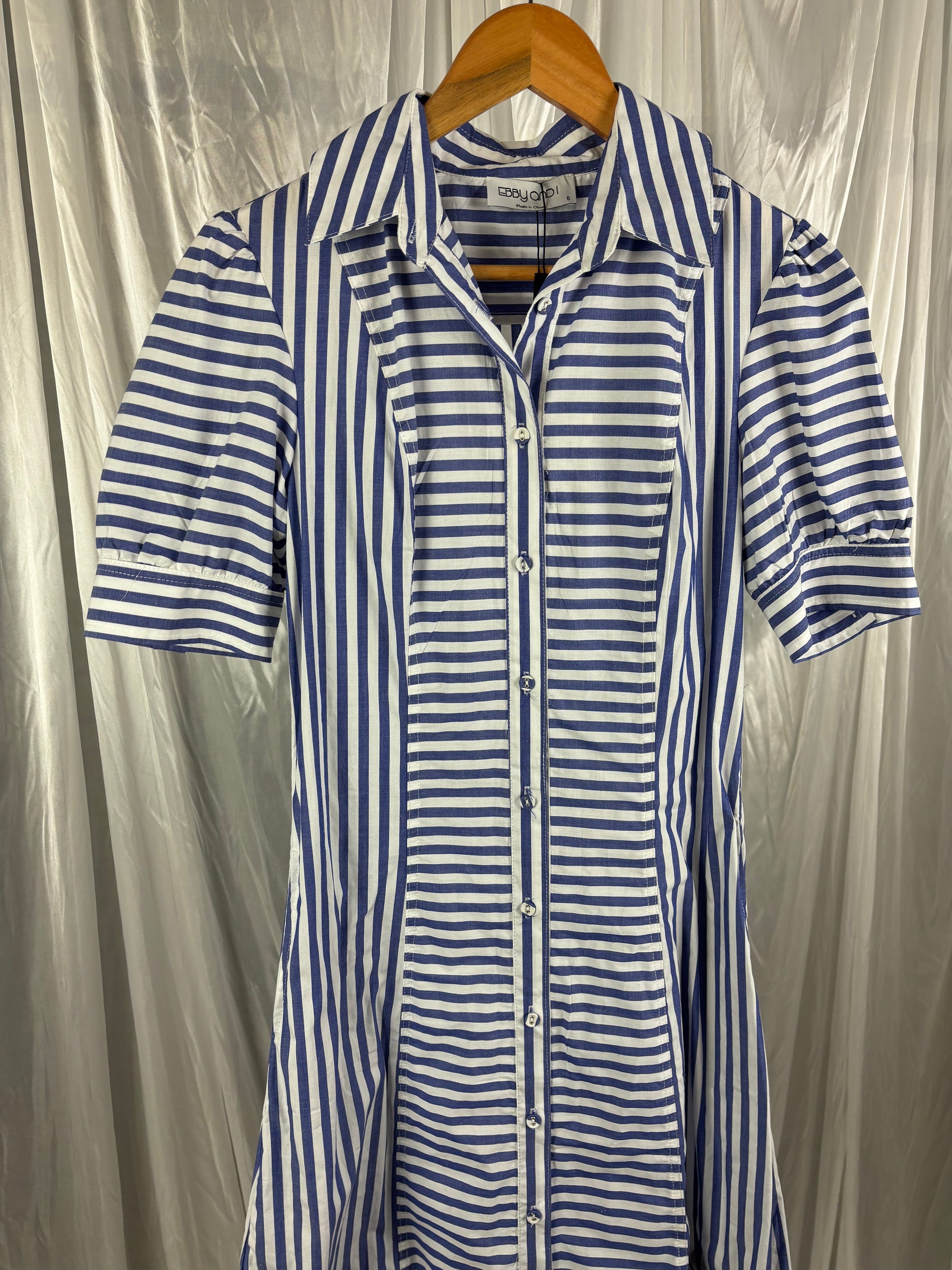 Description - Blue and white striped mini dress with puff shoulders and button front detailing. Brand new with tags