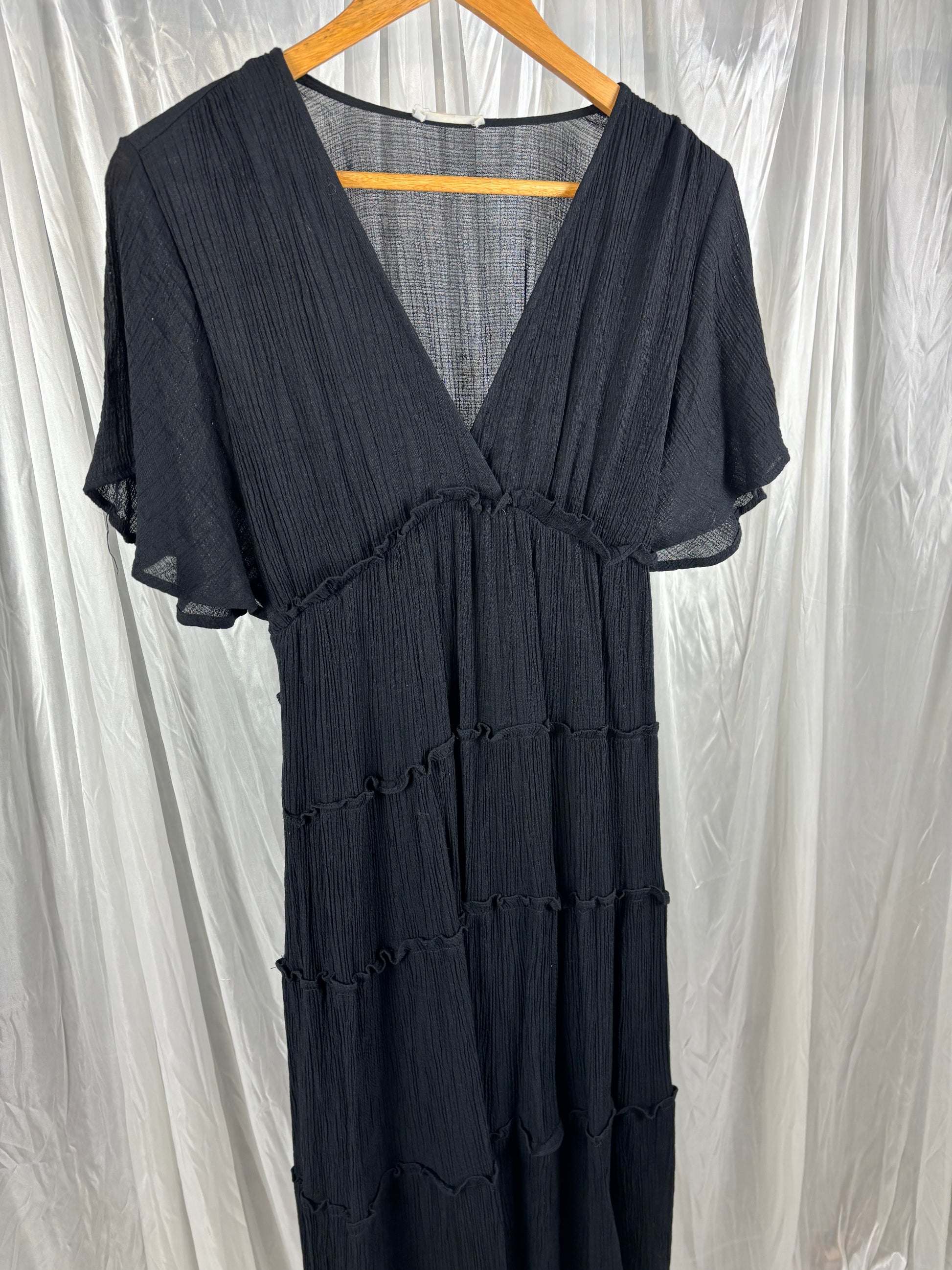 Description - Black v neck tiered midi dress, 75% rayon, 25% nylon