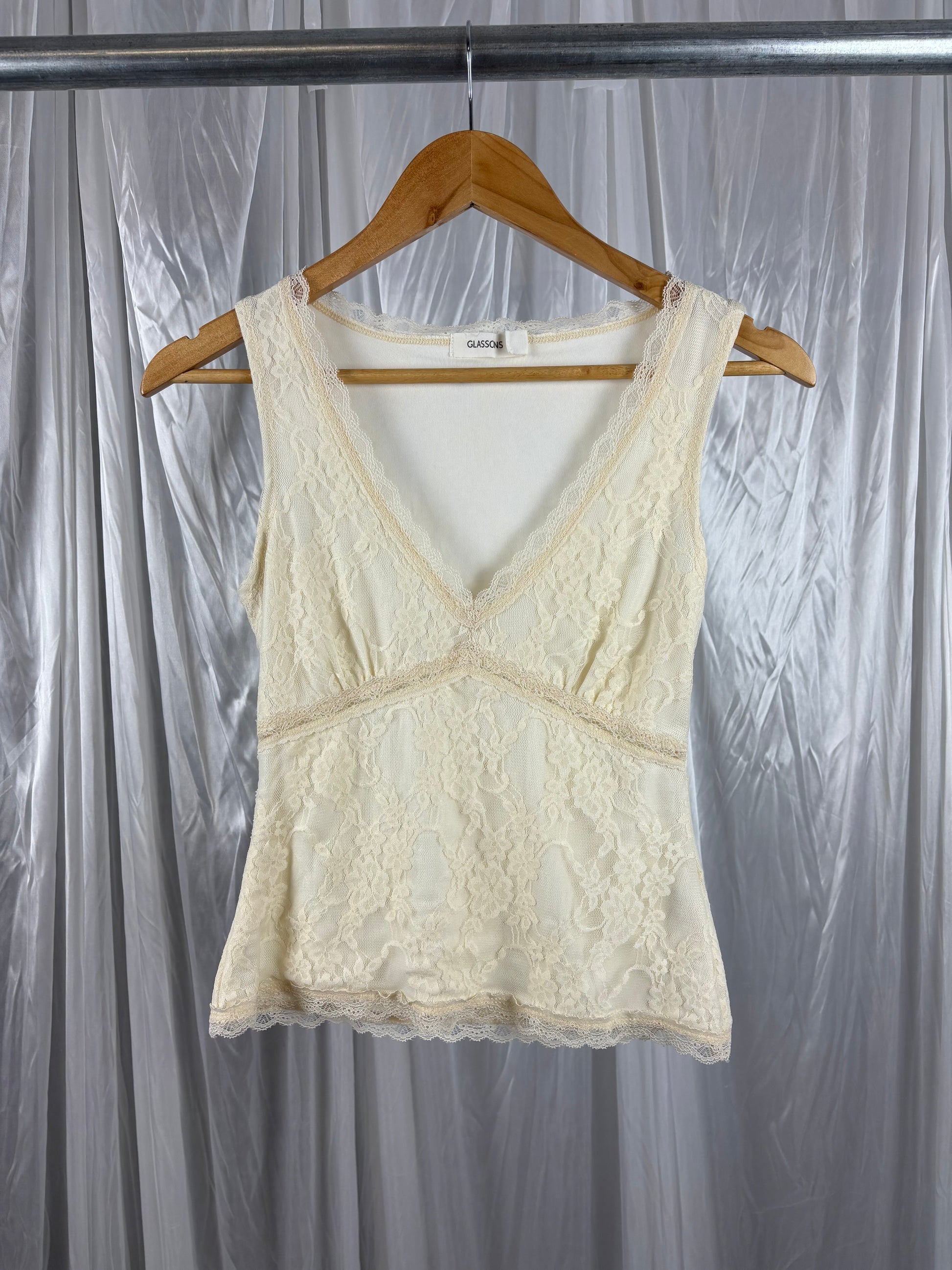 Description - V-cut singlet top with lace overlay, Fabric 92% nylon & 8% elastane, Lining 95% polyester, 5% elastane. Great condition