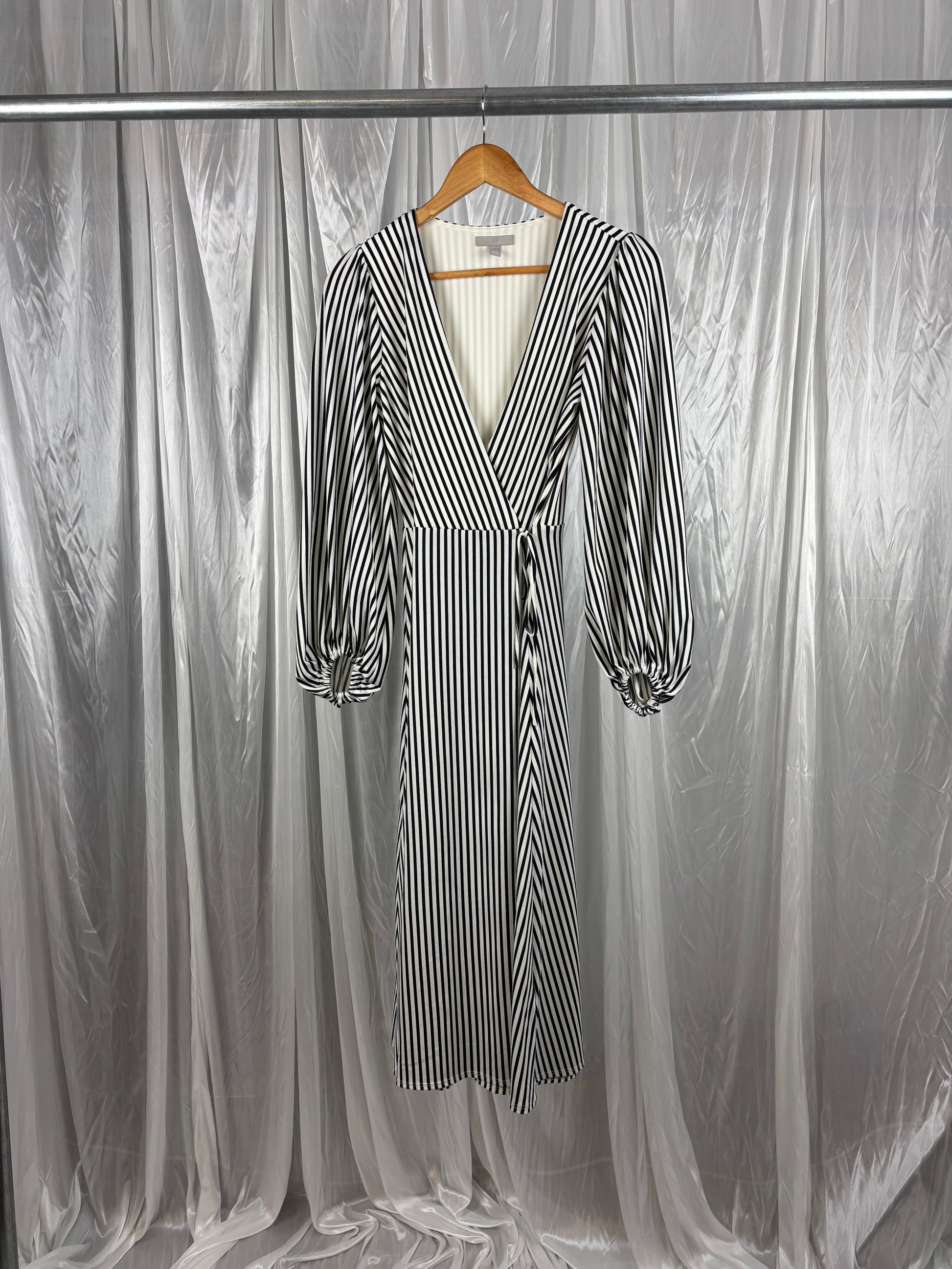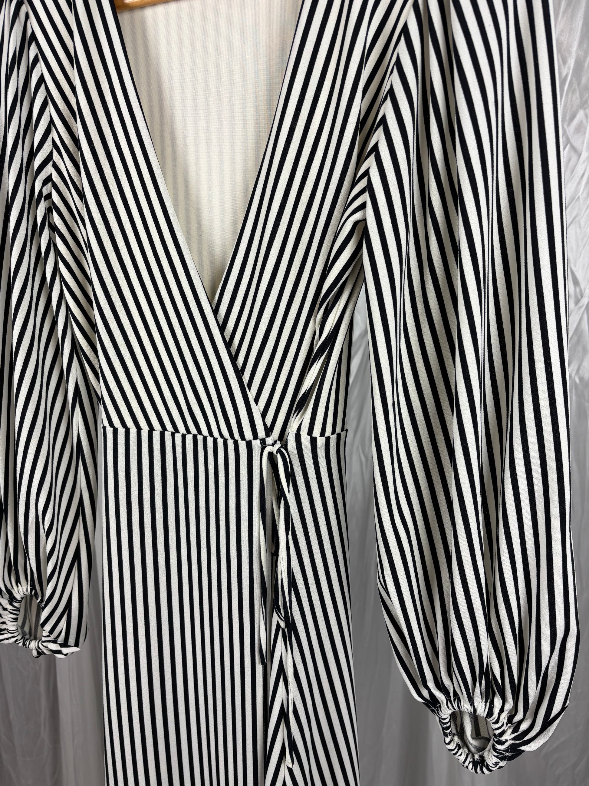 Description - Black and white striped wrap style midi dress with balloon sleeves, 94% polyester, 6% elastane. Great condition