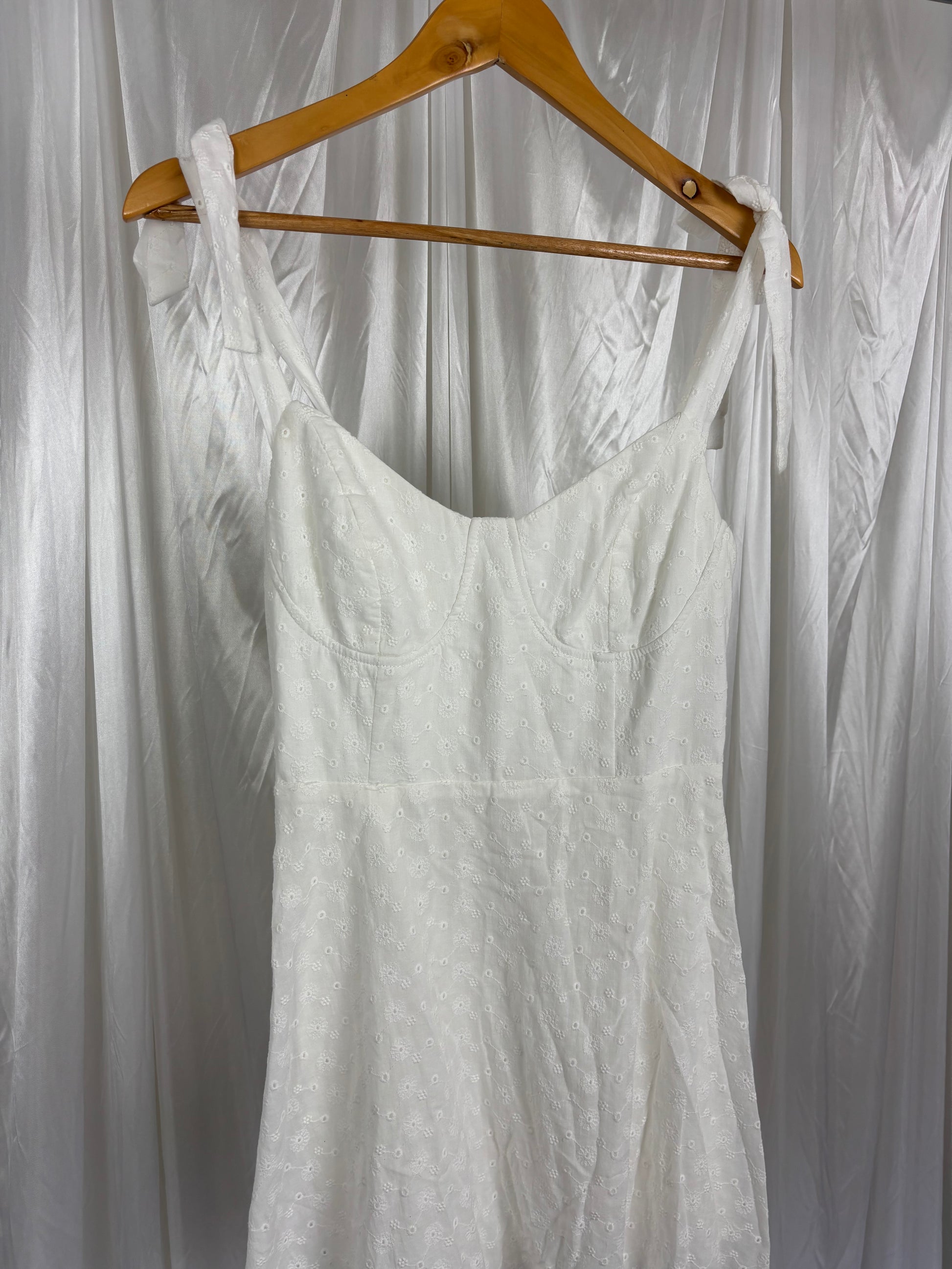 Description - White flower mini dress with tie shoulders, 65% cotton, 35% polyester. Brand new with tags!!