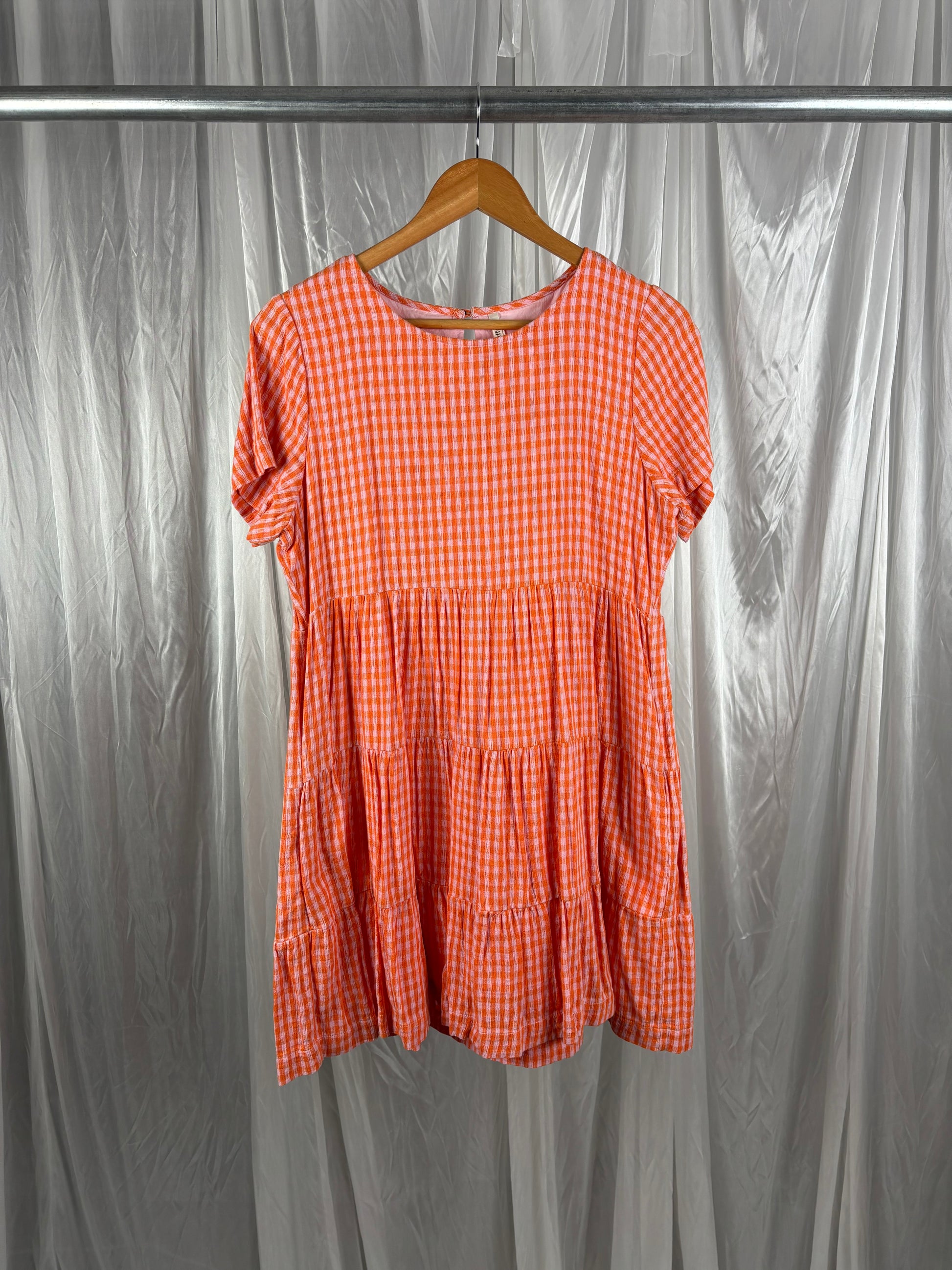 Description - Pink & orange gingham mini dress with side pockets, 50% cotton, 50% rayon