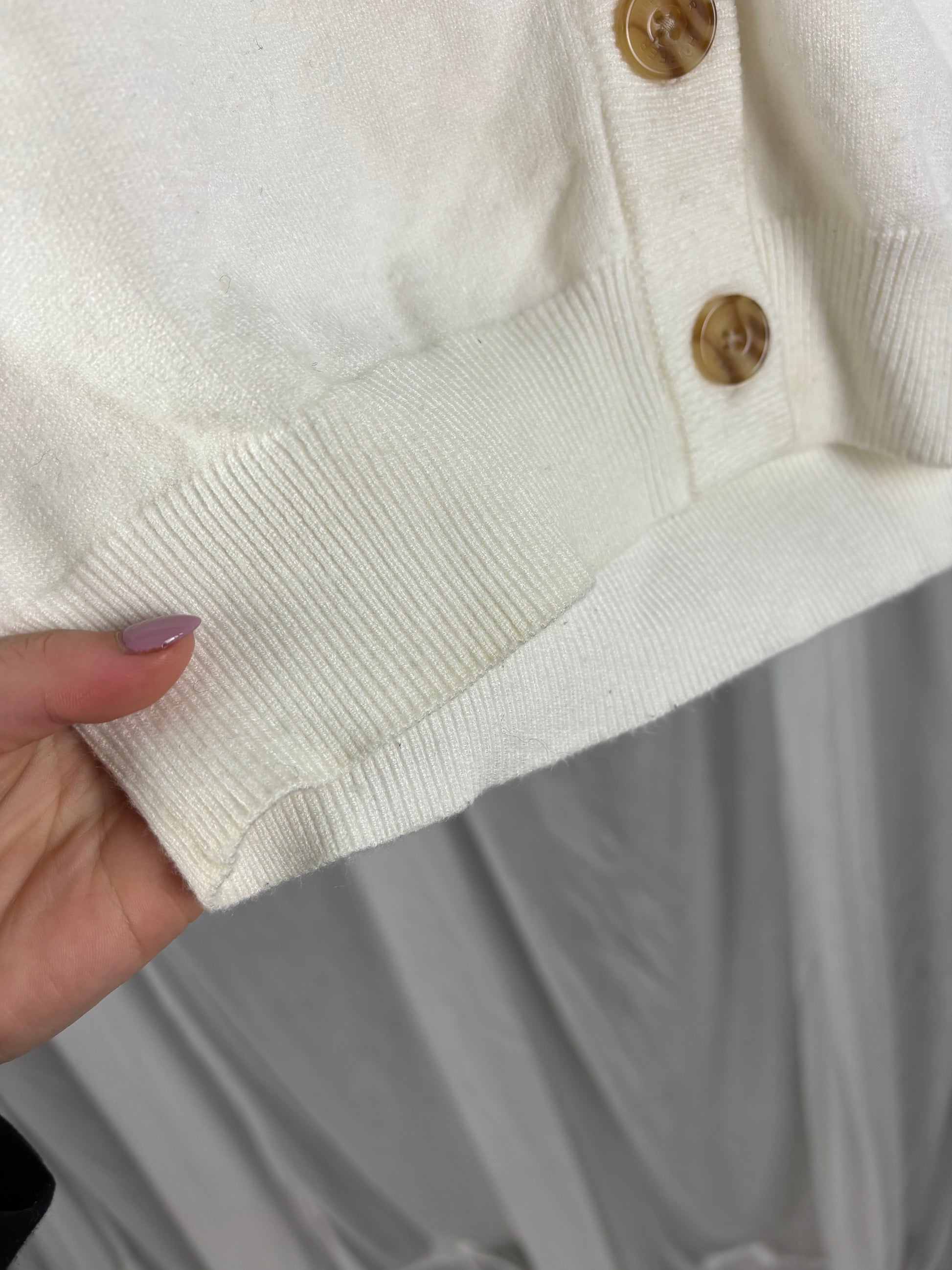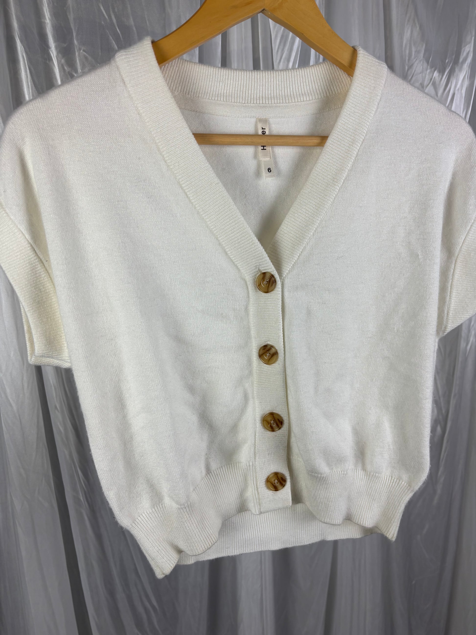 Description - White v neck button front crop top, beautiful soft fabric! unfortunately has some very light making/discoloration in areas. 50% viscose, 28% PBT, 22% nylon