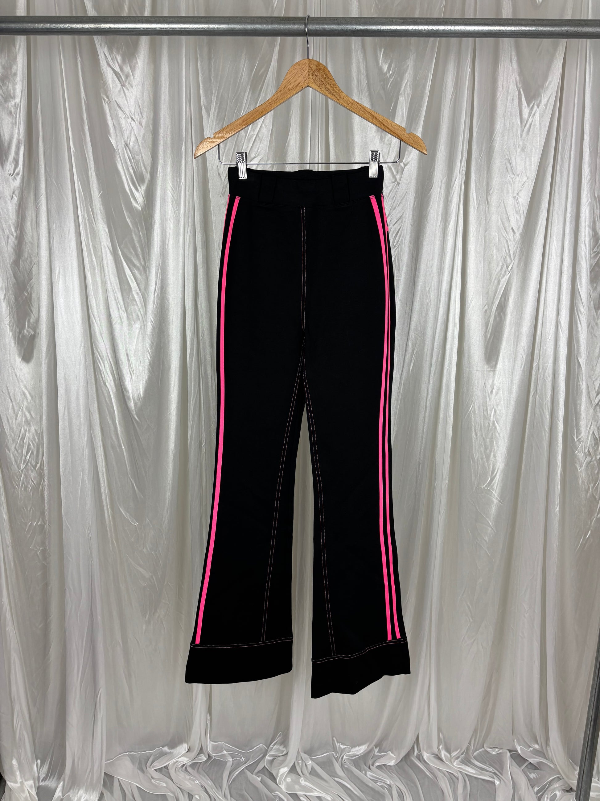Description - Black high waist pants with pink stripes down the side and across the bum, 60% rayon, 35% nylon, 5%spandex