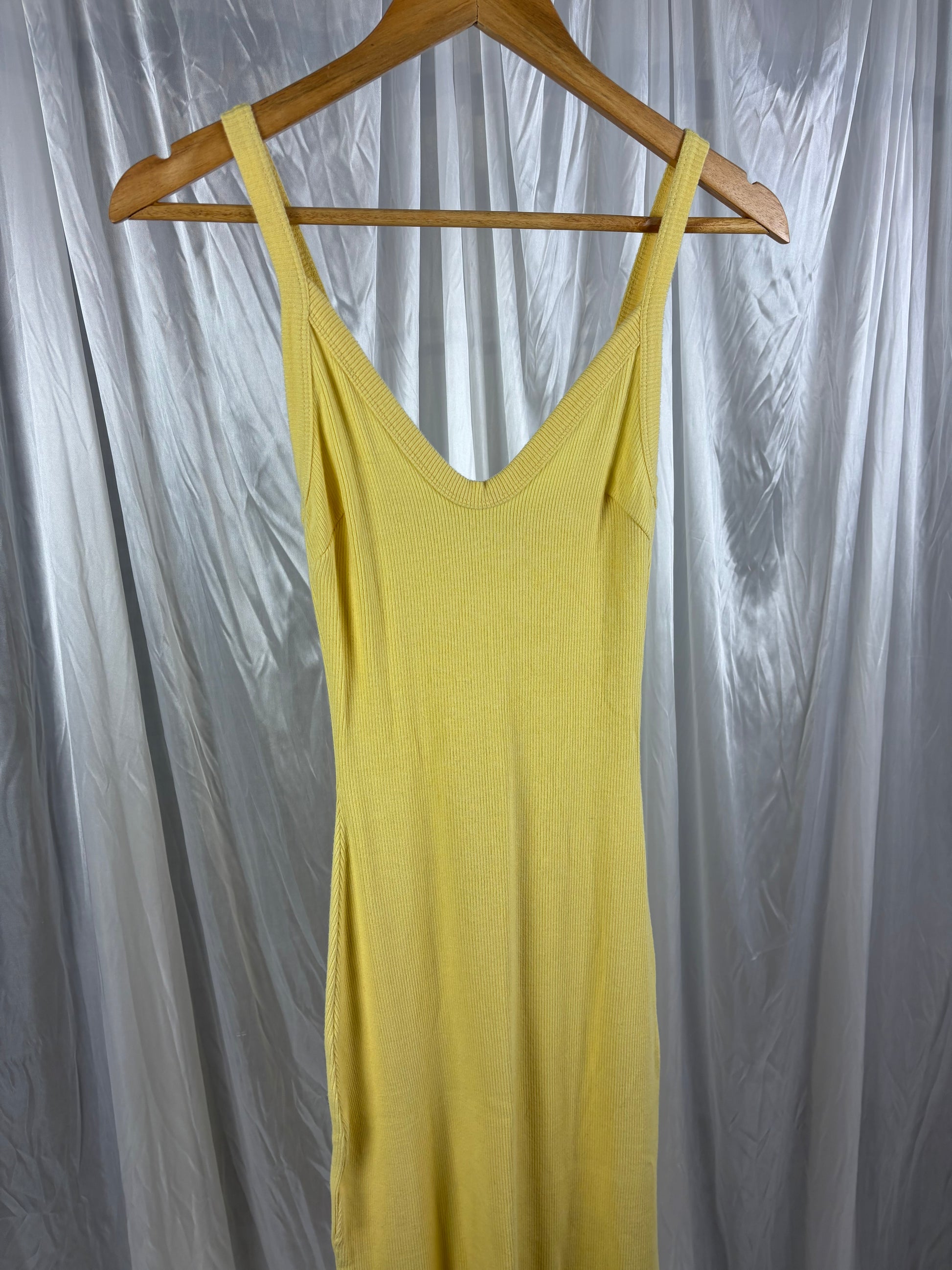 Description - Yellow tight ribbed maxi dress with a low back and deep v cut at the front, 48% cotton, 48% viscose, 4% elastane
