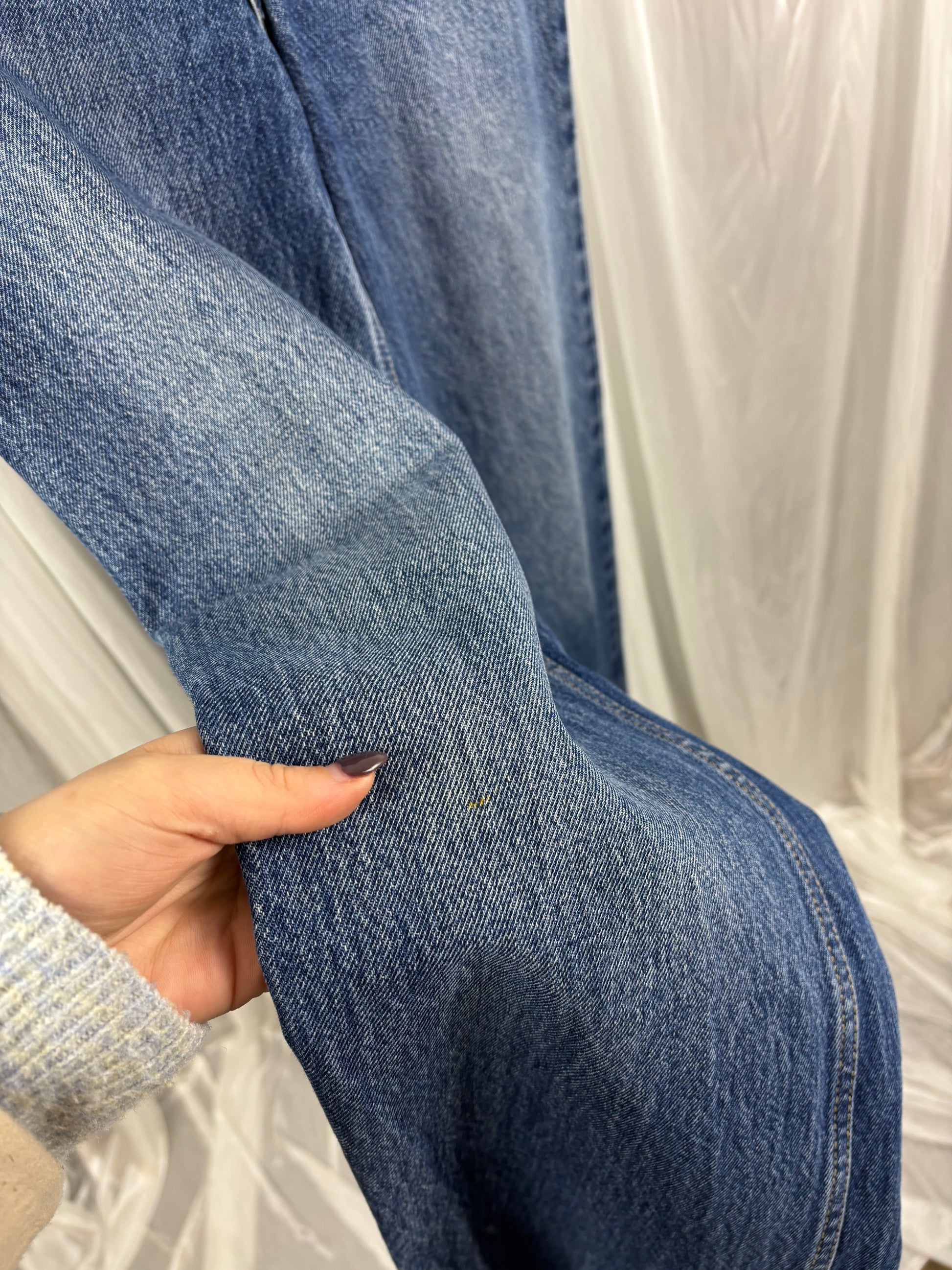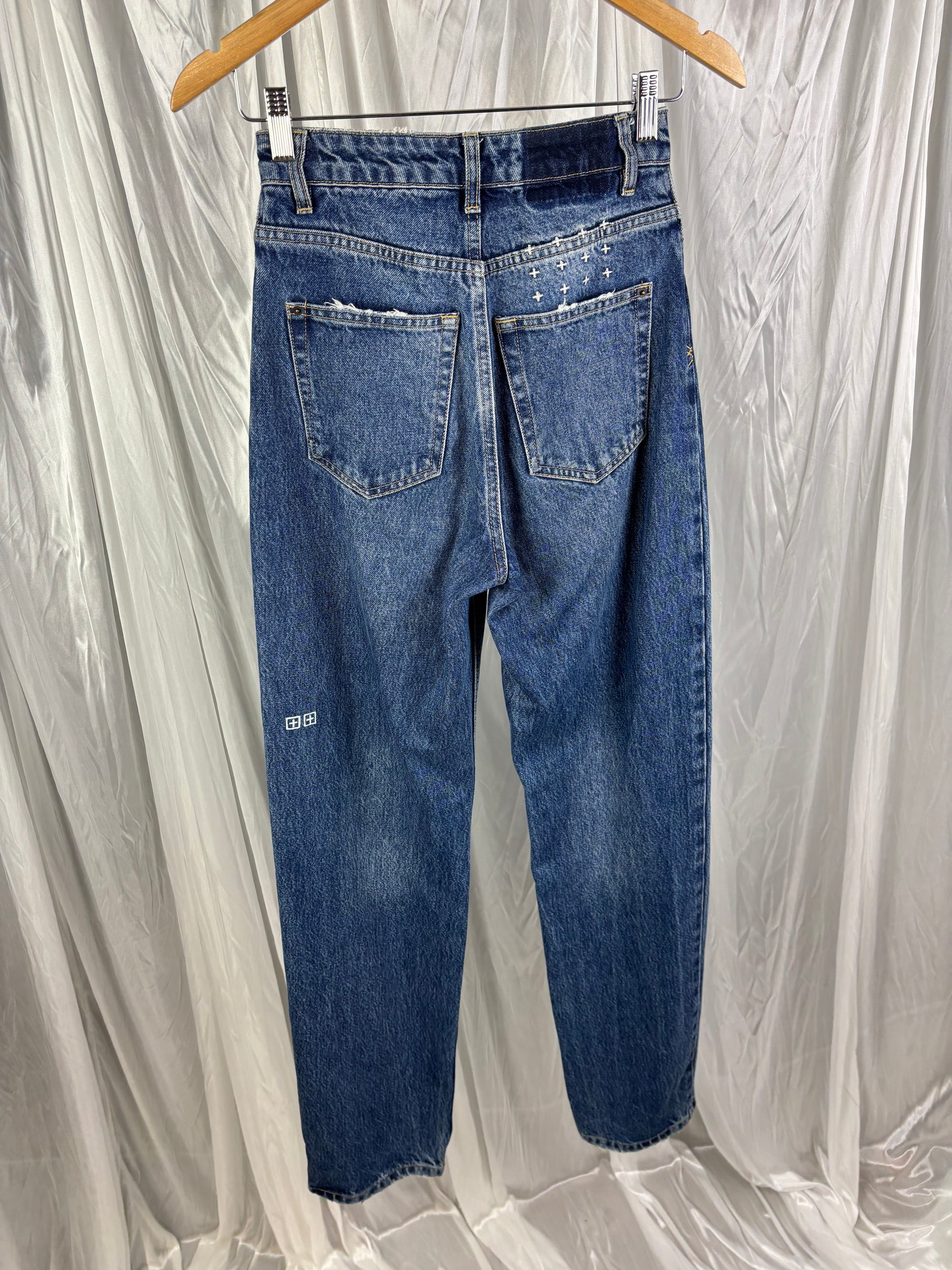 Description - Blue high rise denim jeans, 100% cotton. One small mark on the front