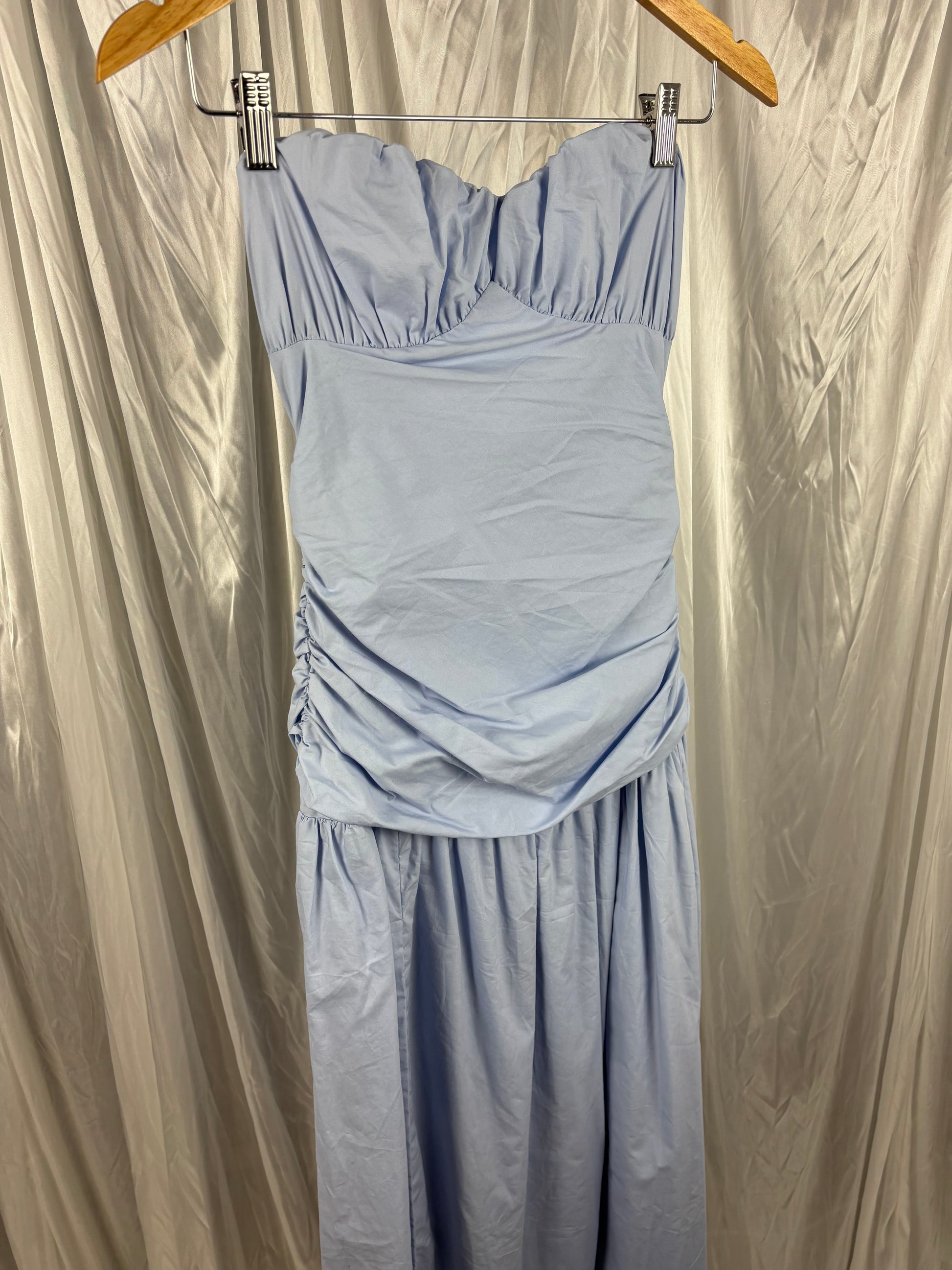 Description - Gorgeous blue strapless dress featuring ruching and a sweetheart neckline to the front + a leg slit and zipper back. Brand new with tags!