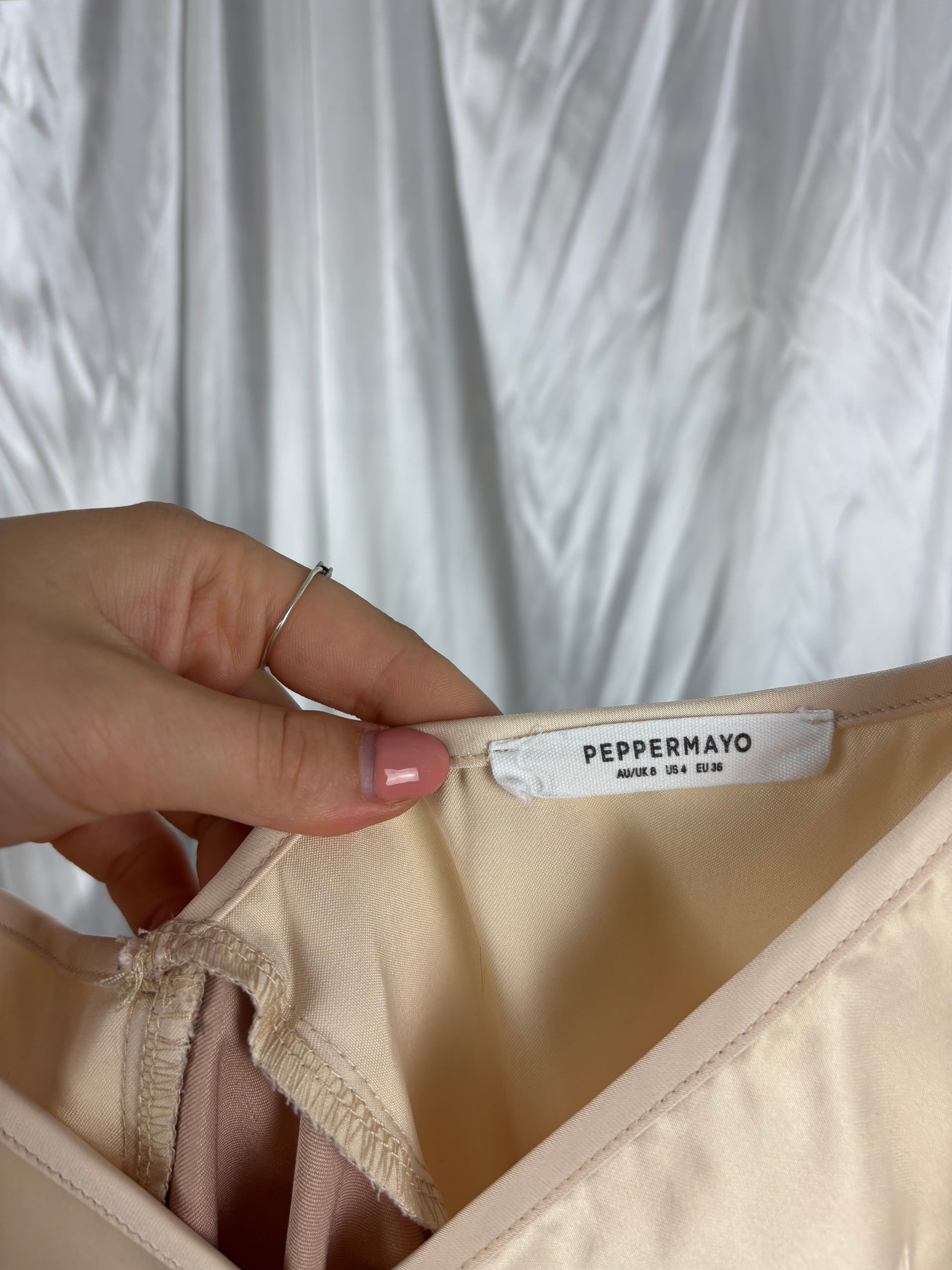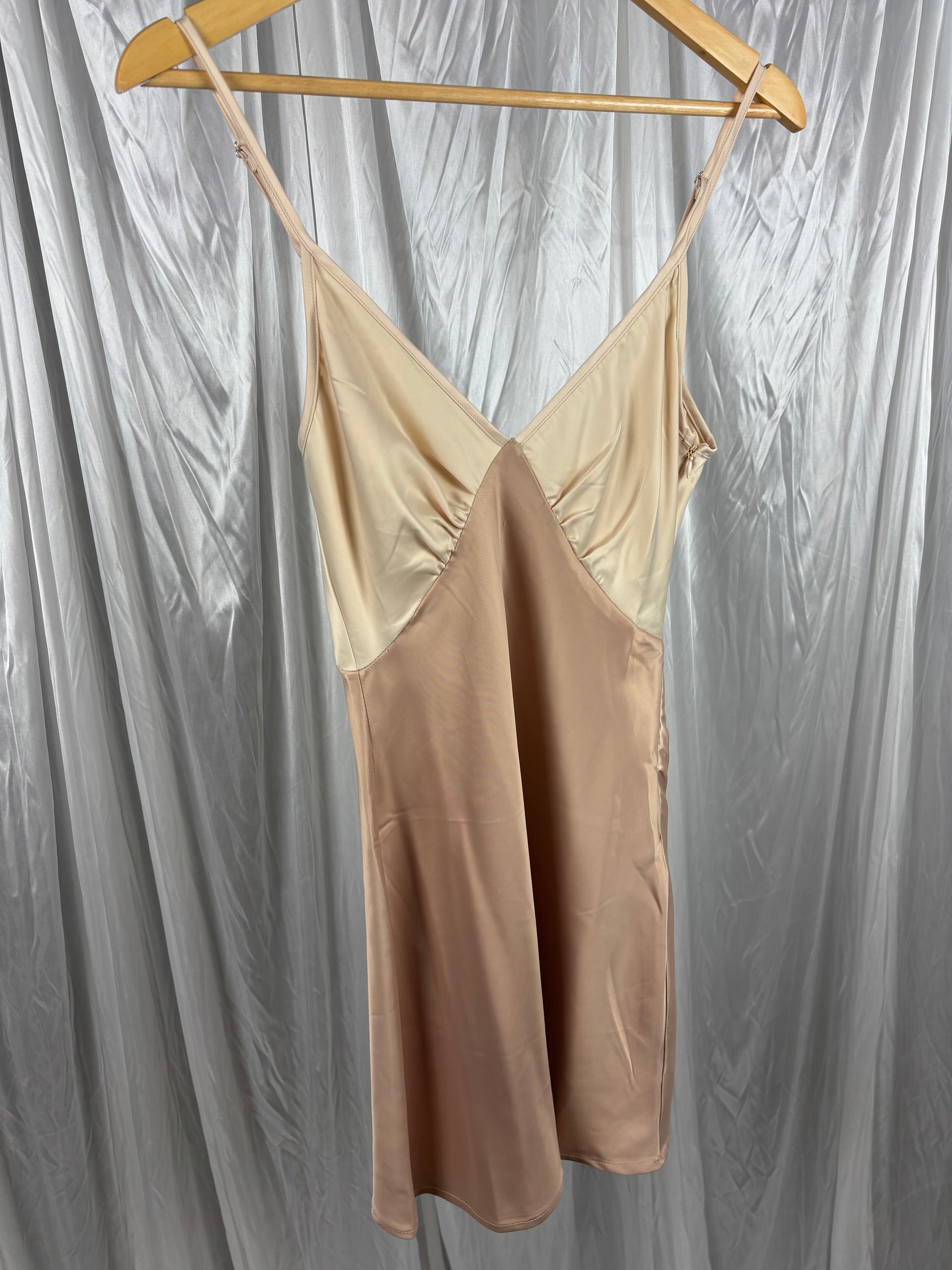 Description - Satin feel v-neck mini dress with adjustable straps, 96% polyester, 4% elastane. Great preloved condition