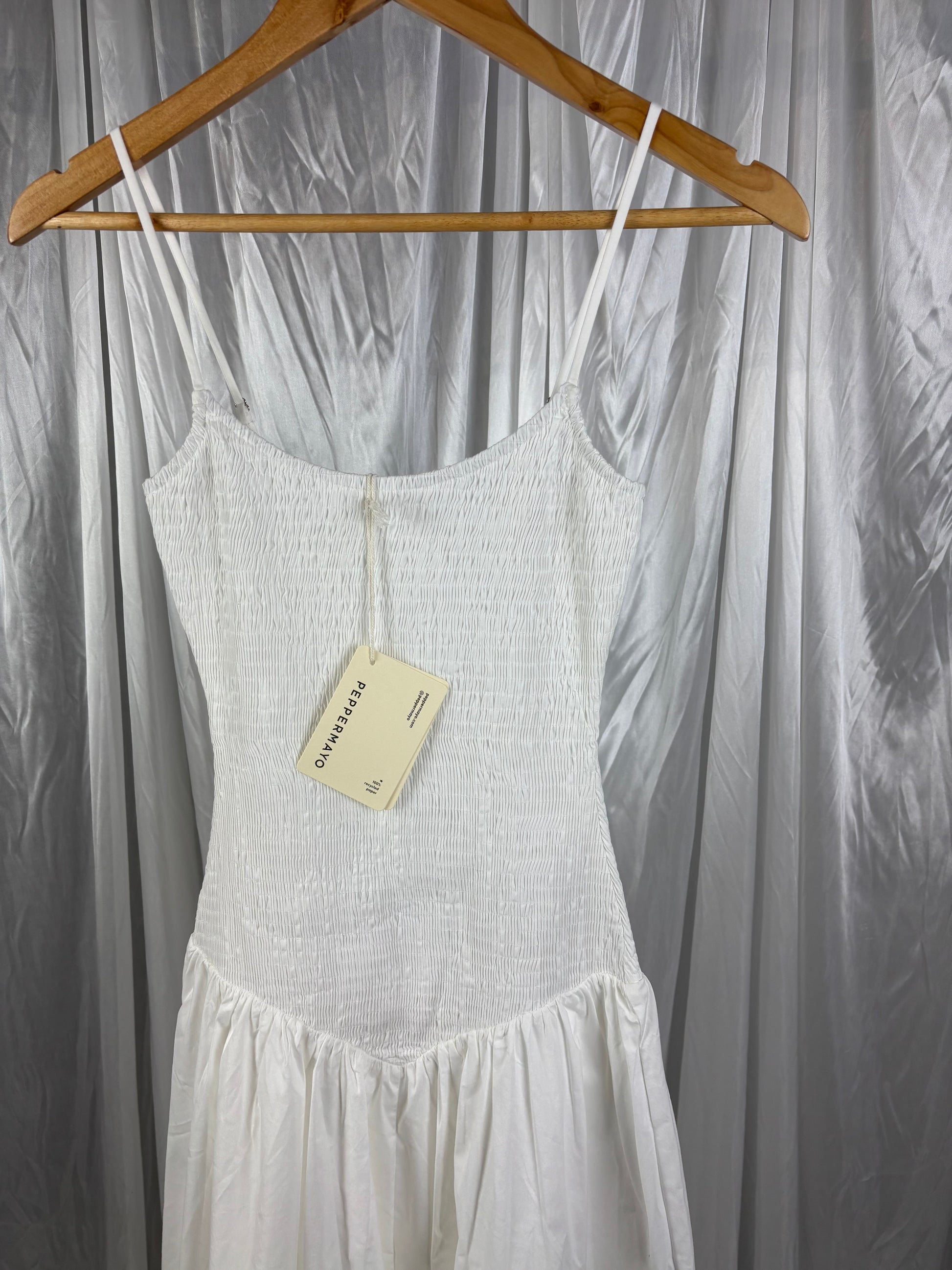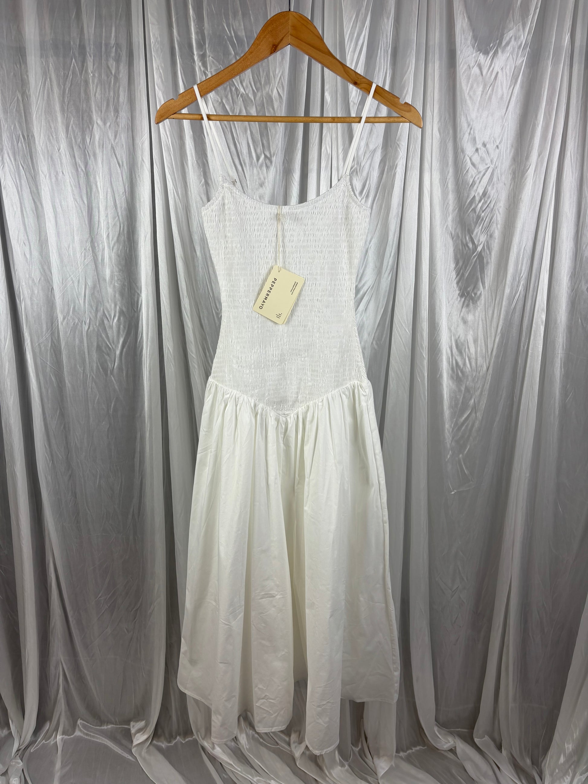 Description - Introducing the Natalyi Midi Dress. With its drop waist detailing, this dress exudes timeless elegance and modern allure. Crafted to complement balmy nights and golden skies. 65% cotton, 32% nylon, 3% spandex