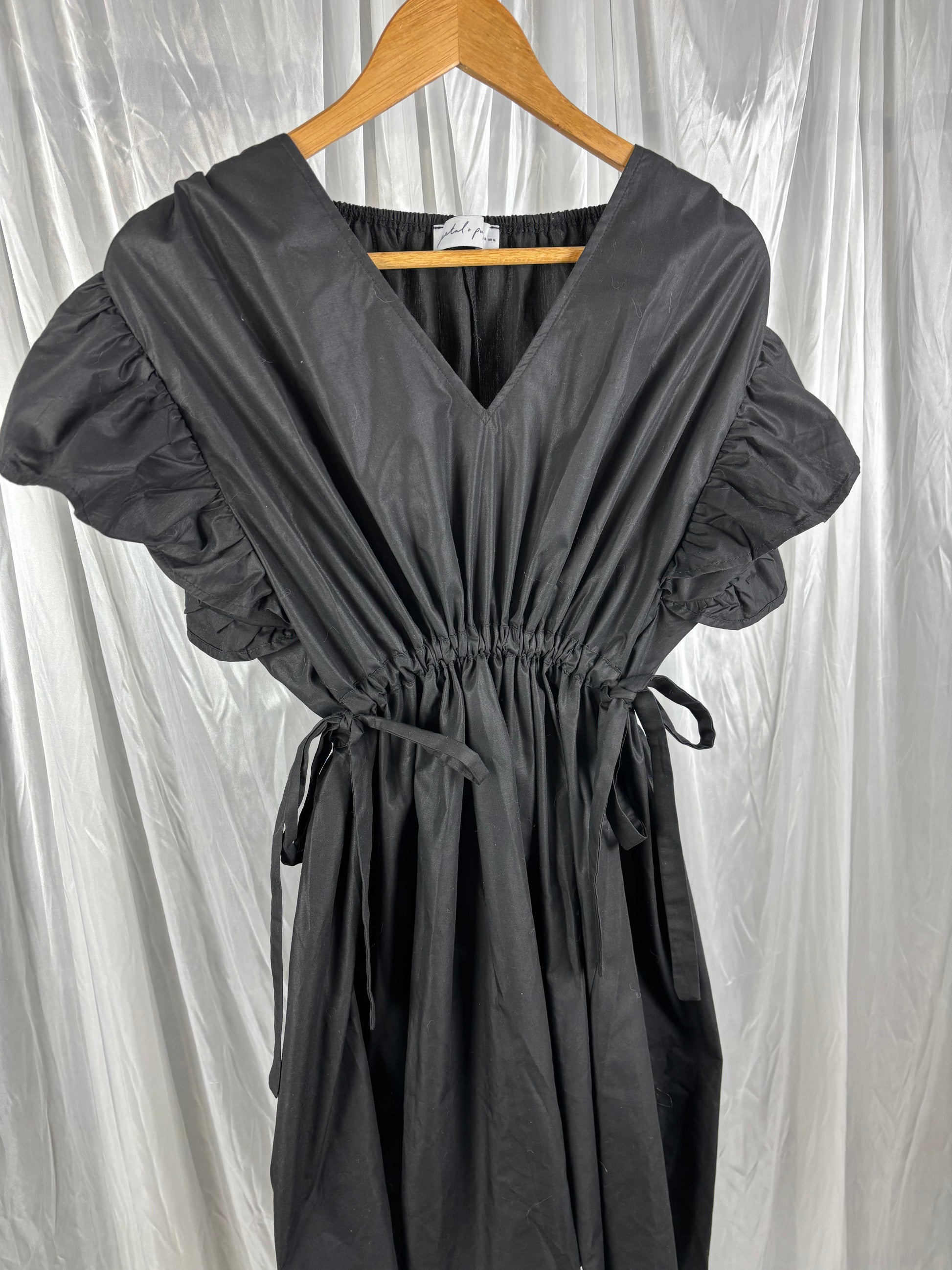 Description - Black v neck mini dress with adjustable bow tie detailing on the sides & ruffle shoulders. 100% cotton