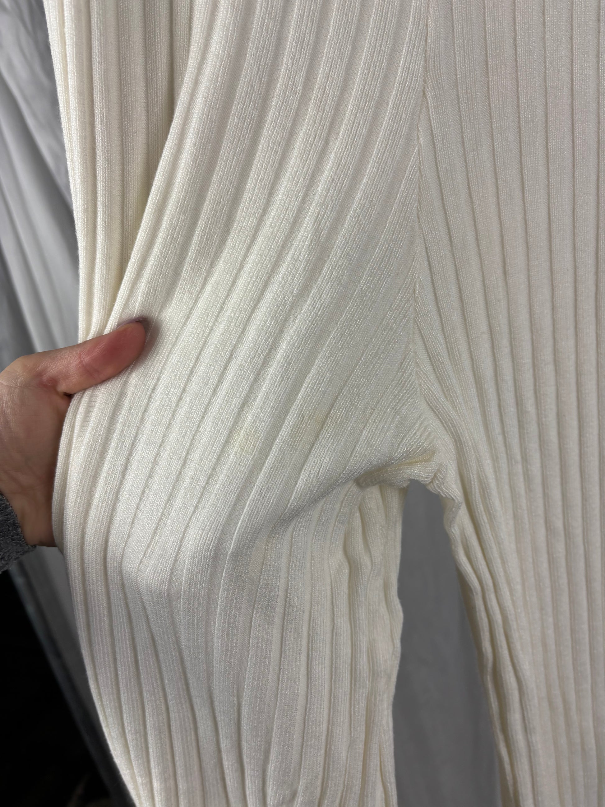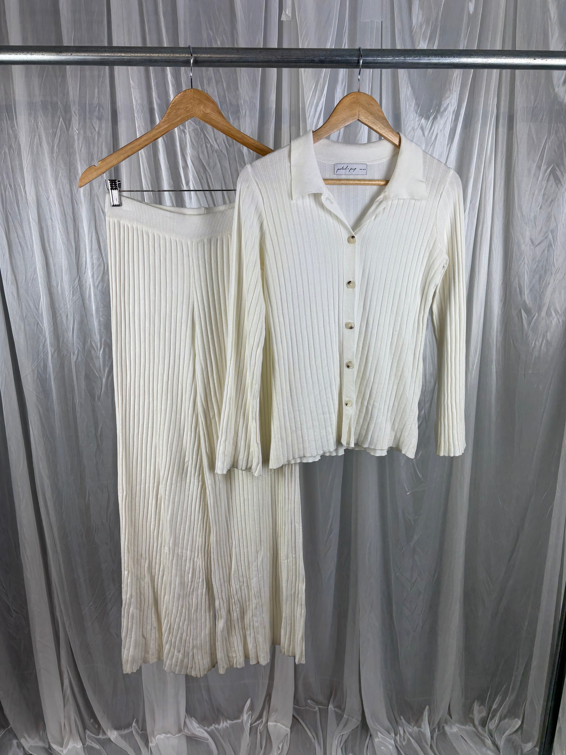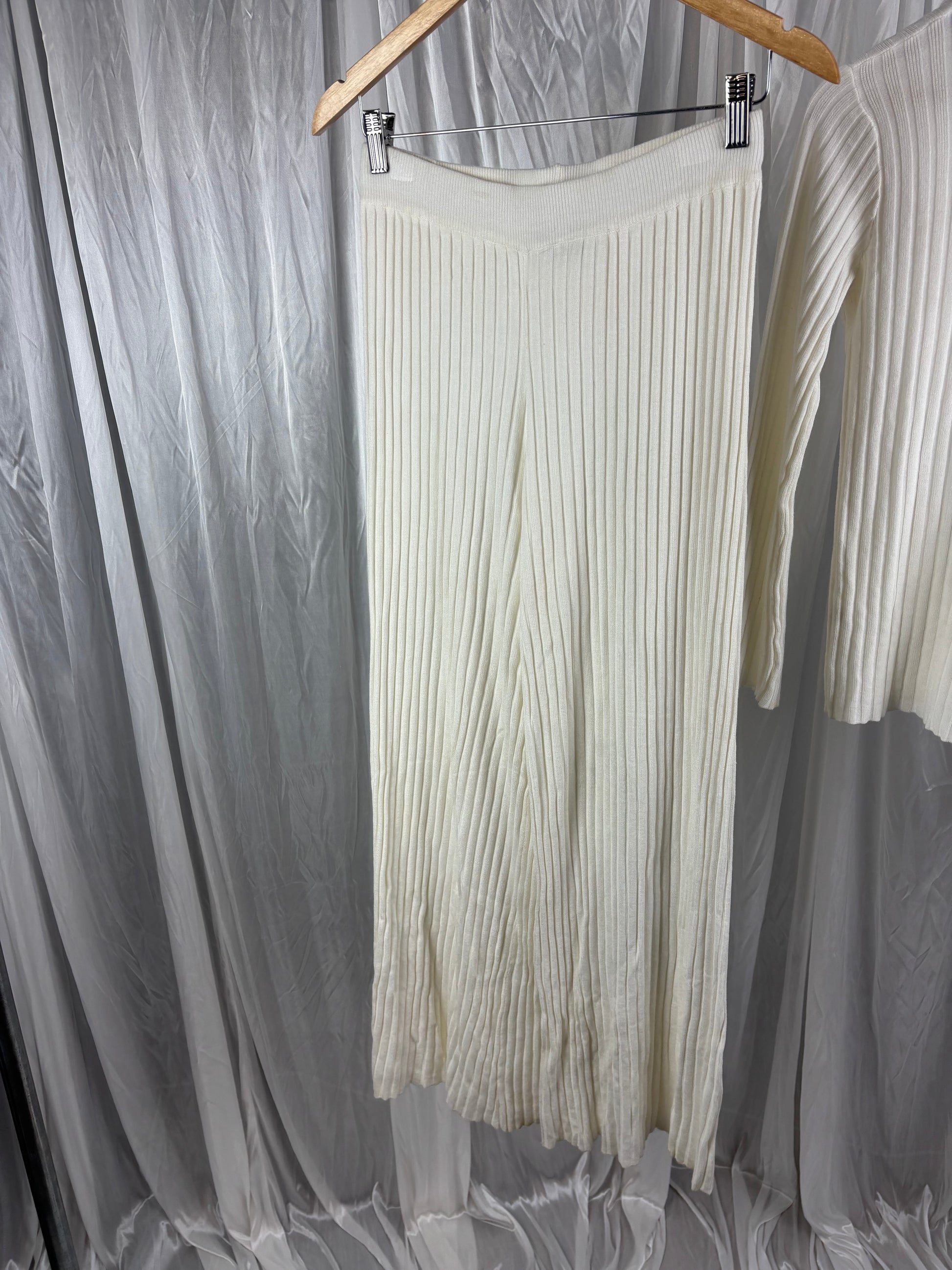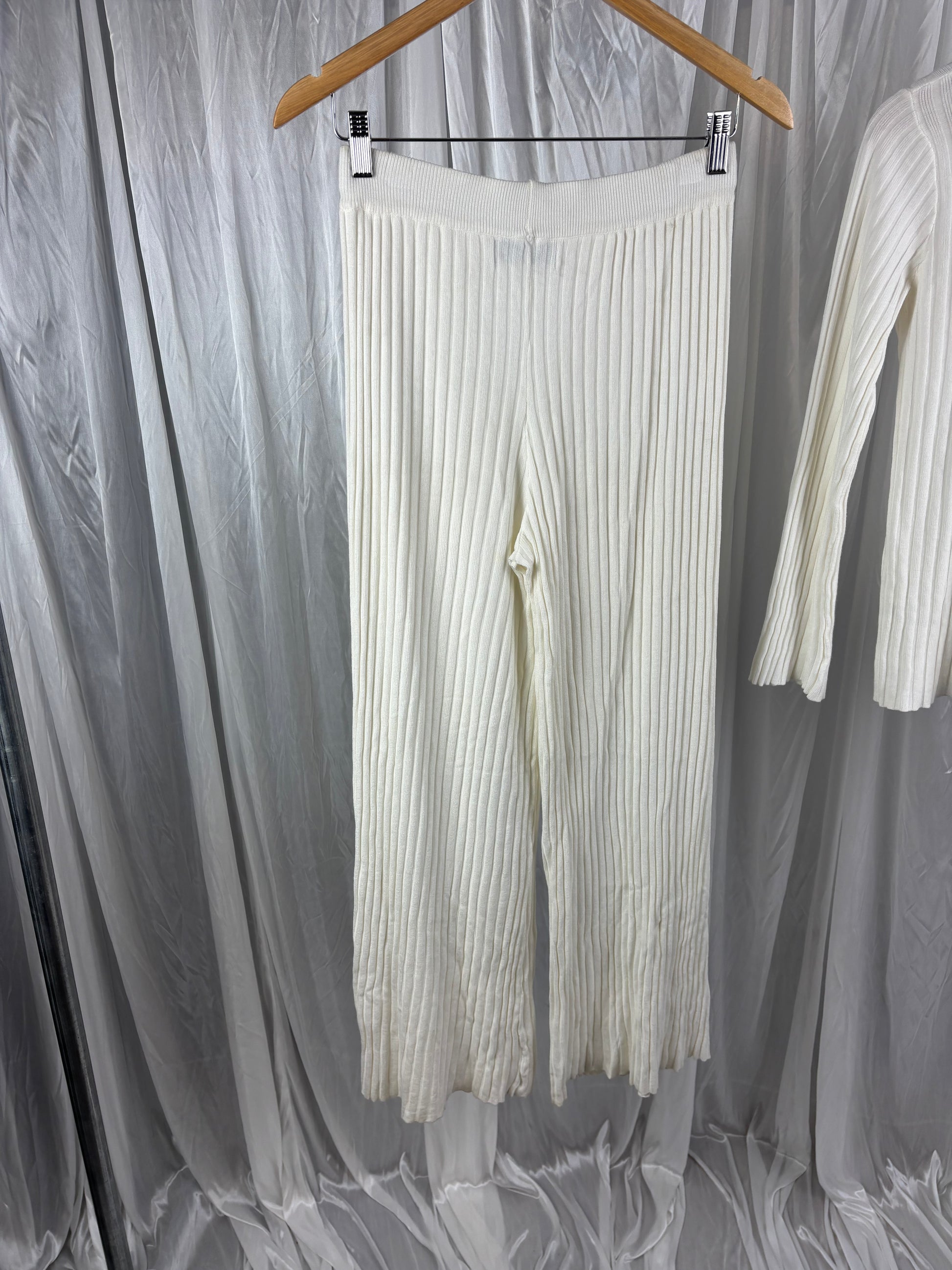 Description - White ribbed button front long sleeve top with matching wide leg pants (the pants have marks at the bottom & on the back