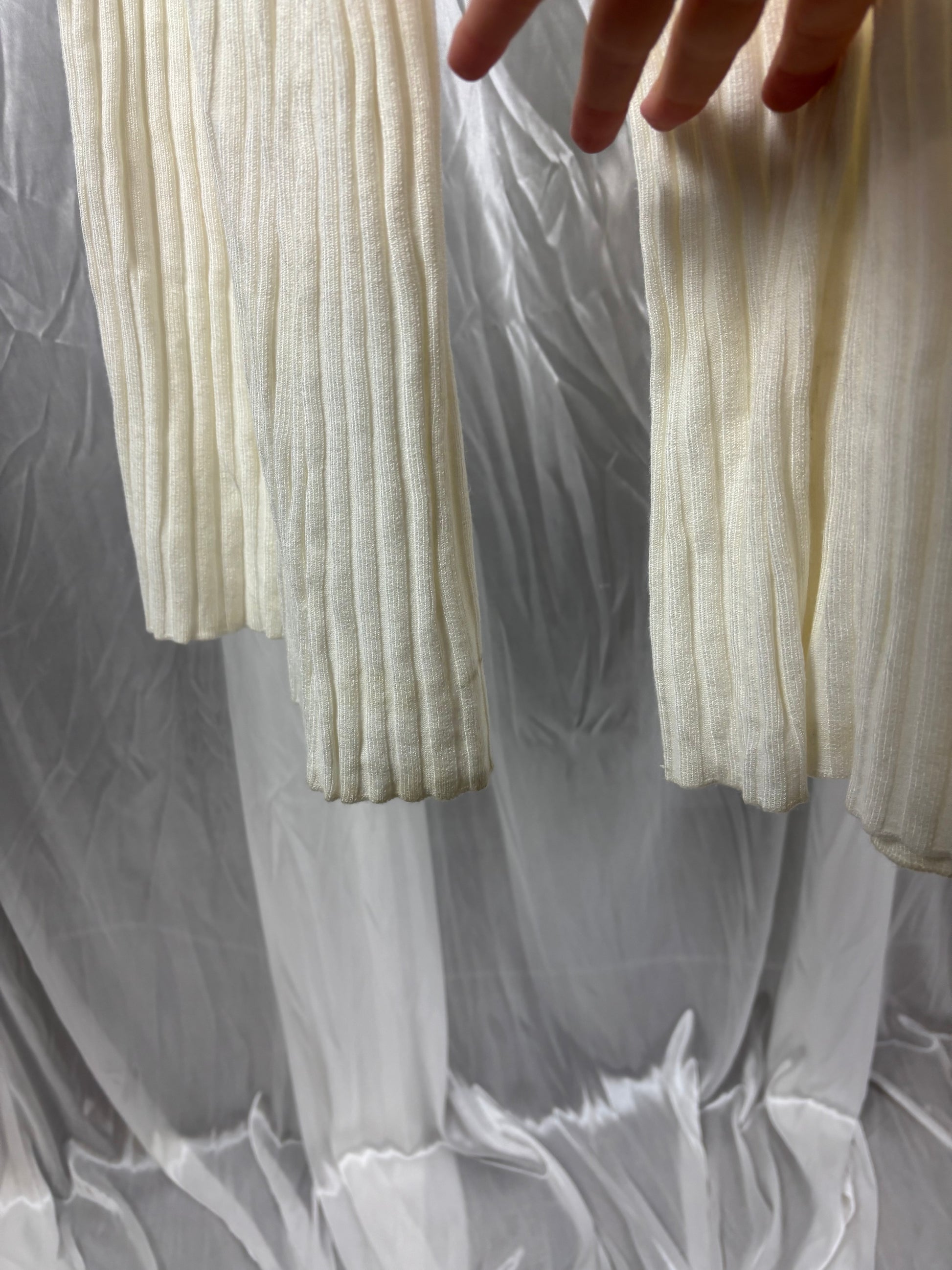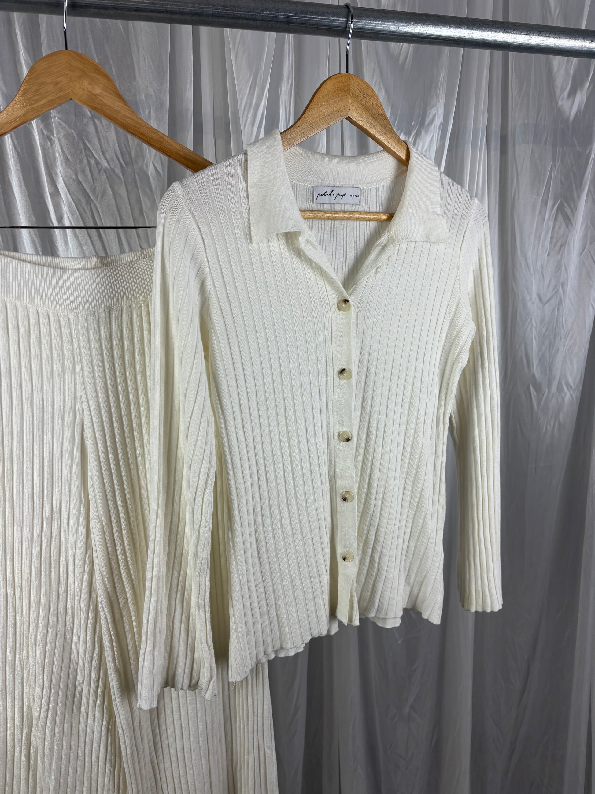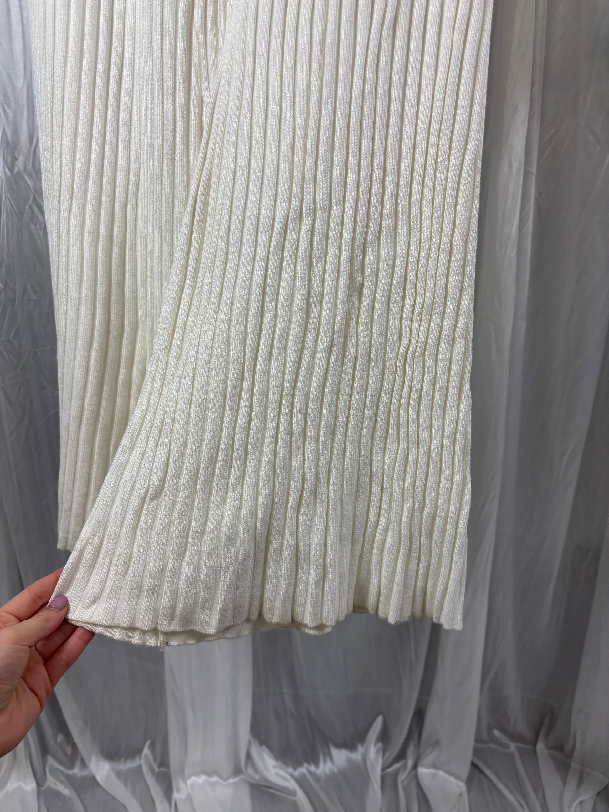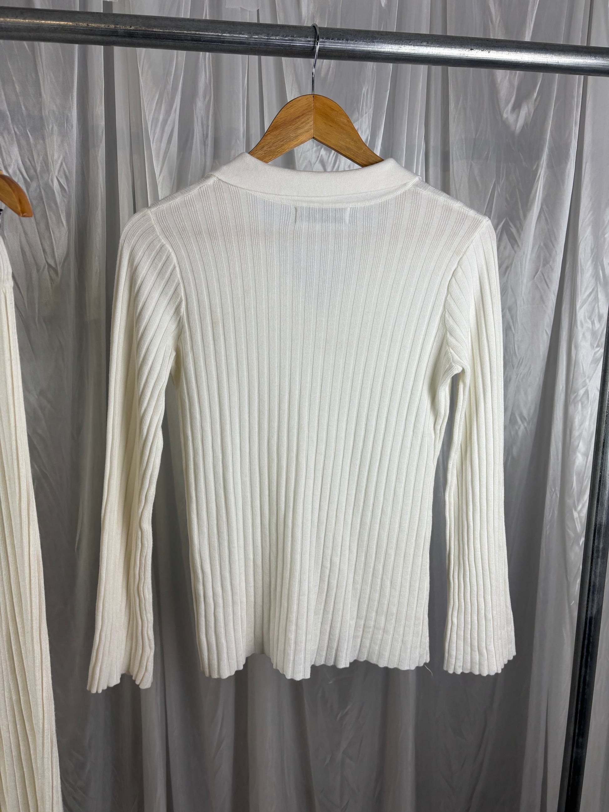 Description - White ribbed button front long sleeve top with matching wide leg pants (the pants have marks at the bottom & on the back