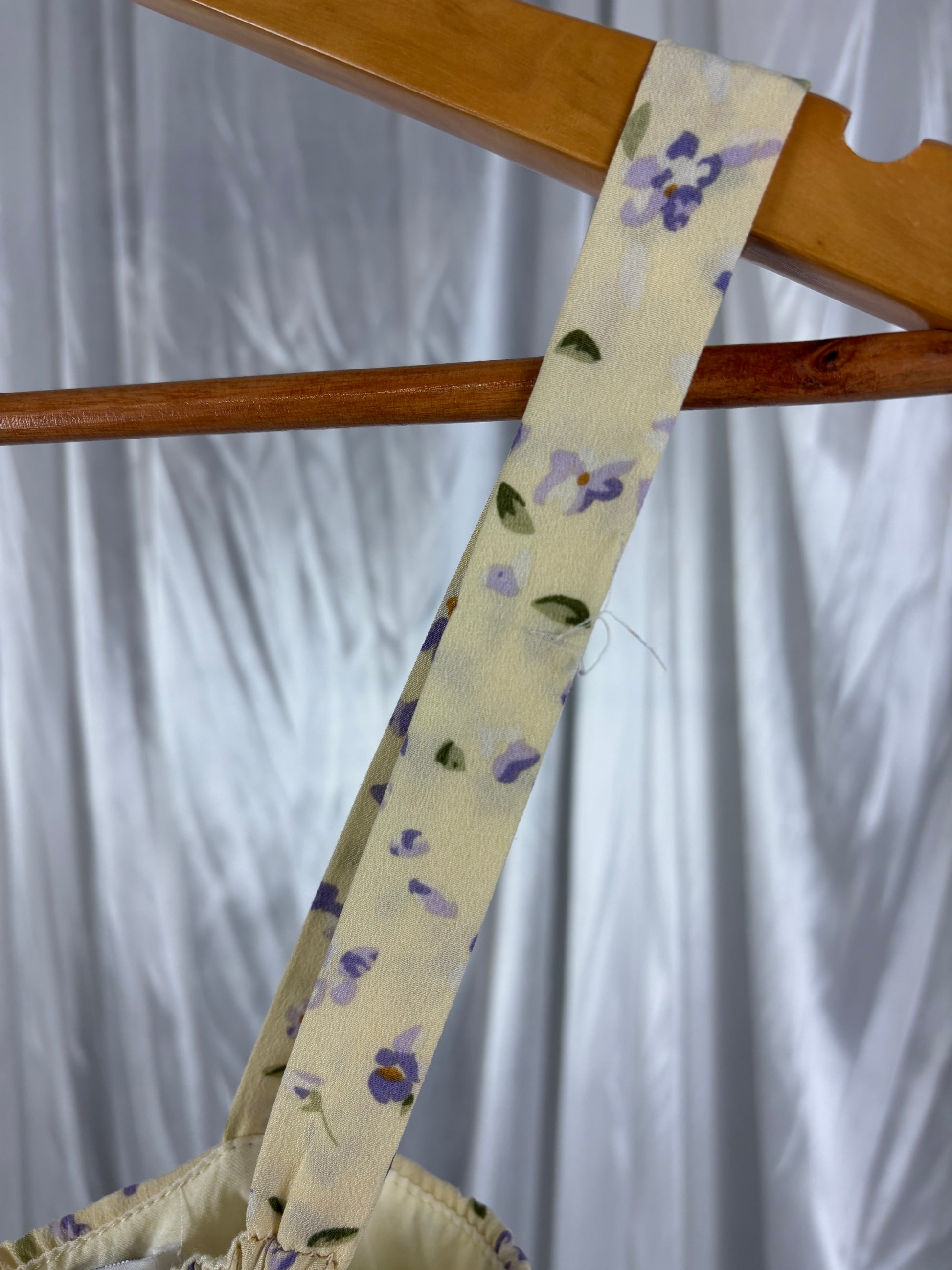 Description - Yellow floral corset top with tie front detail and a zipper back, there is one small pull to the material on the strap. 100% polyester