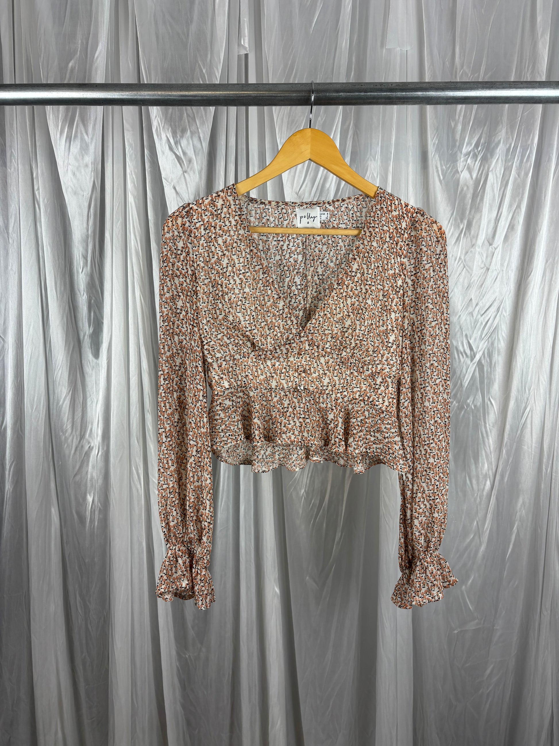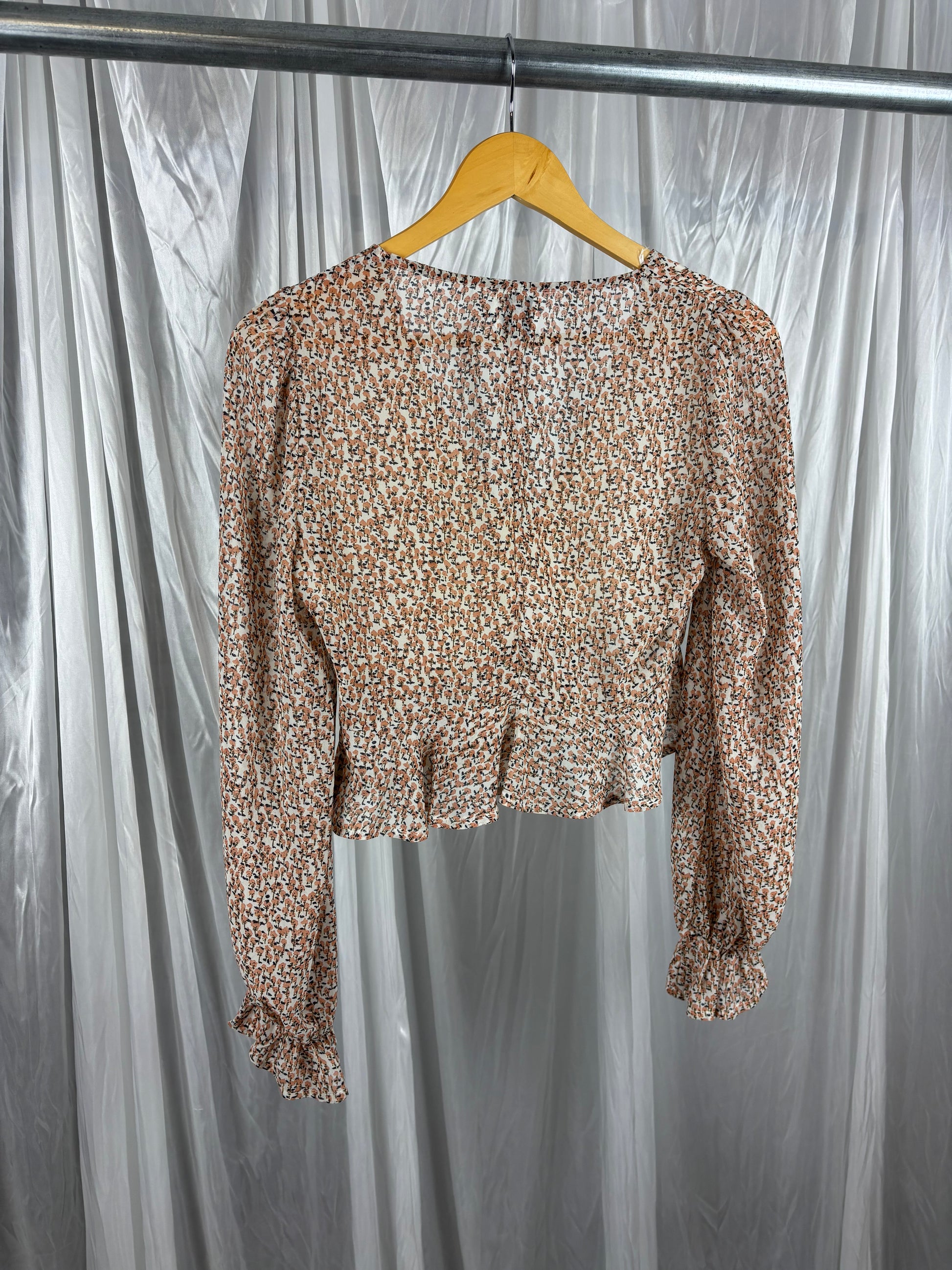 Description - Floral v-neck crop blouse with sheer back and sleeves, beautiful ruffle hem and cuff details, polyester. Good preloved condition