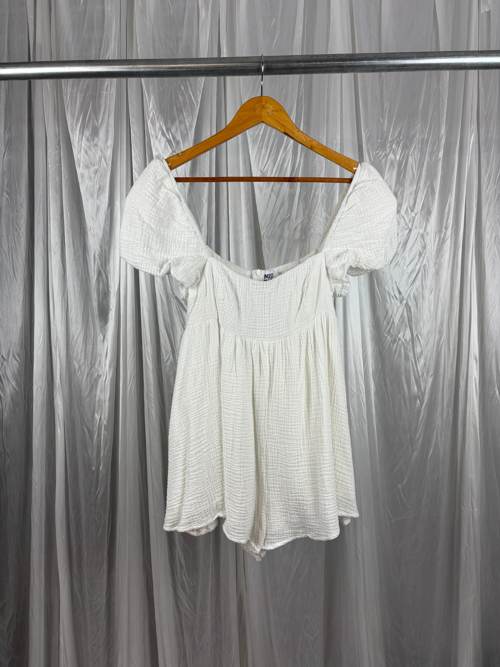 Description - White playsuit with puff shoulders and a zipper back, 100% cotton. Good condition