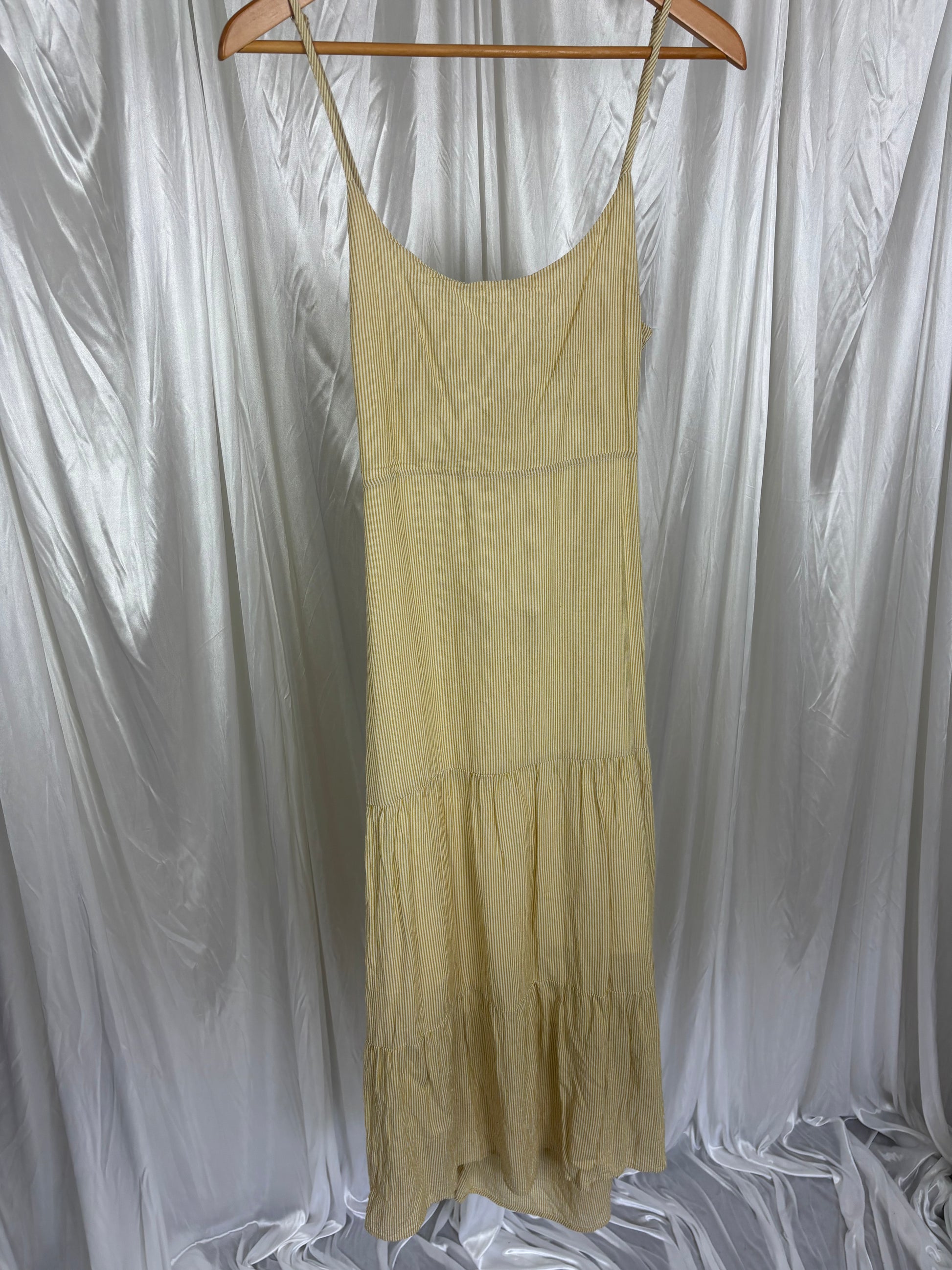 Description - Yellow and white striped dress with thin straps and a beautiful bow tie back, 50% rayon, 50% cotton