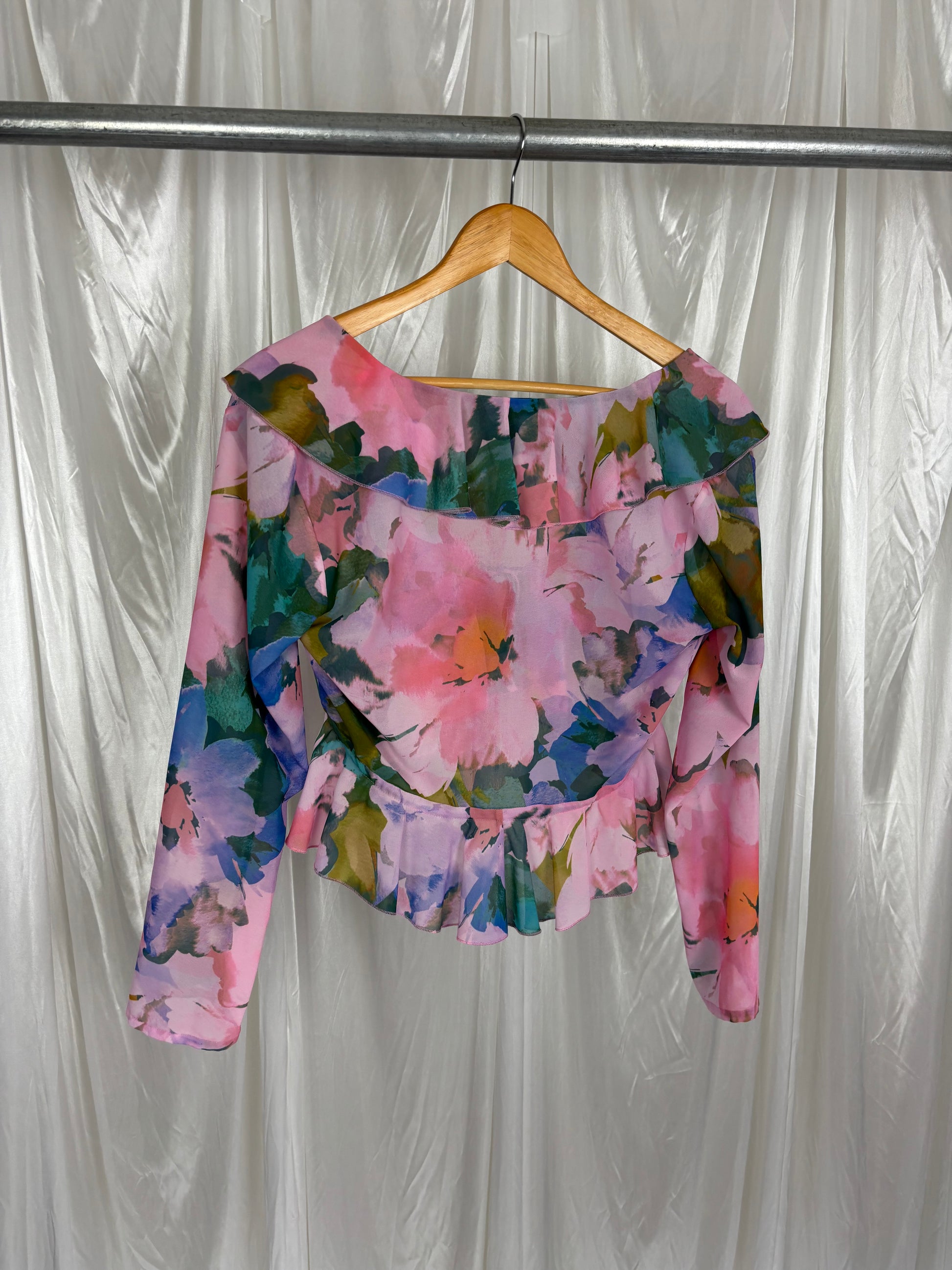 Description - Colorful "Sense tie blouse" with flared sleeve & tie detail, in a dreamy floral print. A simple silhouette, elevated with dainty ties that can be worn tied as a blouse or left undone as a layering piece