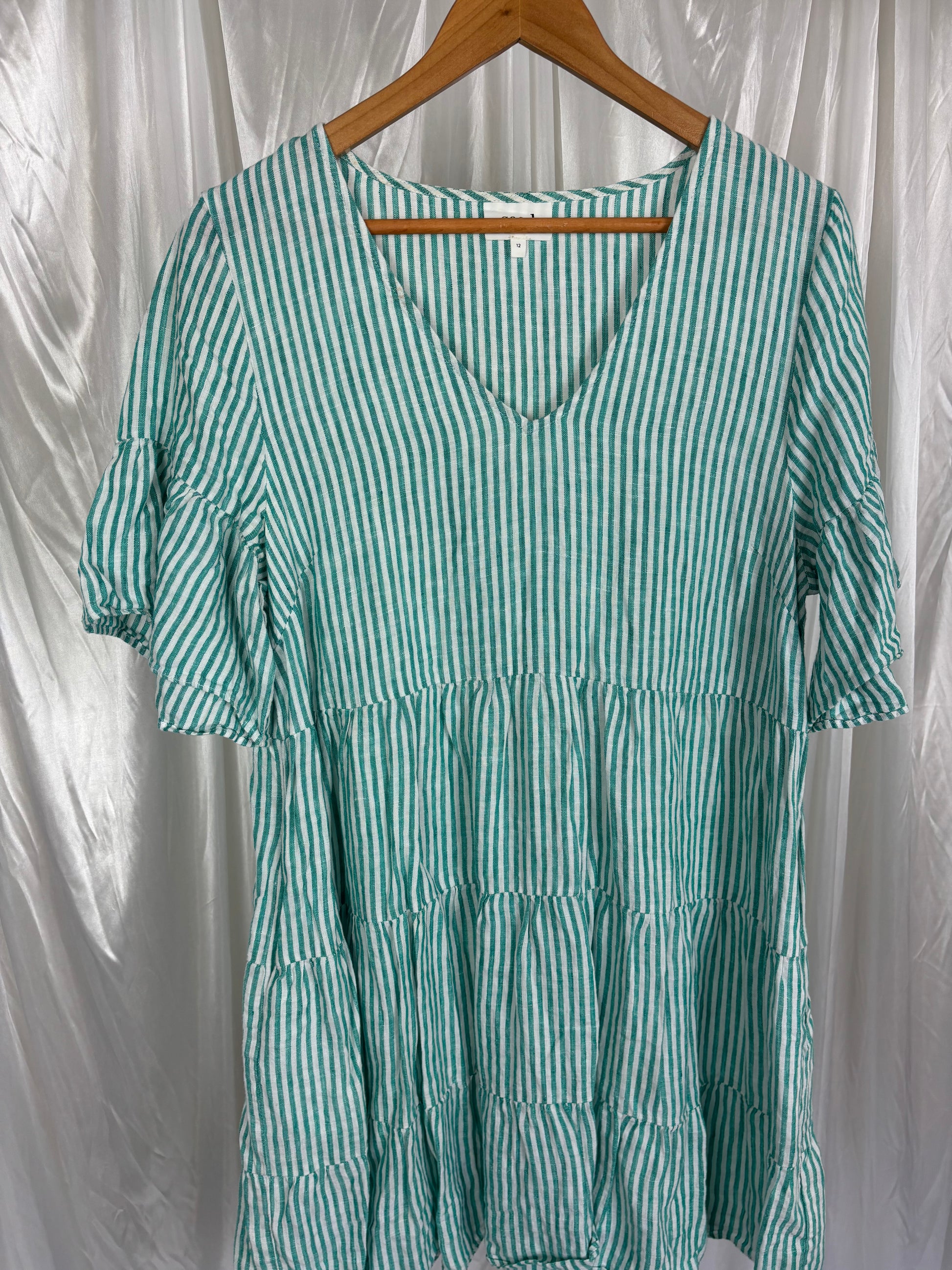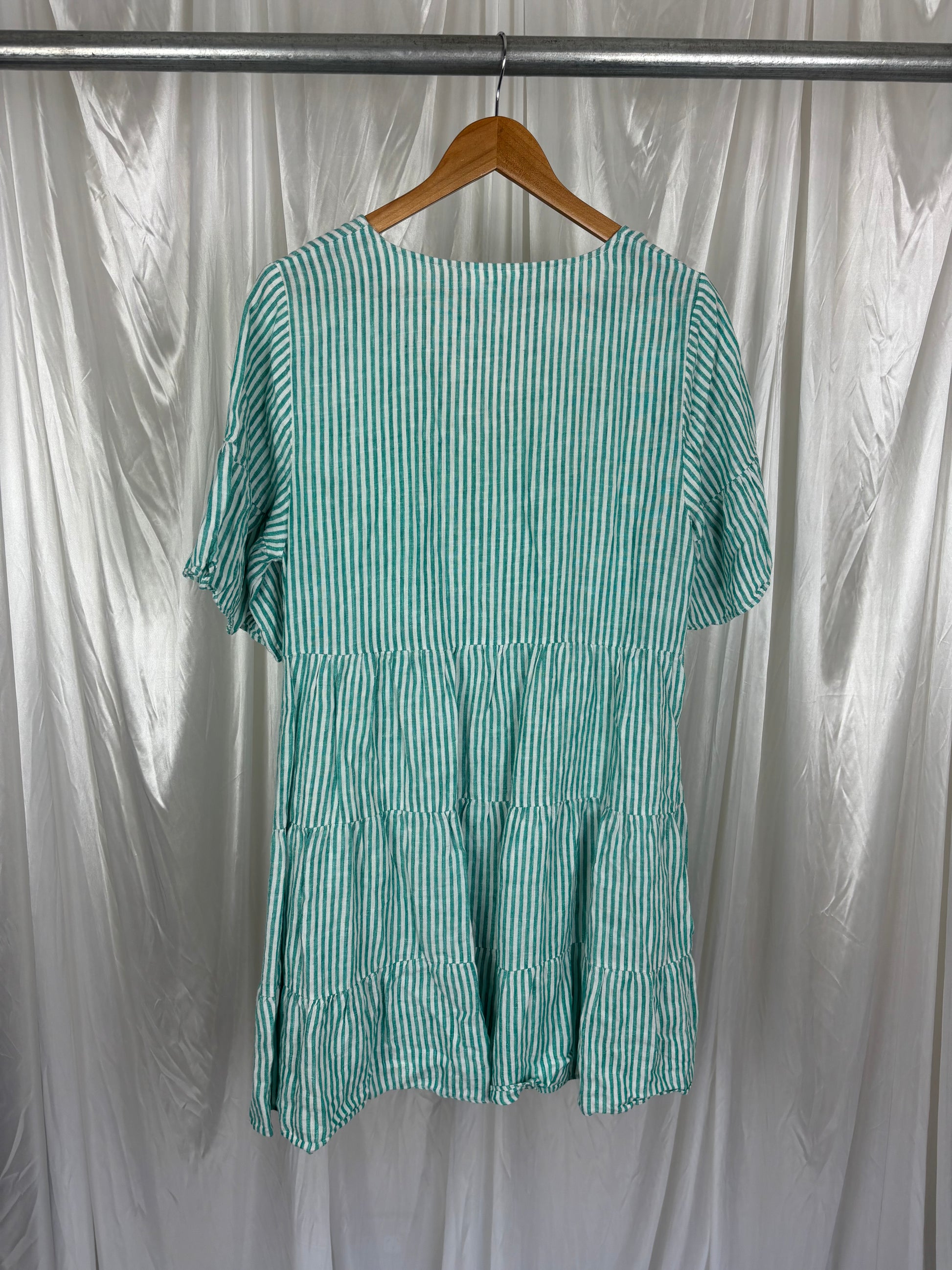Description - Green and white striped v neckline mini dress, 100% linen. This dress has a very small makeup mark on the neckline