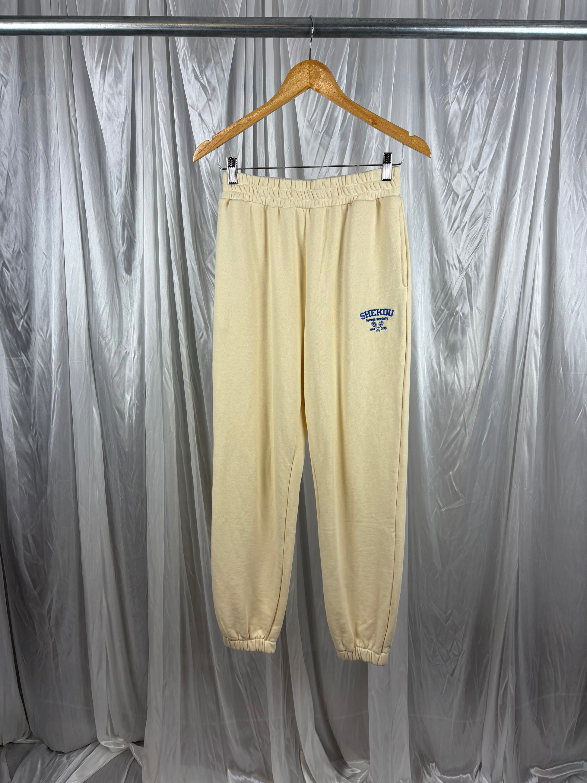 Description - Comfy pants with elasticated waist and cuffs, side pockets and blue embodied logo, 100% cotton. Good preloved condition