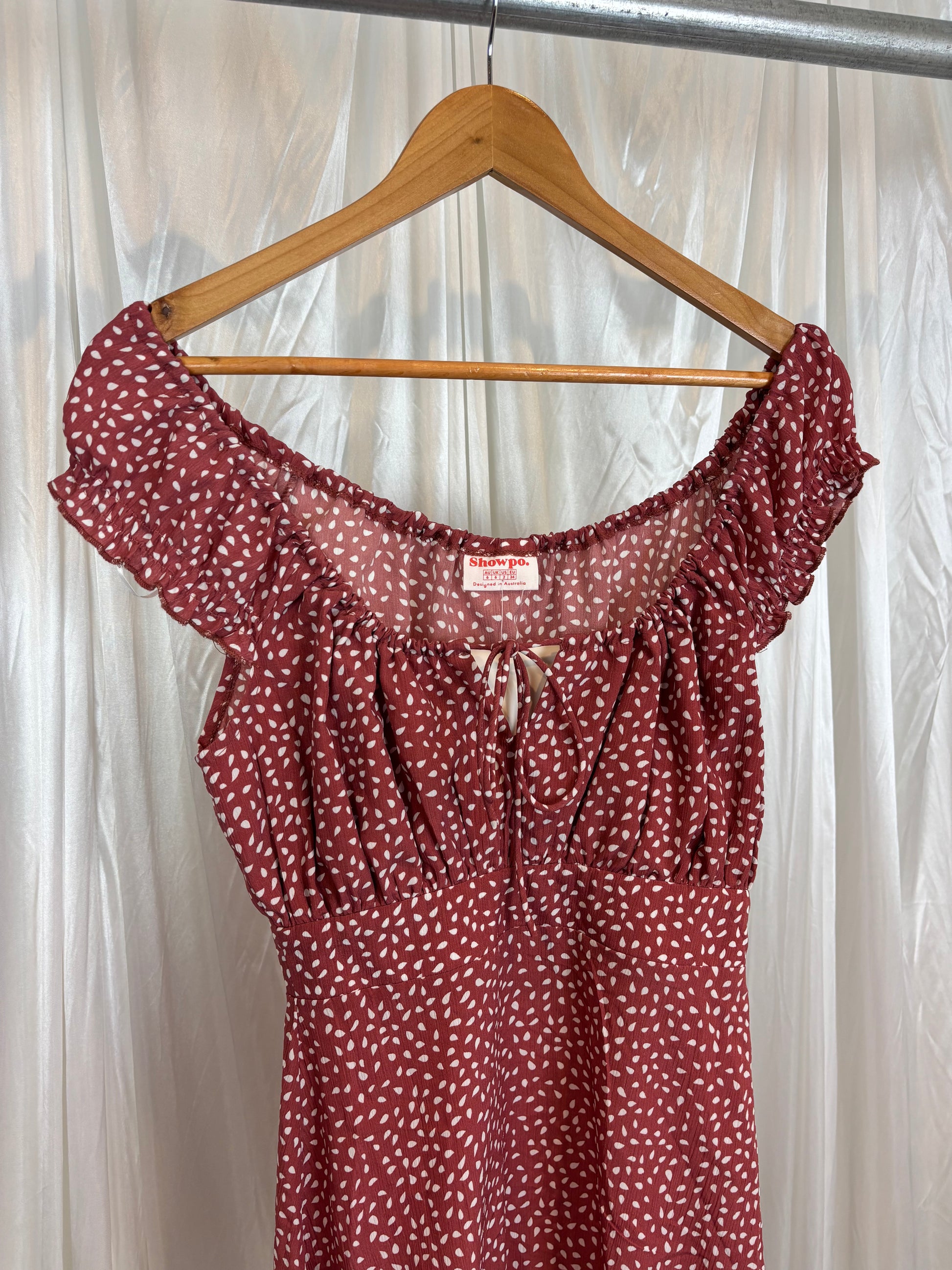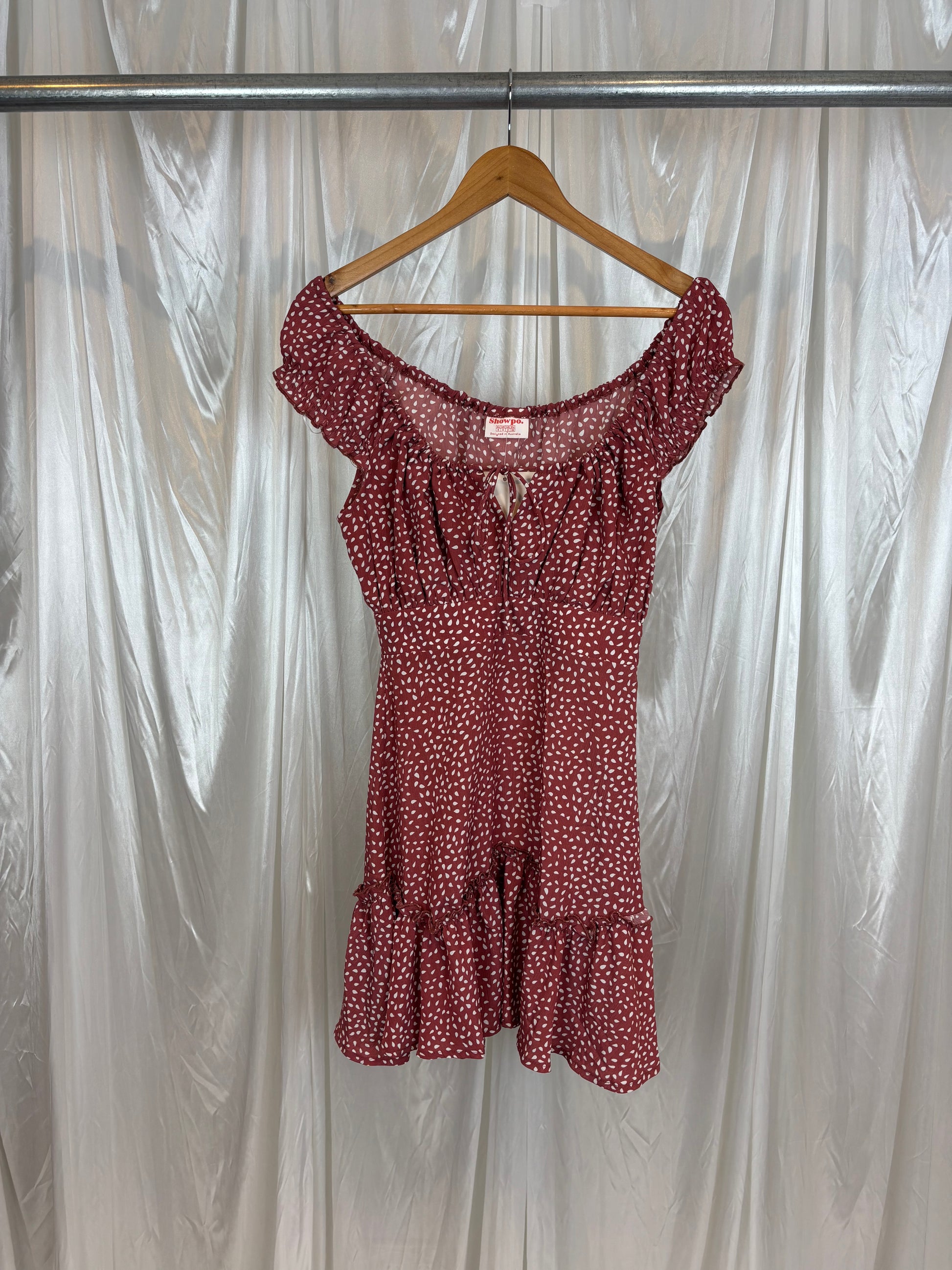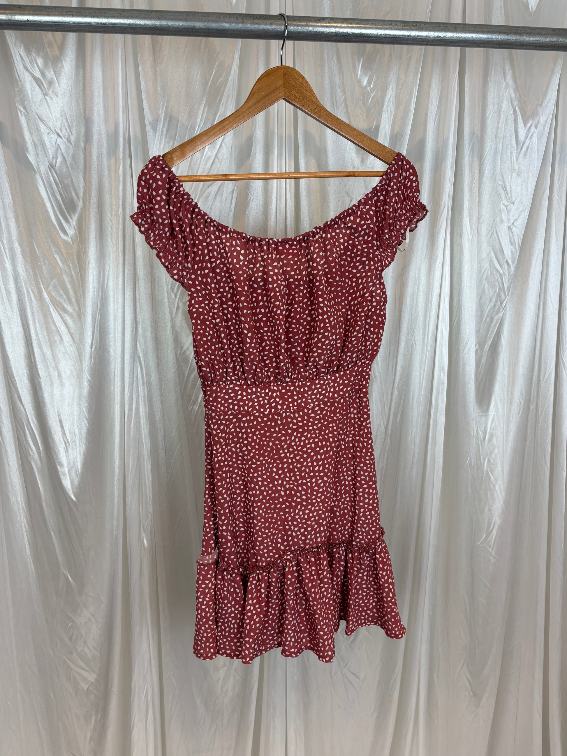 Description - Pink and white spotted mini dress with a ruffle hem and tie front detail, 100% polyester. brand new with tags!!