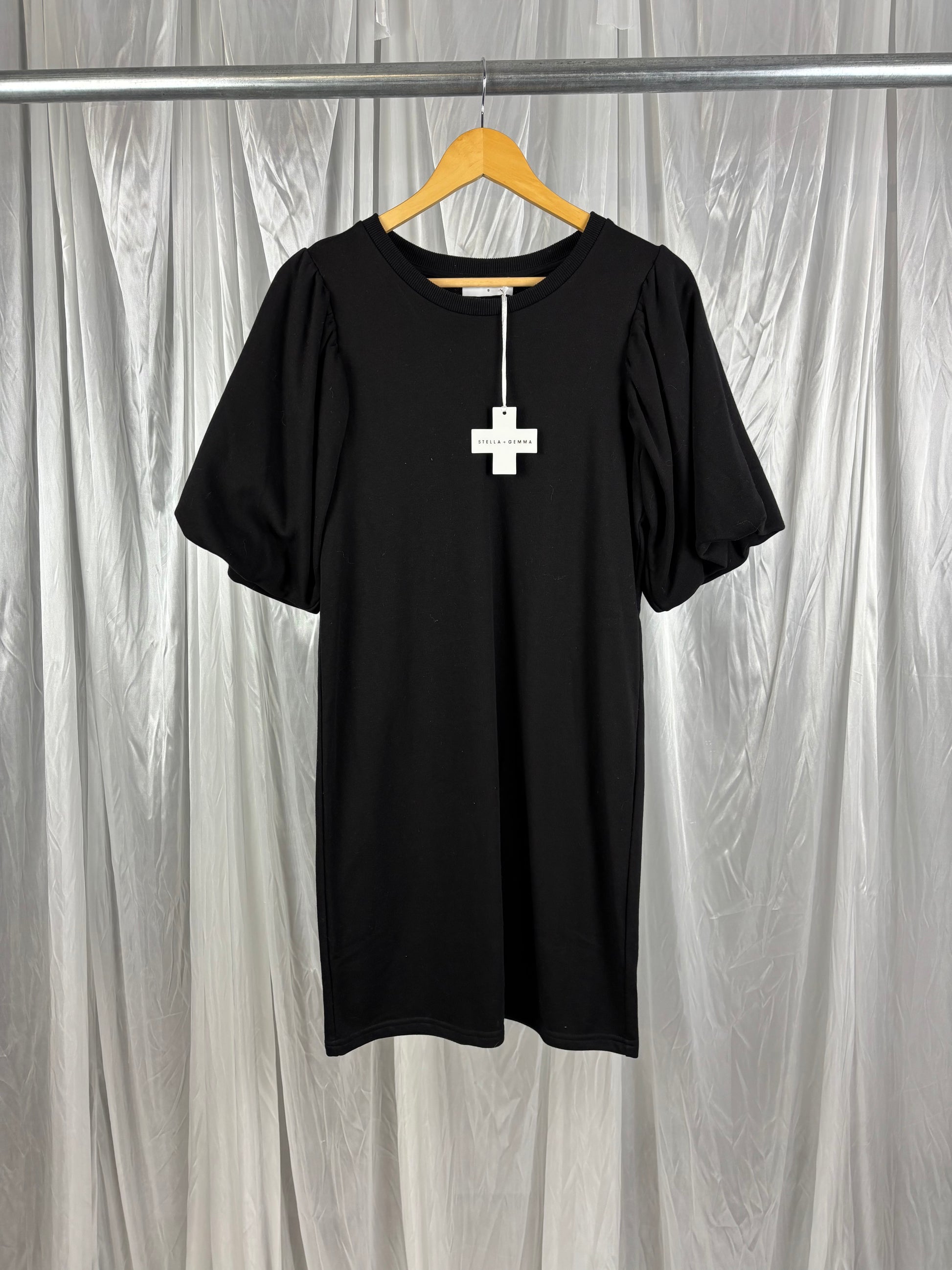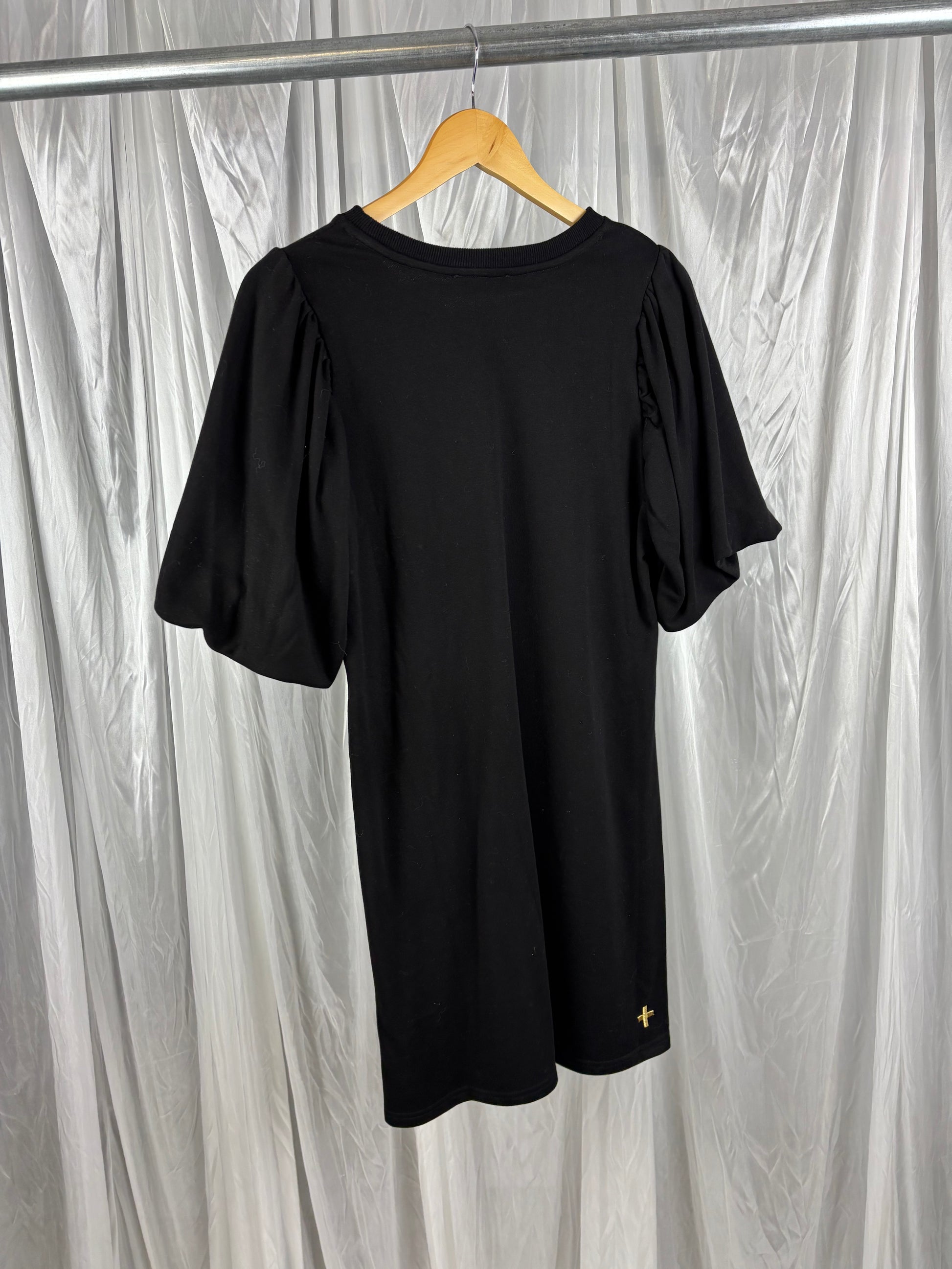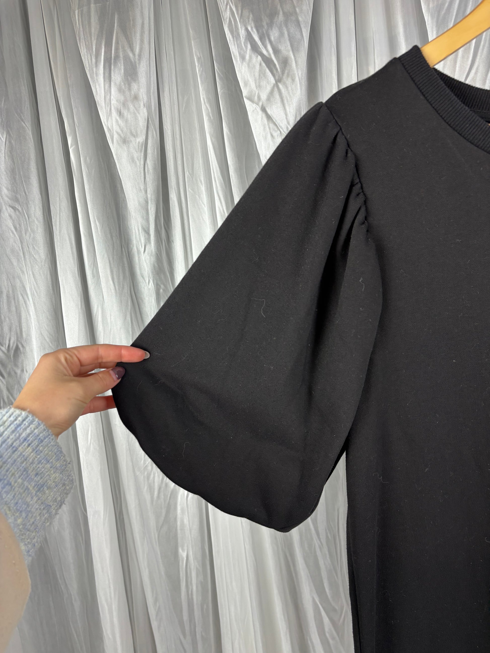 Description - Black puff shoulder mini dress, 90% cotton, 10% polyester. Brand new with tags