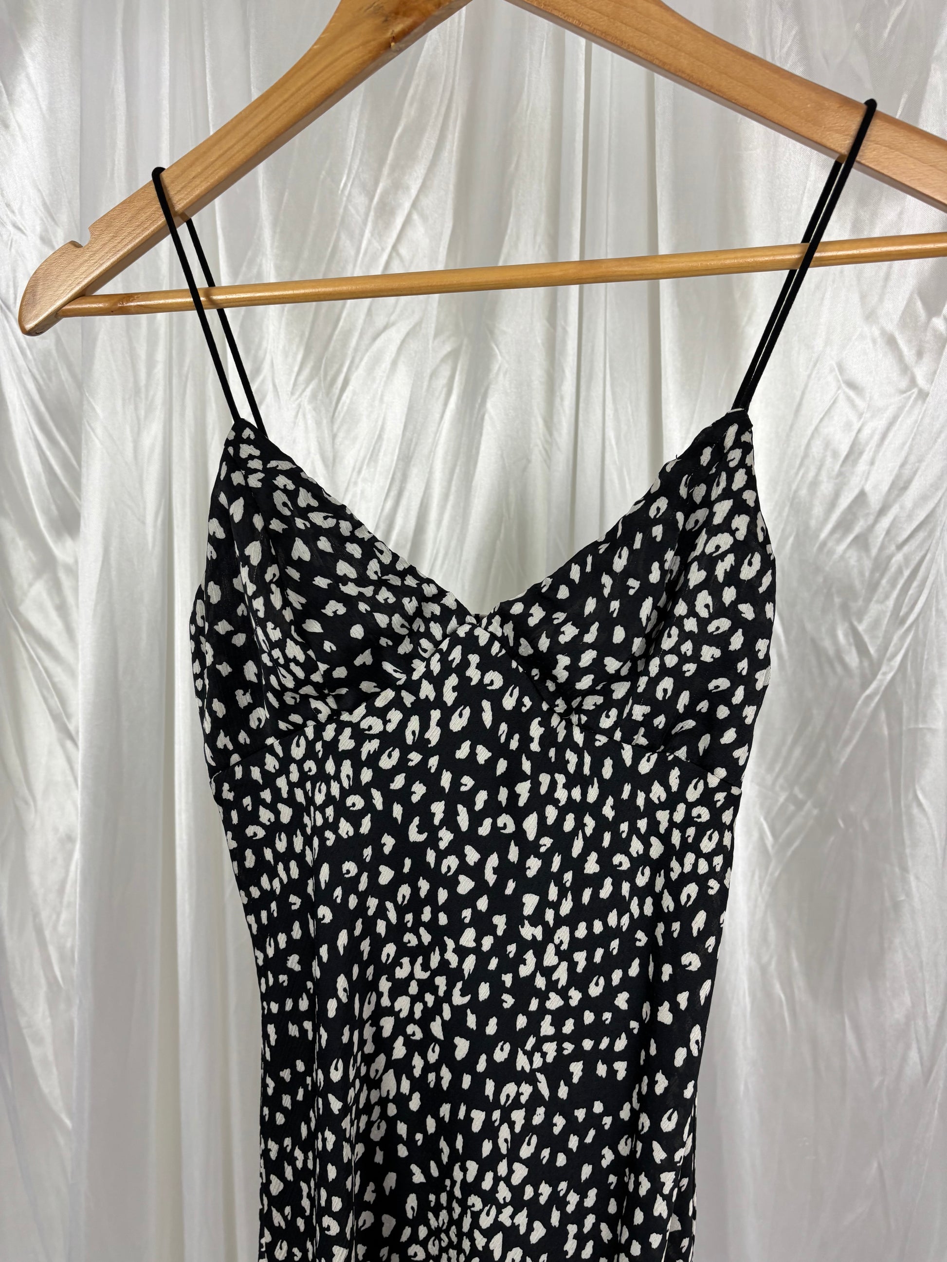 Description - Black & white patterned midi dress with thin straps and a slit at the side. There are a few light pulls in the material