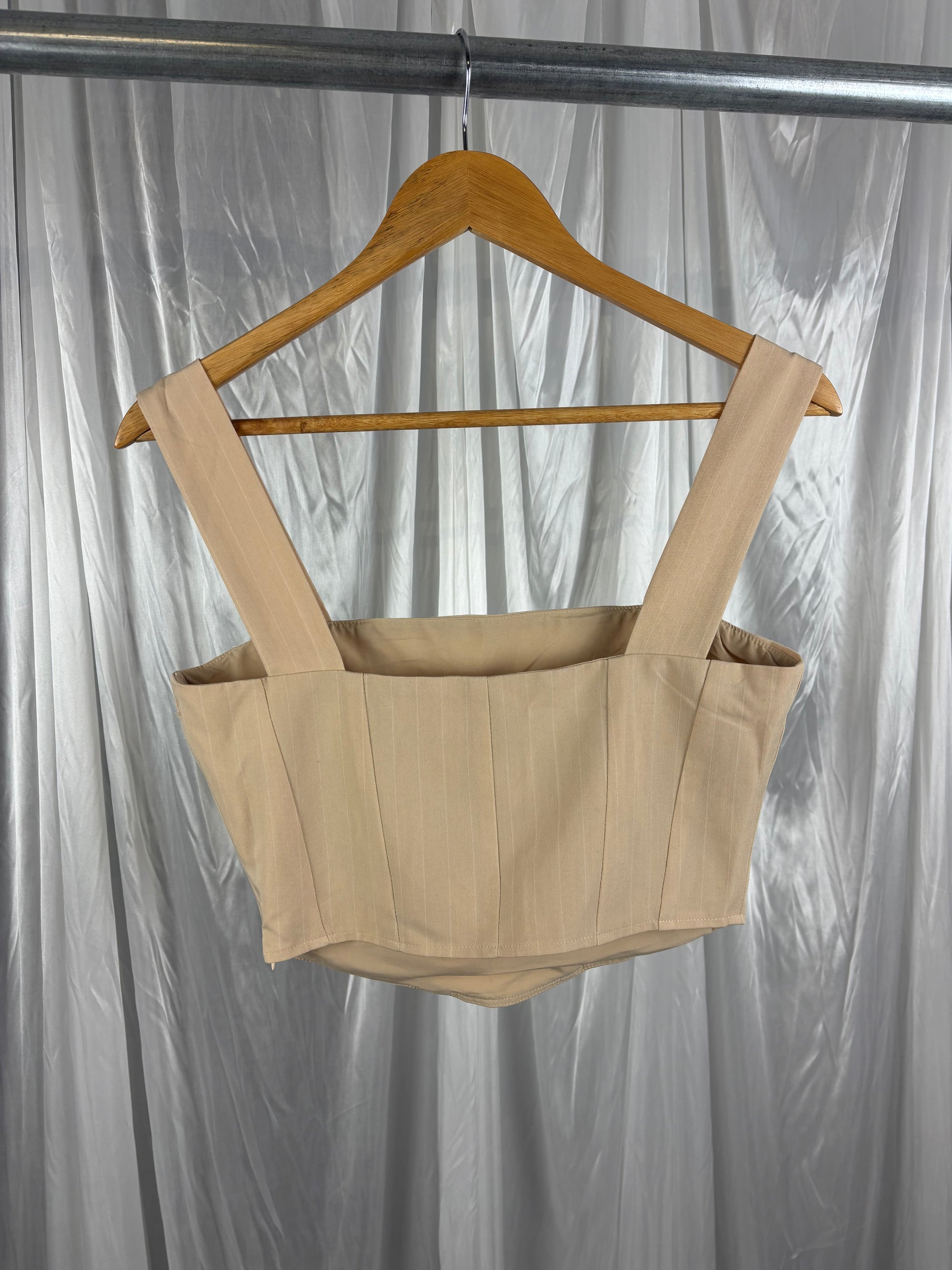 Description - Beige and white striped crop top with side zipper, 80% polyester, 16% rayon, 4% elastane