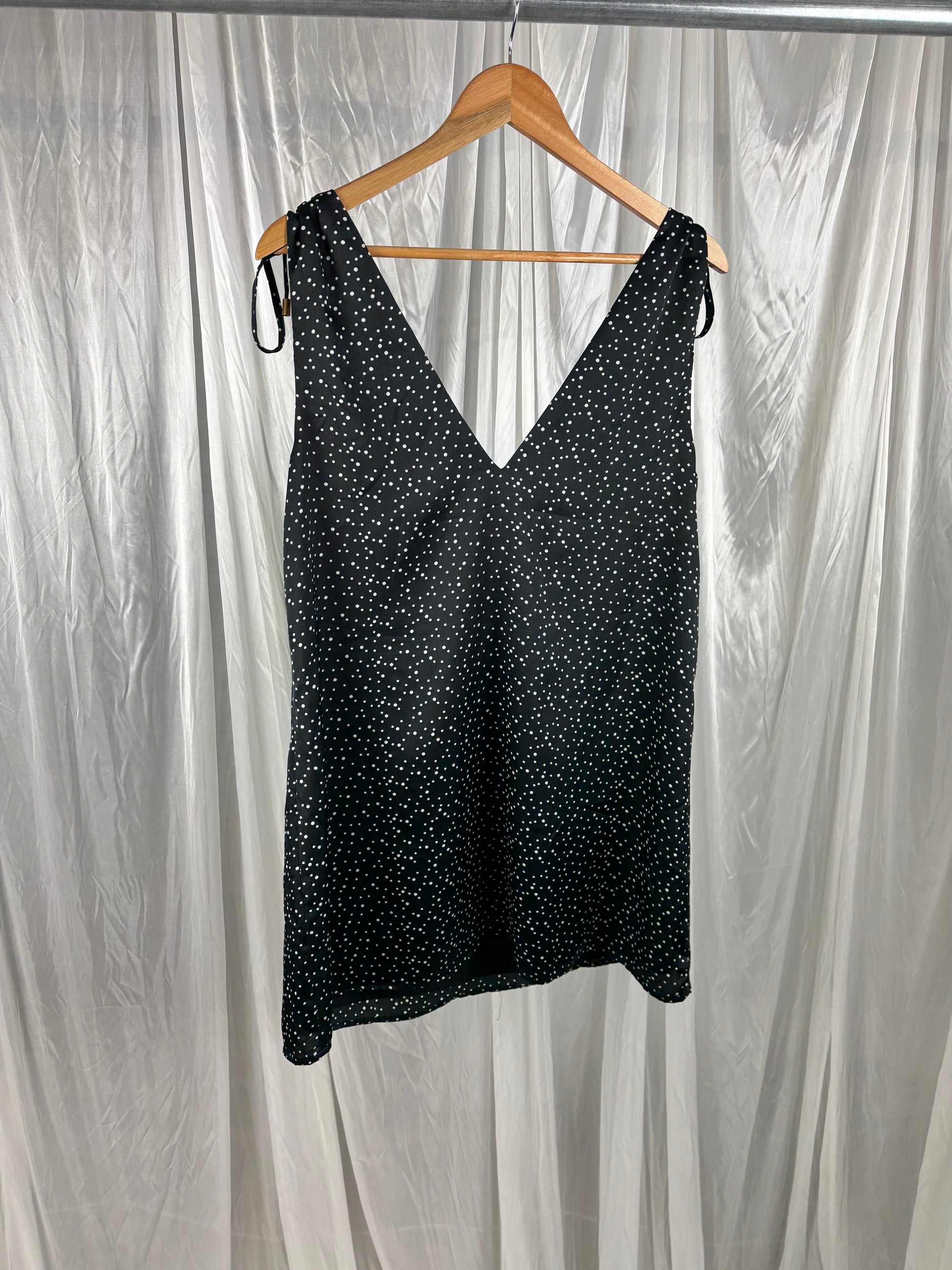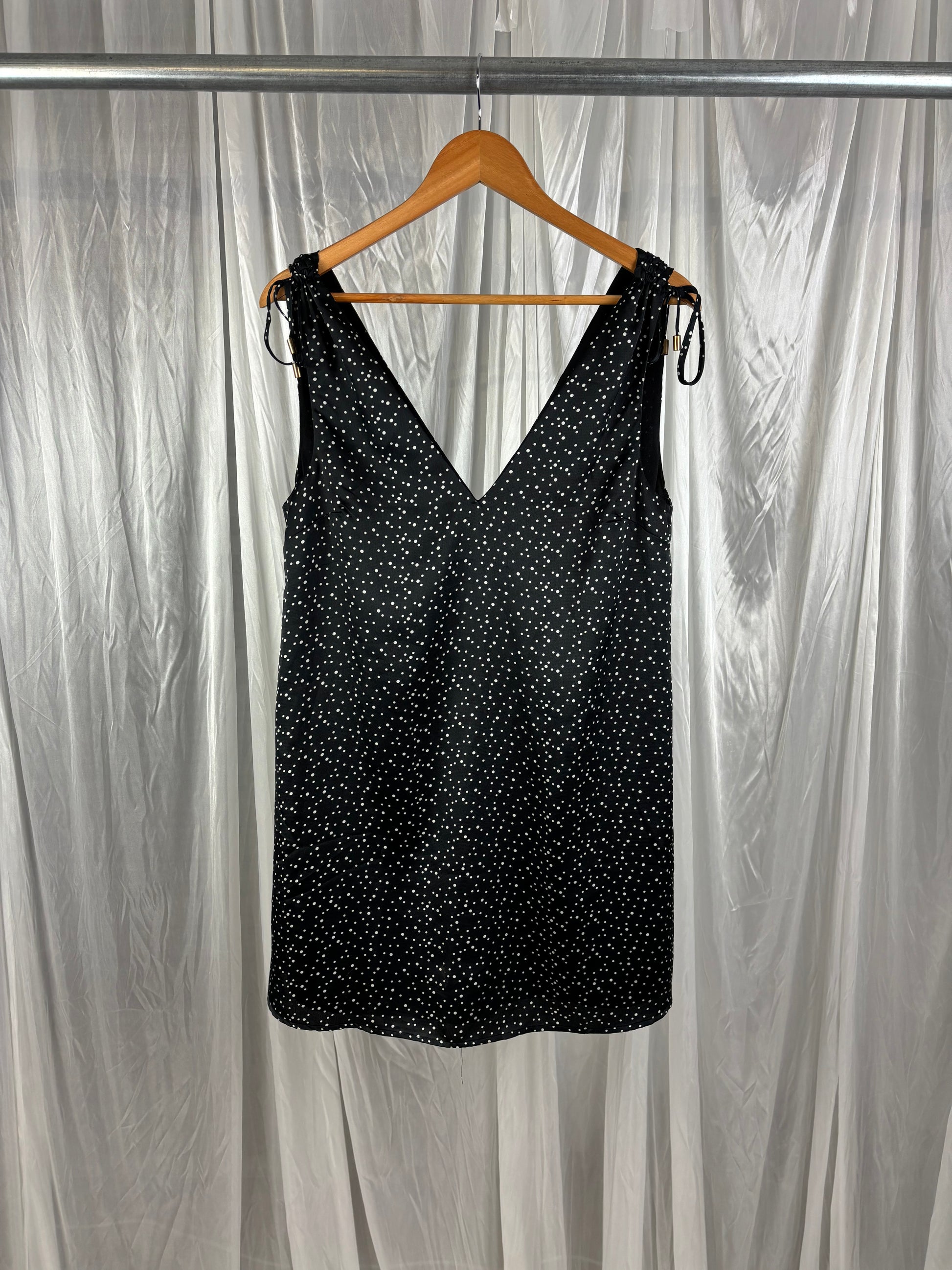 Description - Black and white polka dot pattern mini dress, beautiful satin material with a deep v-cut neckline and tie shoulder detail. Fully lined, 100% polyester