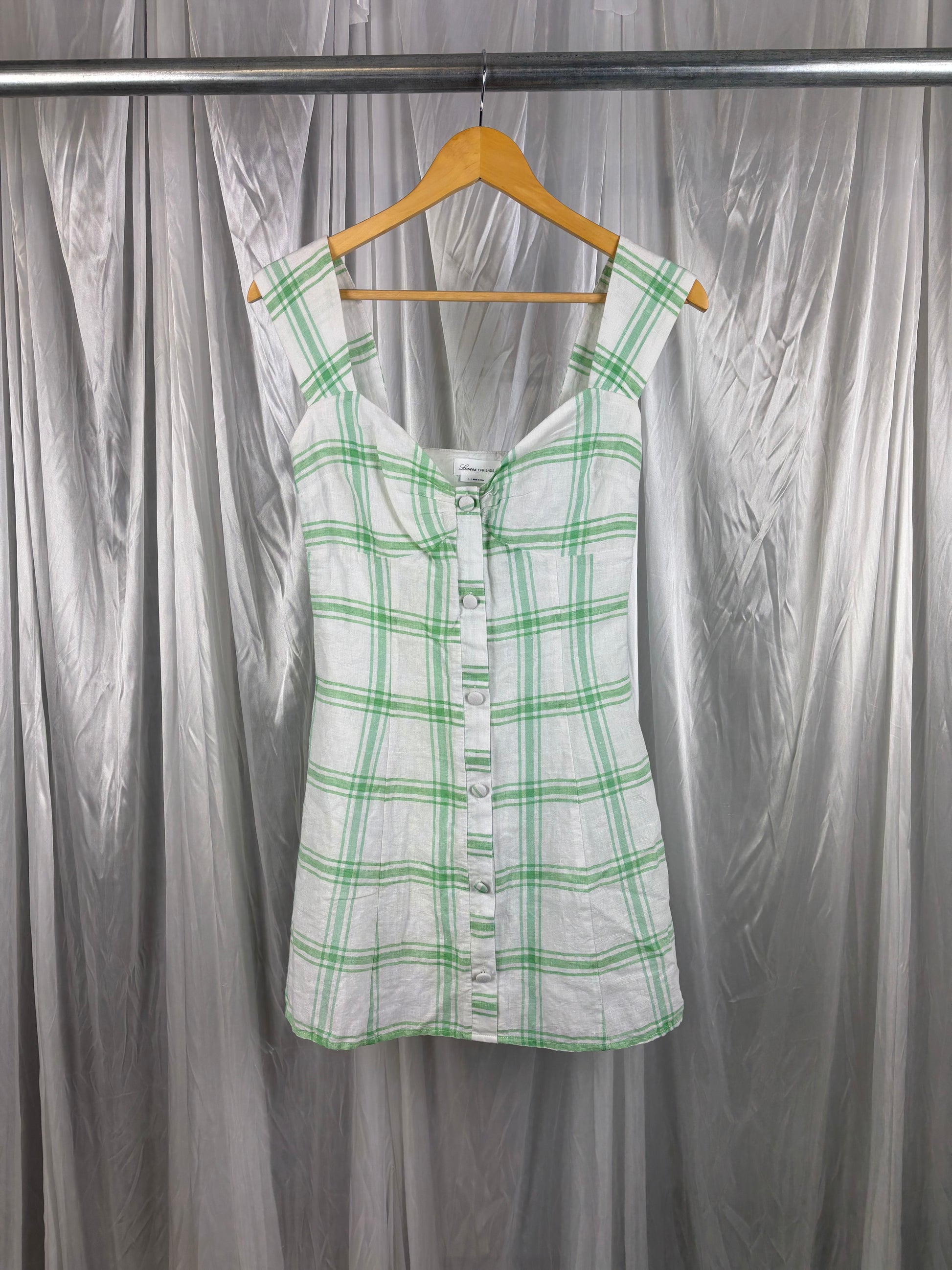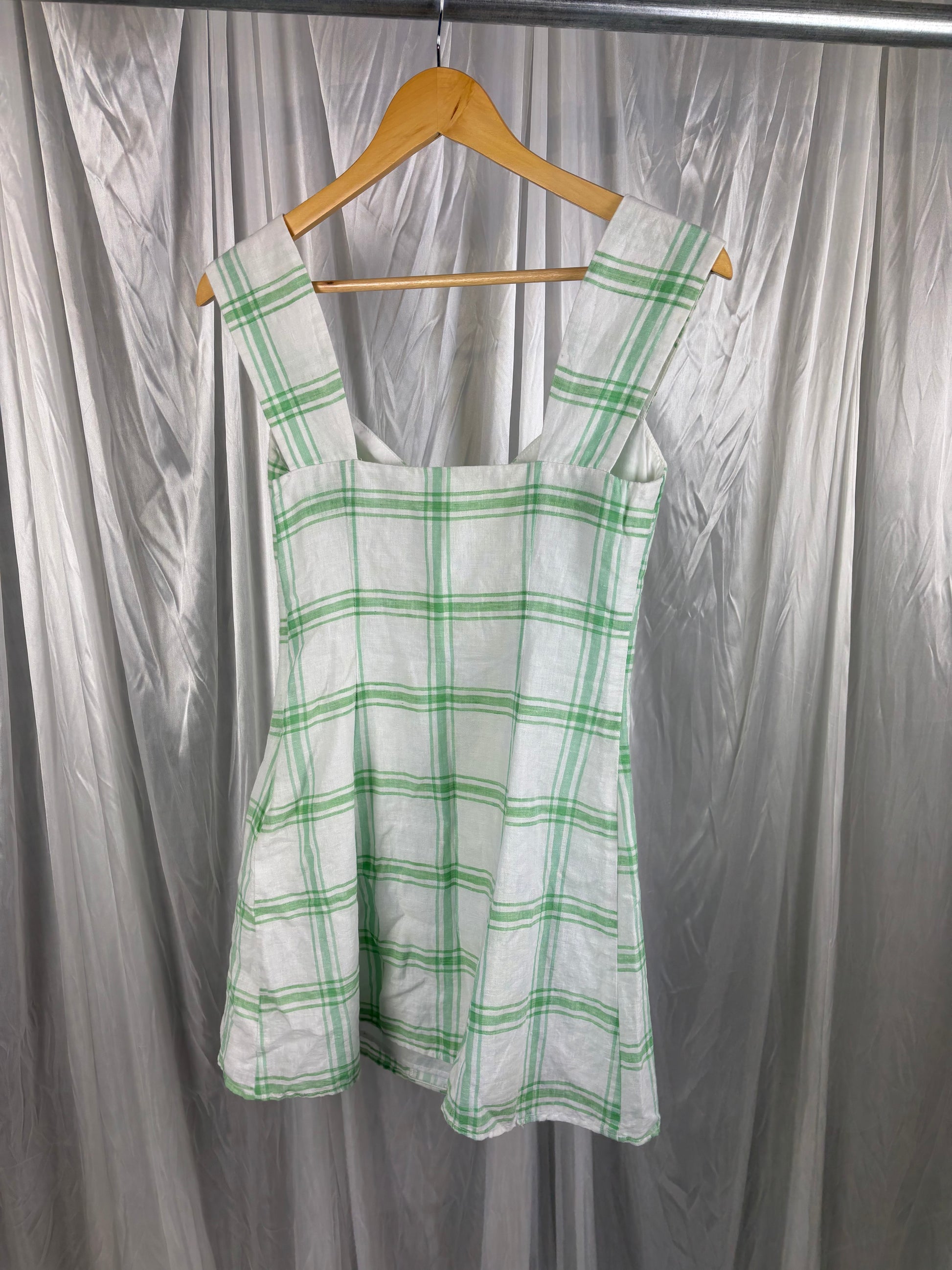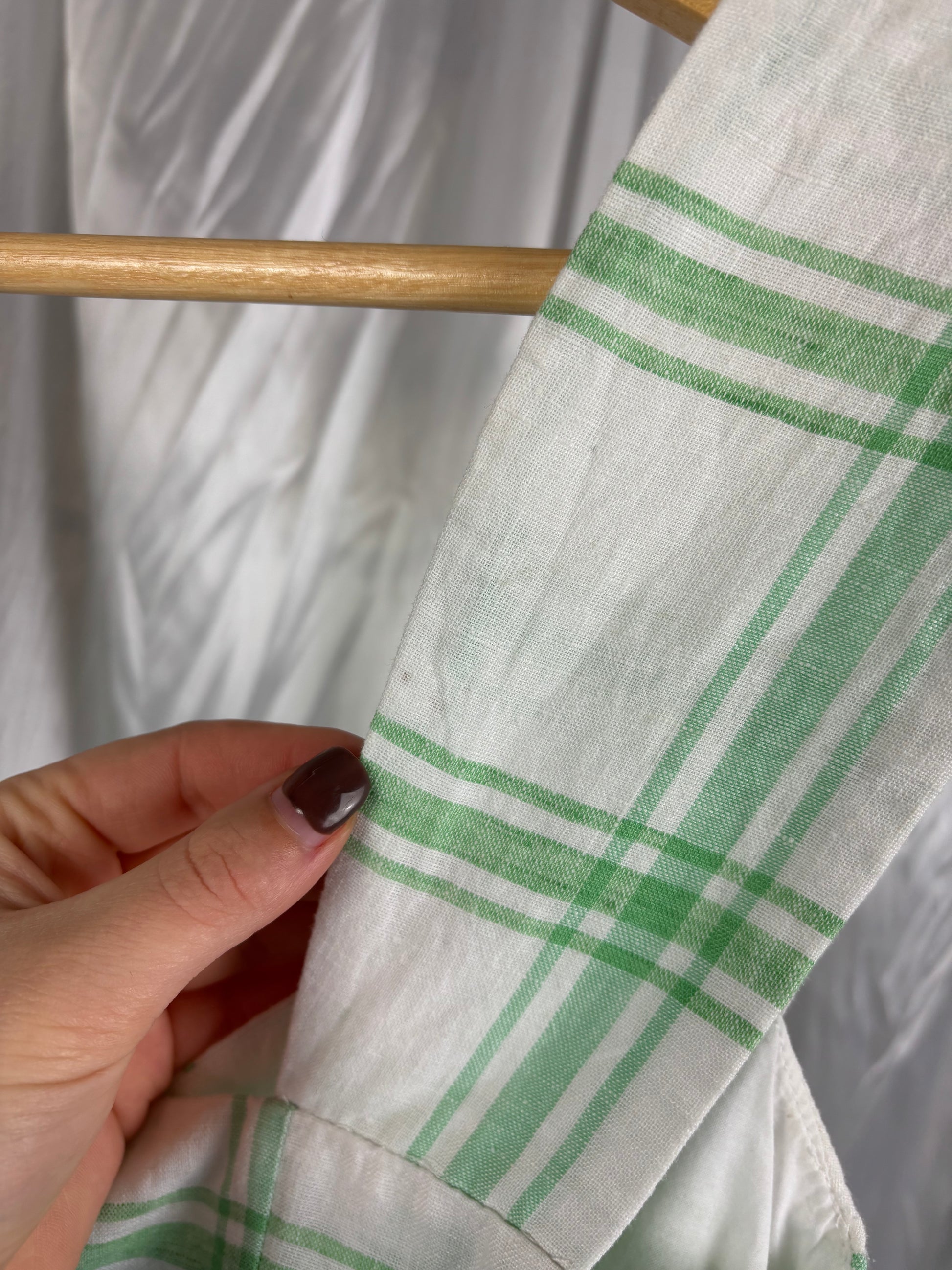 Description - Cute little green and white button front mini dress, 55% linen, 45% cotton. Has one tiny mark on the back of the sleeve