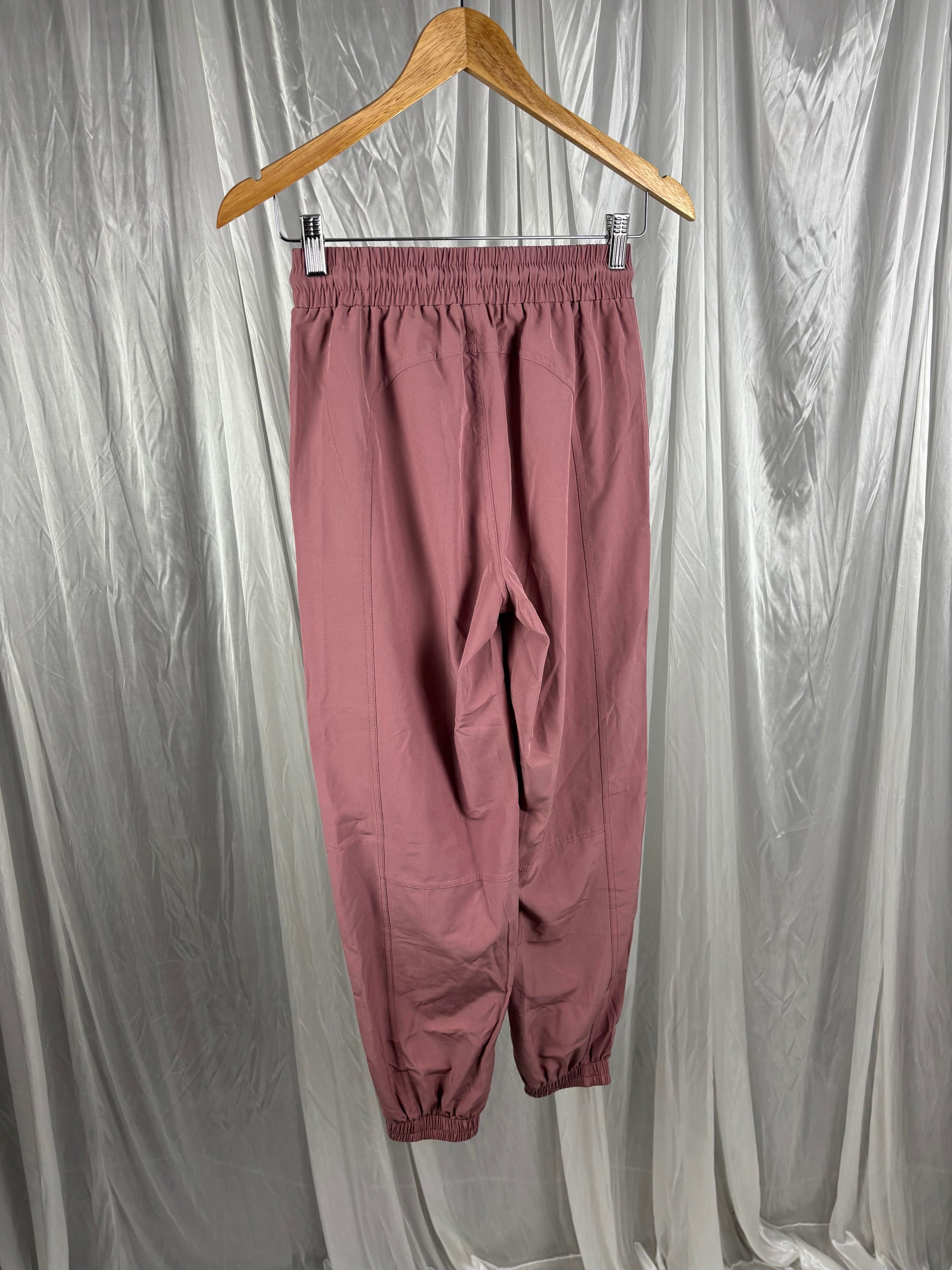 Description - Light weight pink pants with elasticated ankles and waist, 94% polyester, 6% elastane