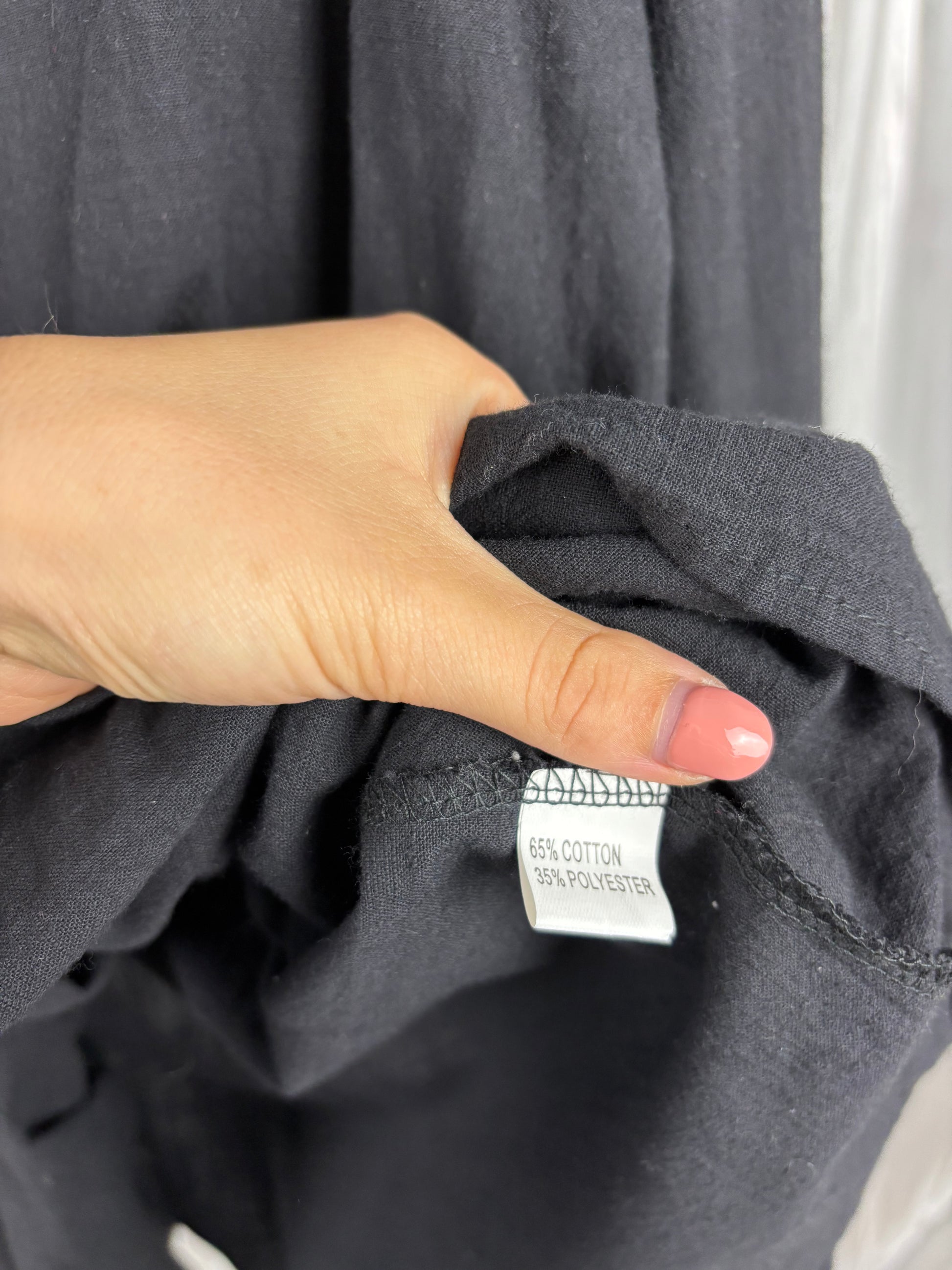 Description - Black long sleeve shirt style dress with wrap detail at the front, 65% cotton, 35% polyester. Brand new with tags