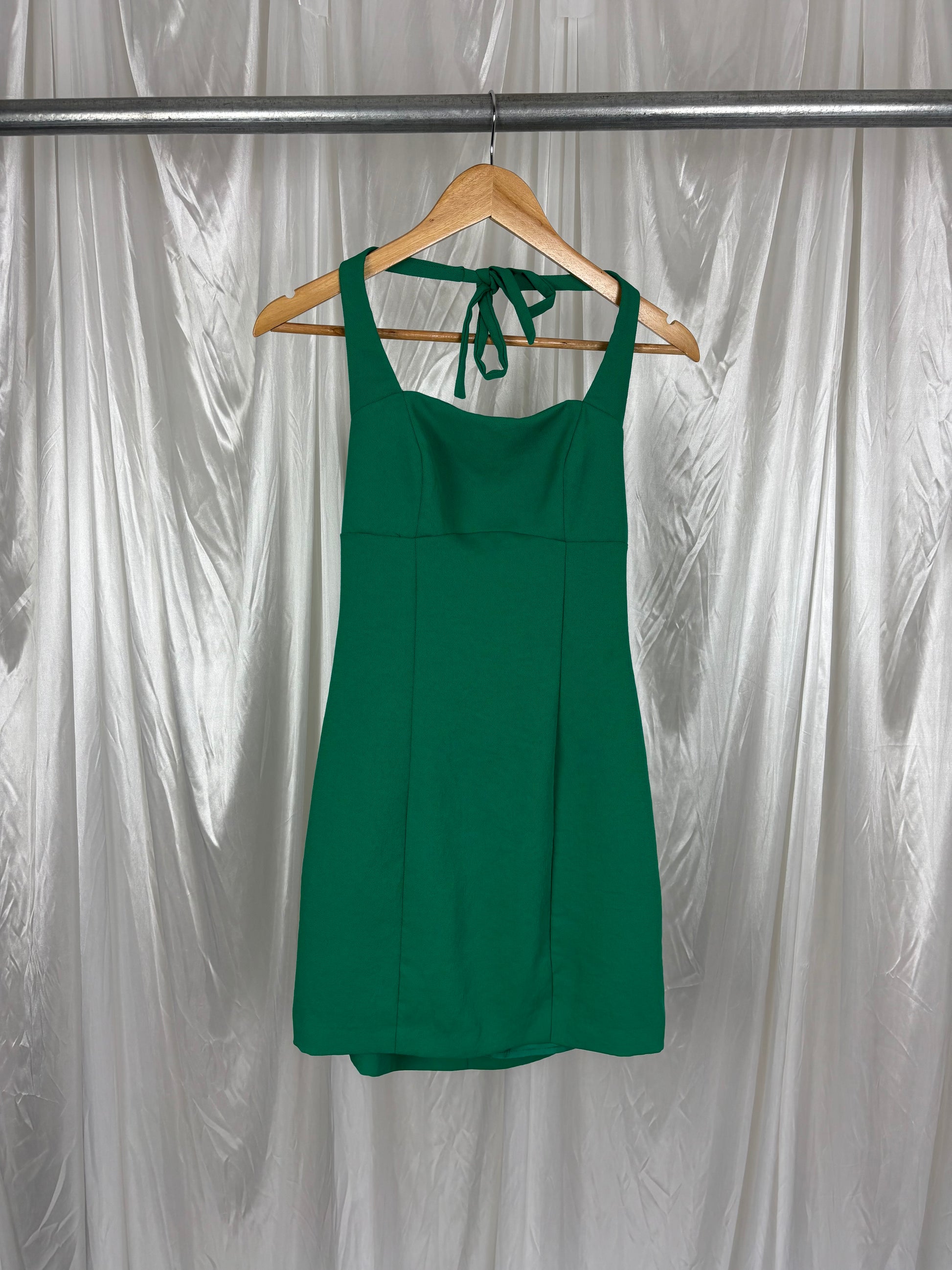 Description - Green halter neck style mini dress with an open back, 100% polyester