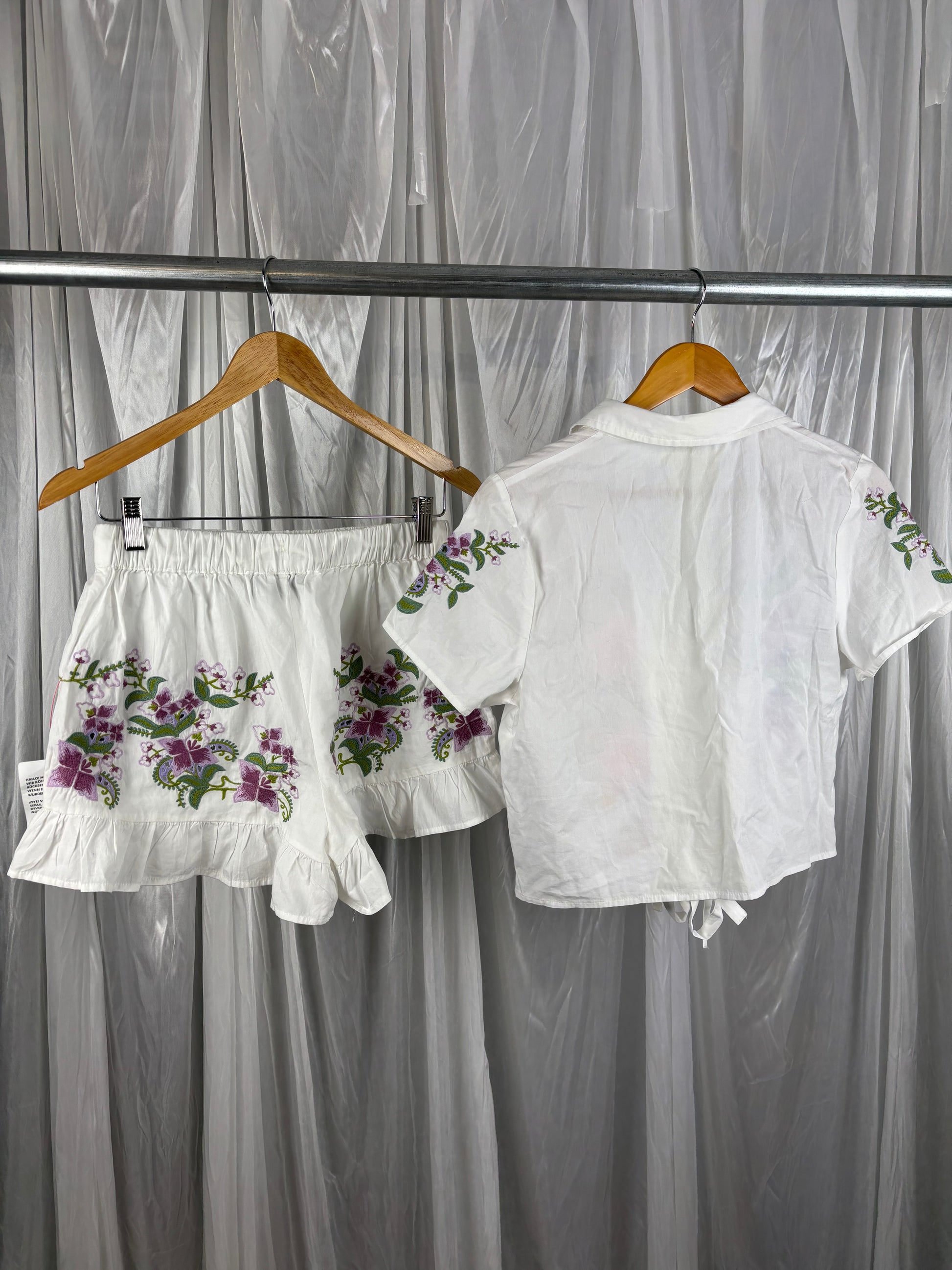 Description - White matching set with colorful embroidery, the shirt is slightly cropped and has lovely bow tie front details whilst the shorts have a ruffle hem and an elasticated drawstring waist, shell 100% cotton, embroidery 100% polyester. Shorts are new with tags whilst the shirt has some faint makeup marking on the inner chest area.